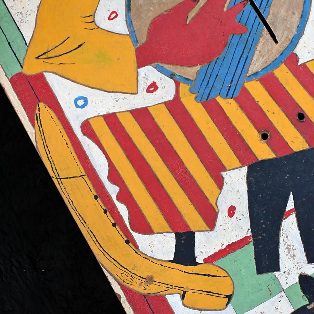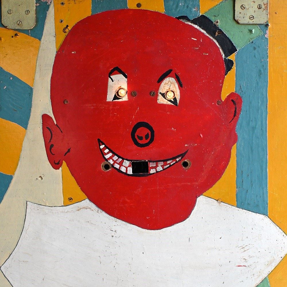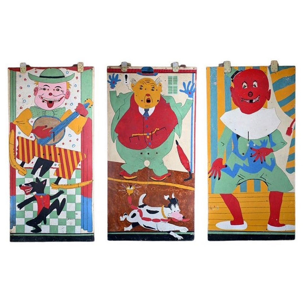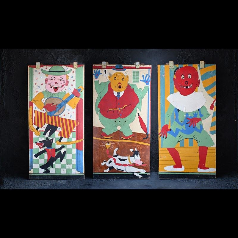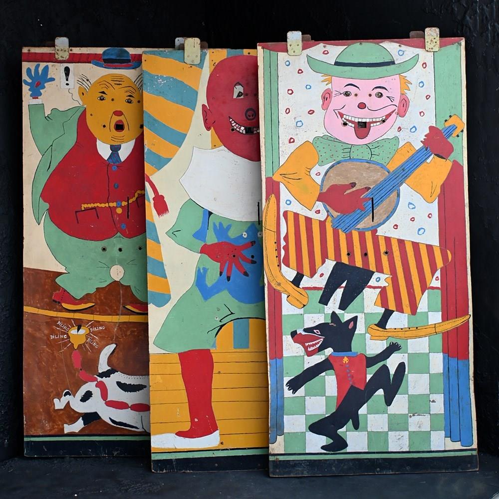 Now this is cool fairground folk art in our humble opinion. All three wooden board panels are hand painted in oil paint with colourful and highly quirky graphic illustrations. Our favourite is the red-faced clown holding a blue frog in his hand. There is sometime quite artistic in the style of pop art and art brut to these items and they would likely have been part of a larger collection at some point to decorate a fairground attraction of sorts. The eyes light up with recently added modern day small battery boxes attached to rear, which can be turned on by a switch. The backs have small wooden poles (detached) so they can stand upright freely however we feel these would look great mounted on a wall in situ.