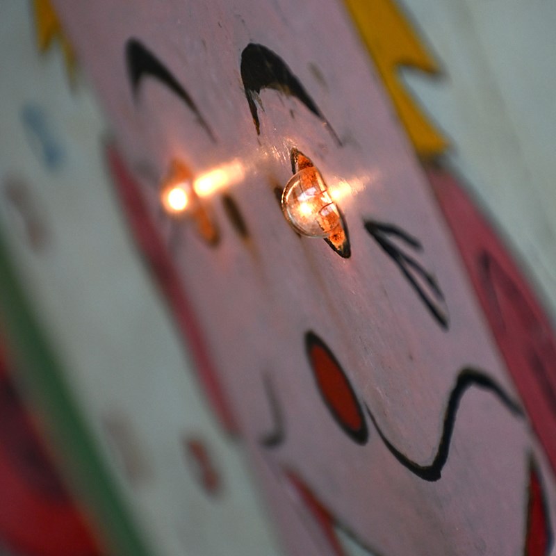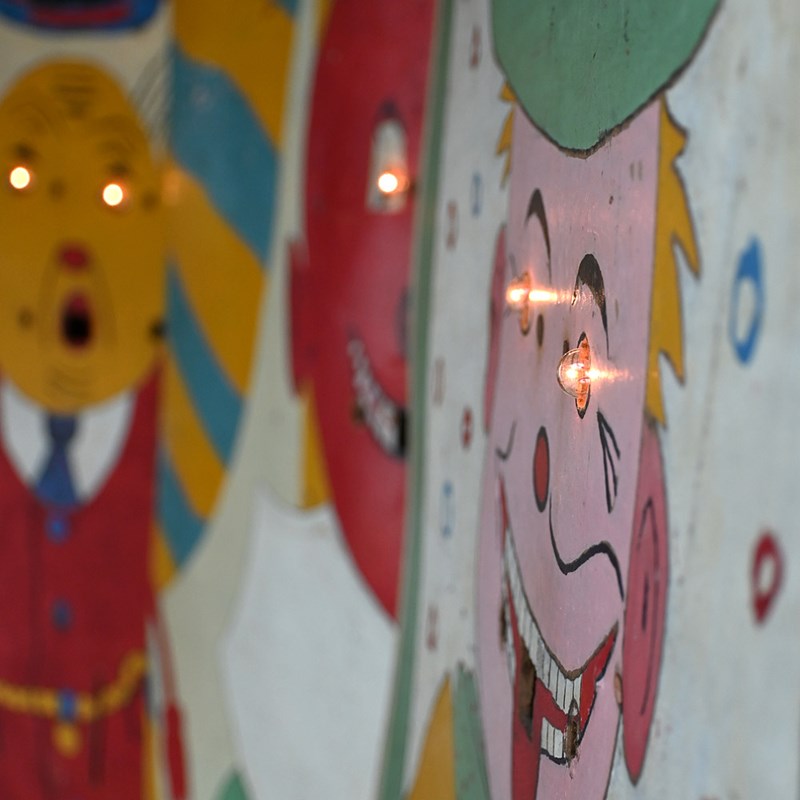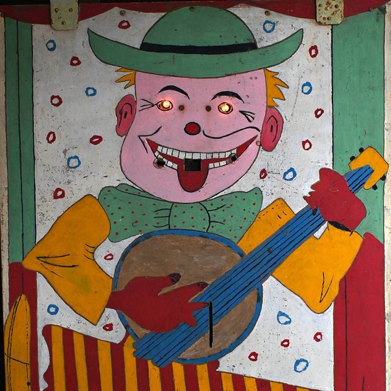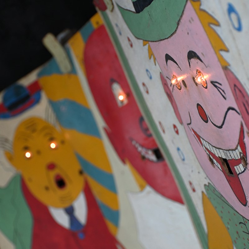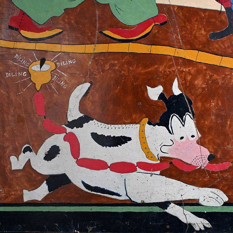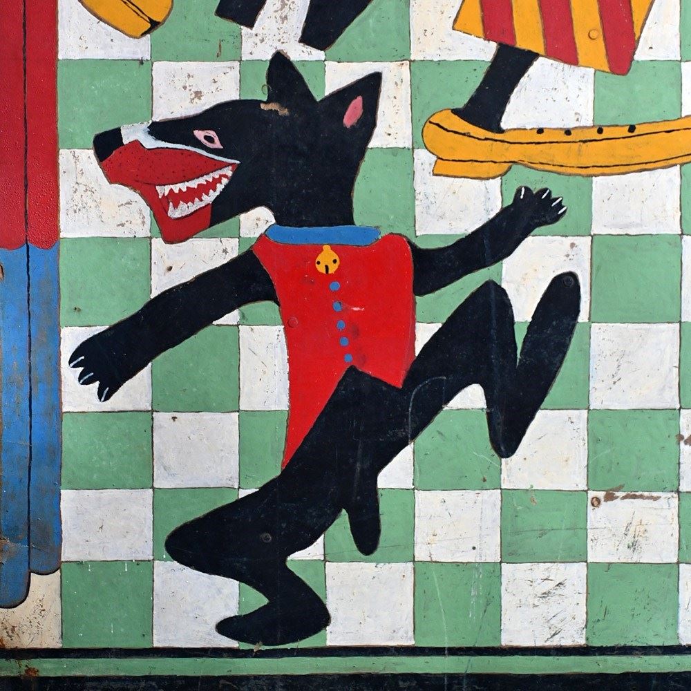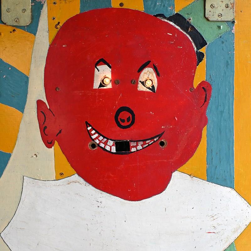 Now this is cool fairground folk art in our humble opinion. All three wooden board panels are hand painted in oil paint with colourful and highly quirky graphic illustrations. Our favourite is the red-faced clown holding a blue frog in his hand. There is sometime quite artistic in the style of pop art and art brut to these items and they would likely have been part of a larger collection at some point to decorate a fairground attraction of sorts. The eyes light up with recently added modern day small battery boxes attached to rear, which can be turned on by a switch. The backs have small wooden poles (detached) so they can stand upright freely however we feel these would look great mounted on a wall in situ.