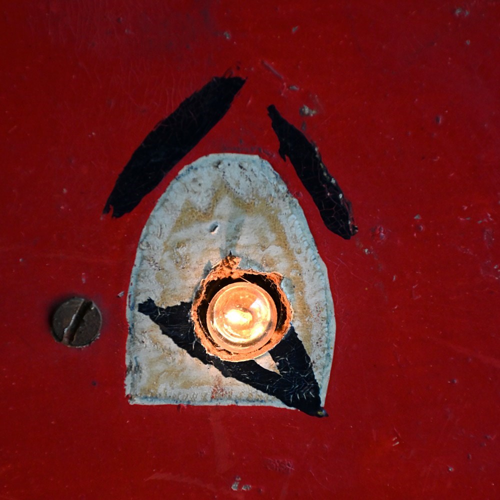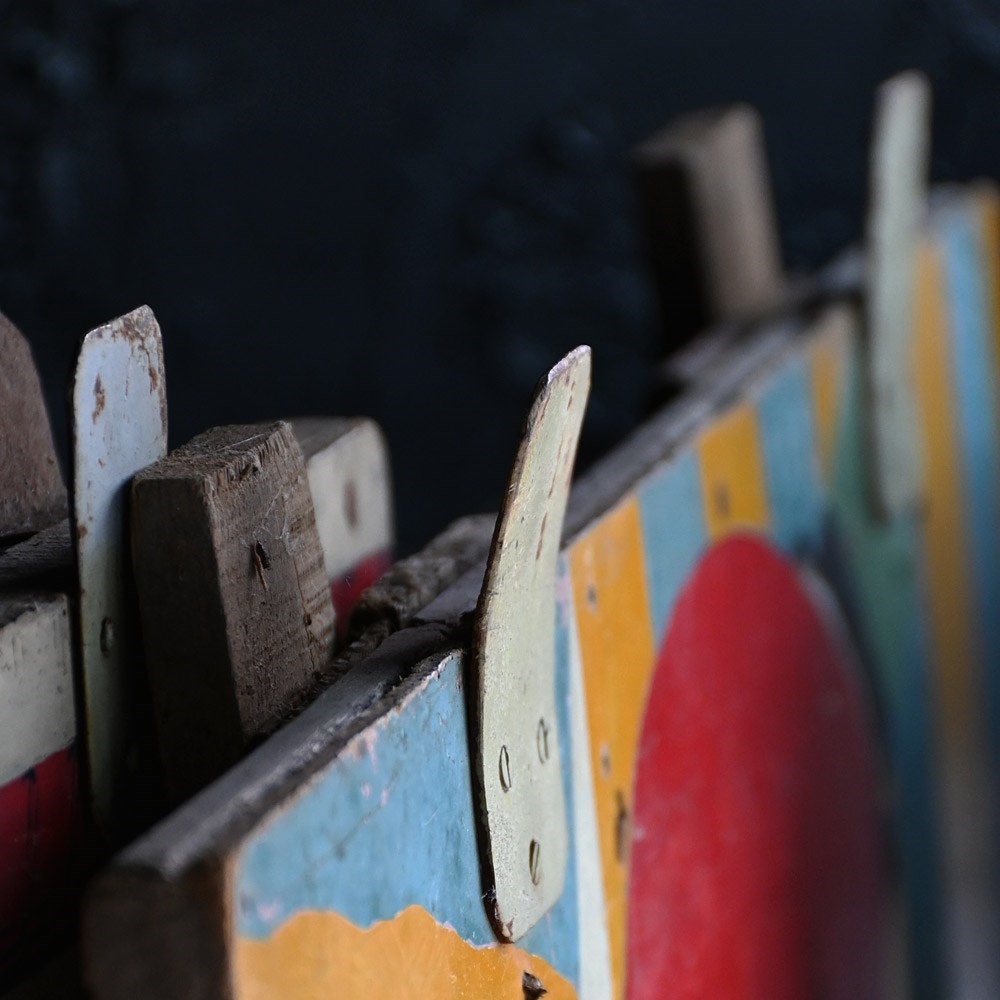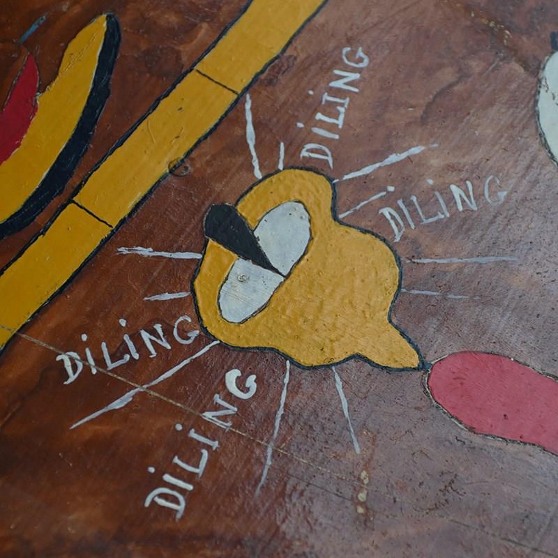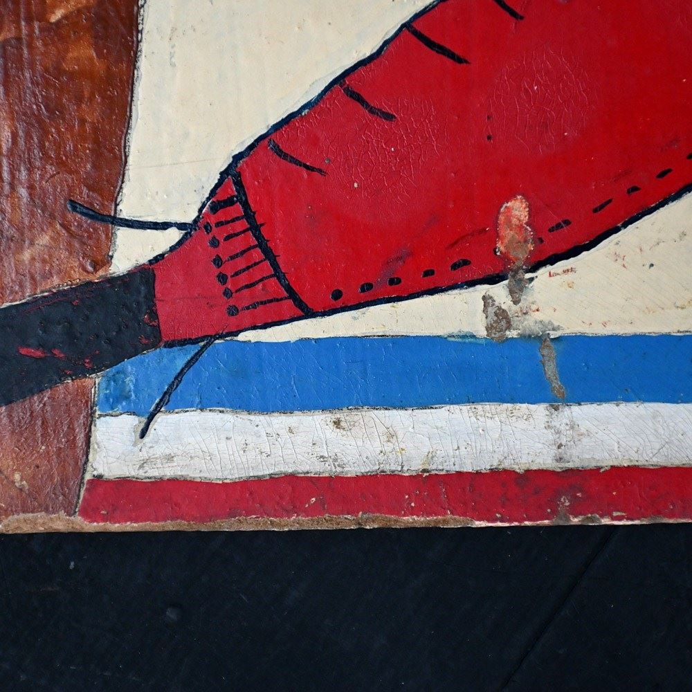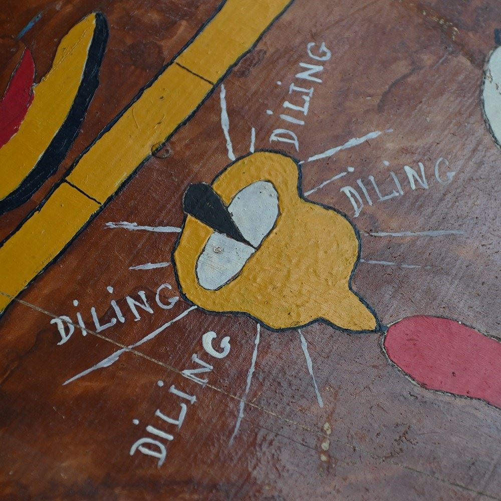 Now this is cool fairground folk art in our humble opinion. All three wooden board panels are hand painted in oil paint with colourful and highly quirky graphic illustrations. Our favourite is the red-faced clown holding a blue frog in his hand. There is sometime quite artistic in the style of pop art and art brut to these items and they would likely have been part of a larger collection at some point to decorate a fairground attraction of sorts. The eyes light up with recently added modern day small battery boxes attached to rear, which can be turned on by a switch. The backs have small wooden poles (detached) so they can stand upright freely however we feel these would look great mounted on a wall in situ.
