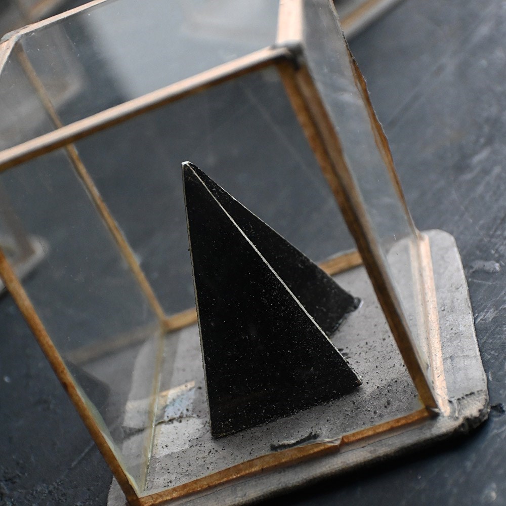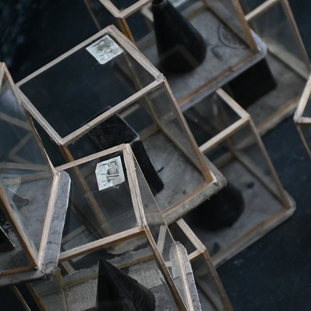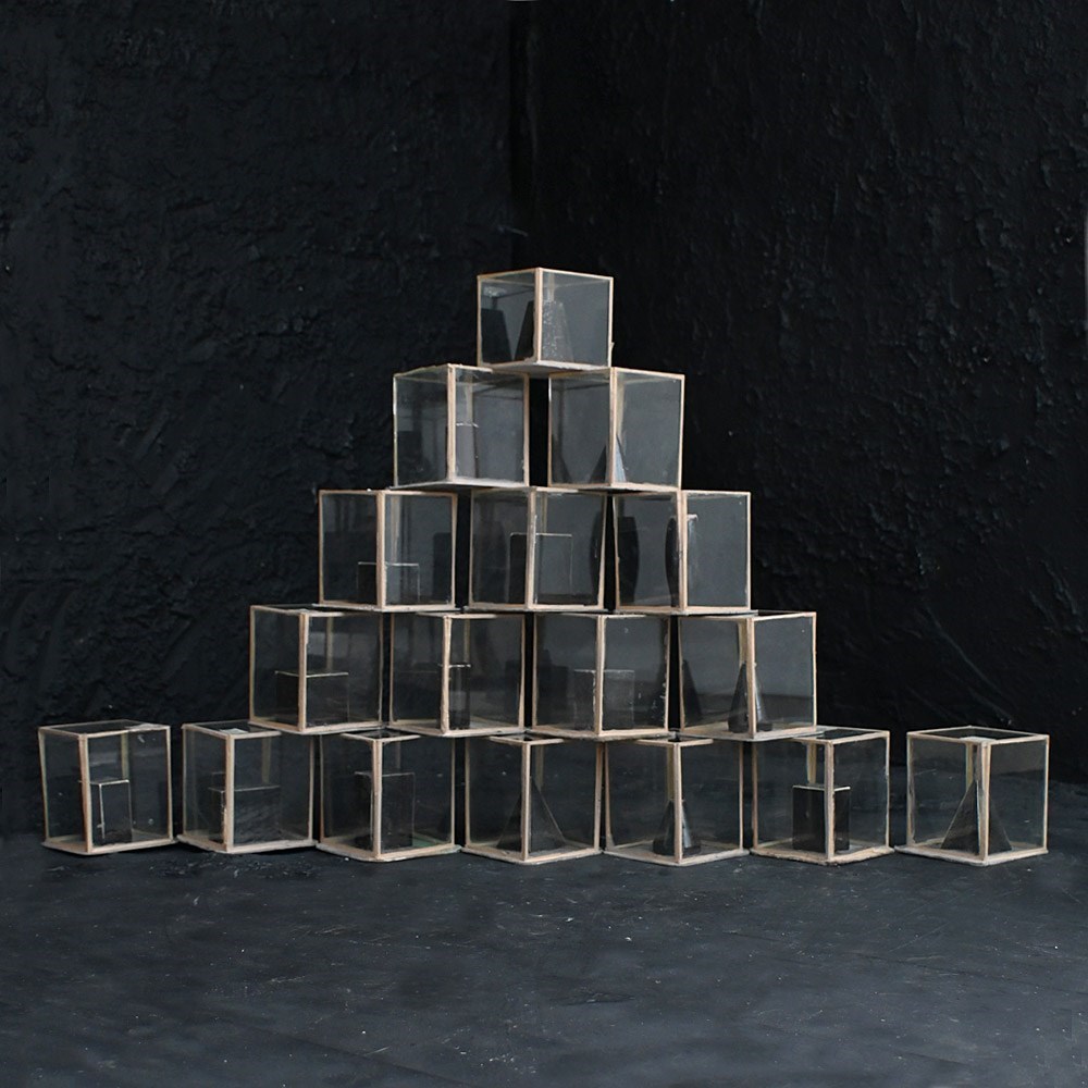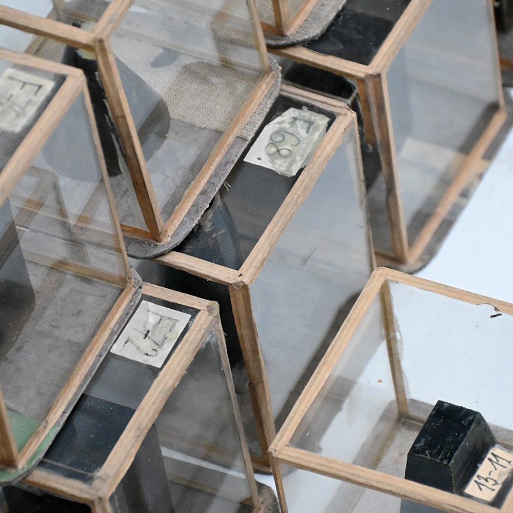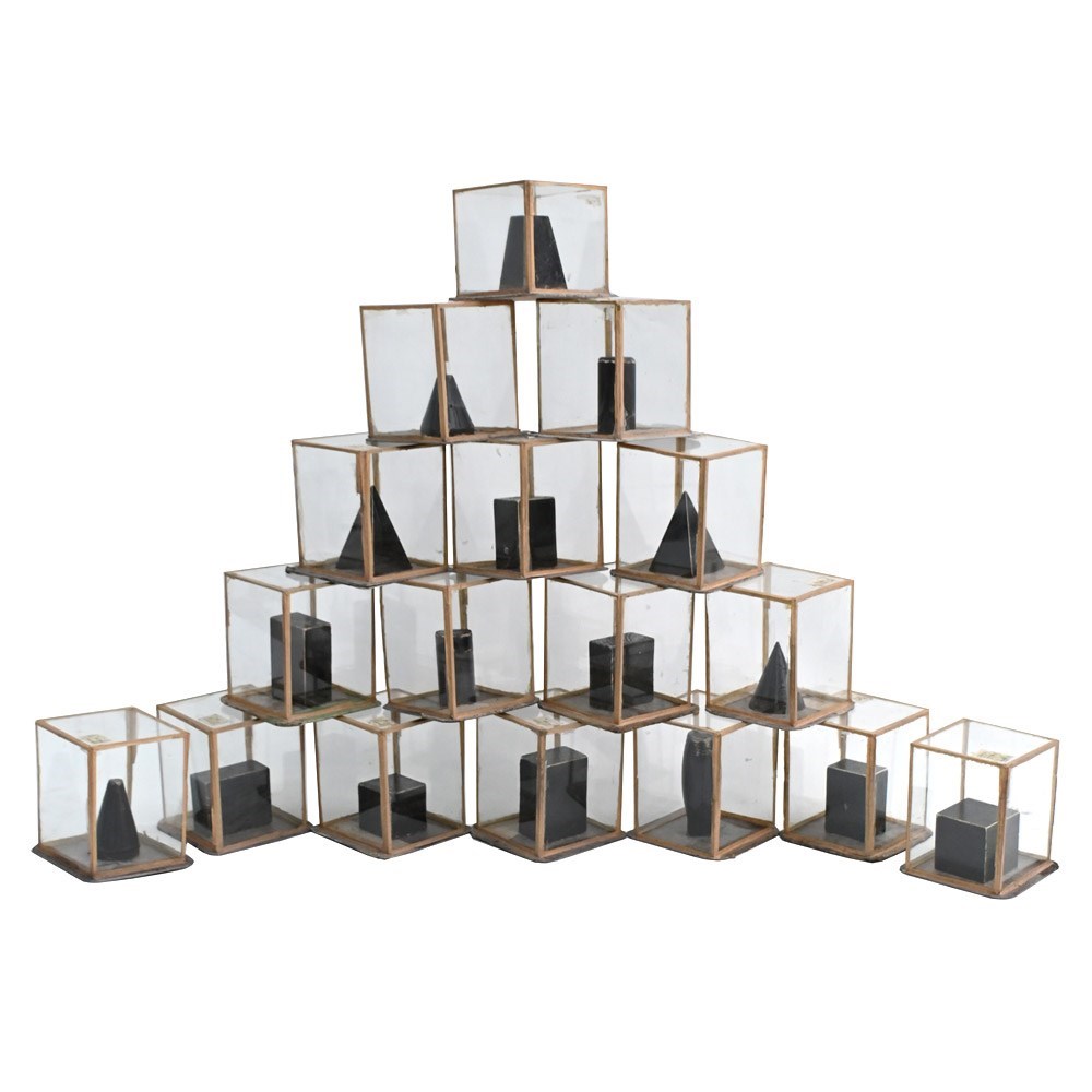 A collection of seventeen hand painted geometric glass encased teaching aid examples. Handwritten numbered labels with card bases.