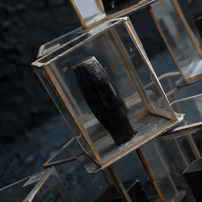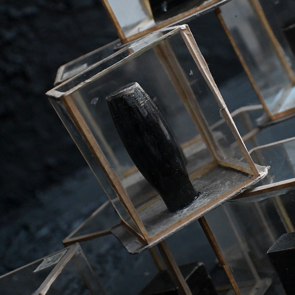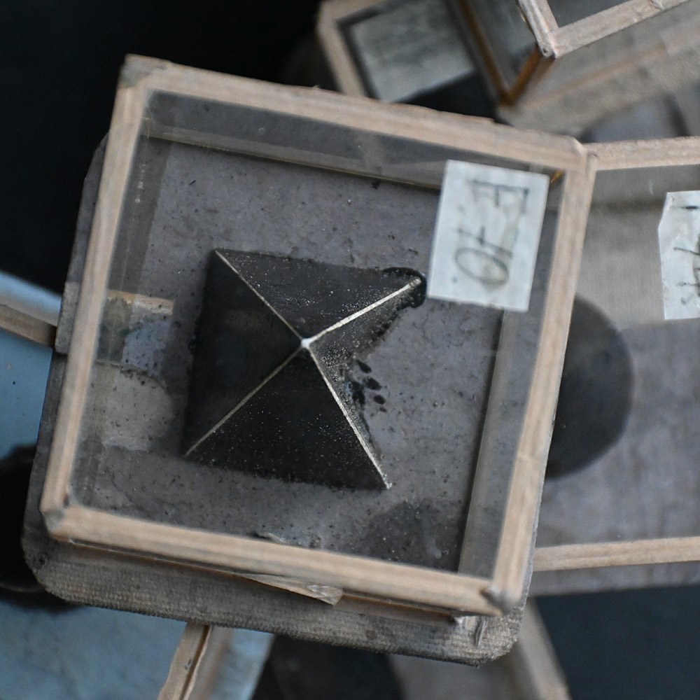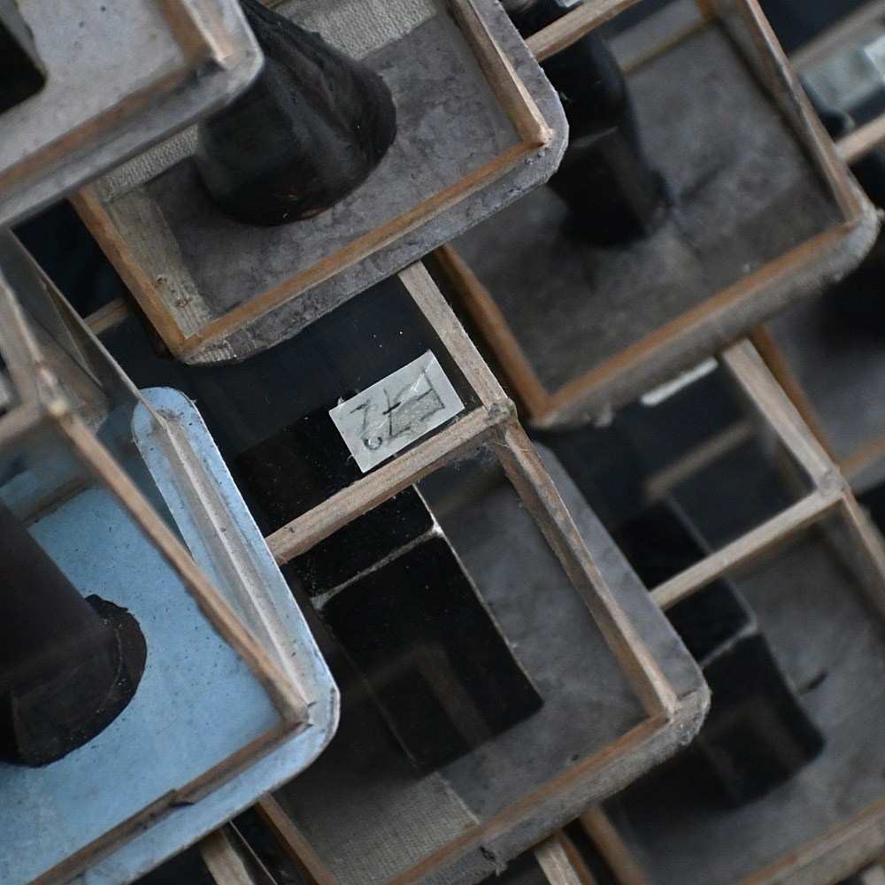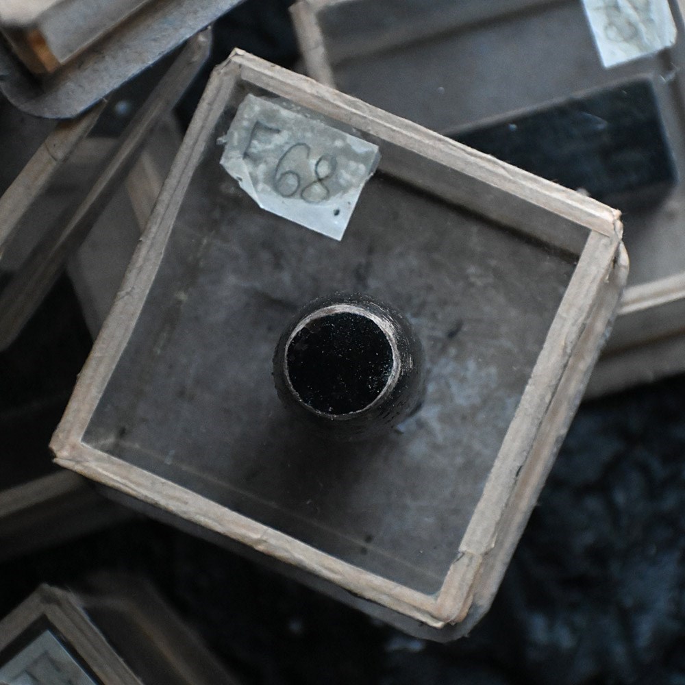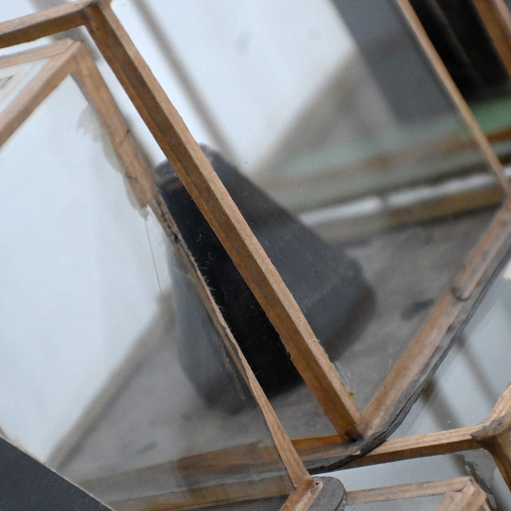 A collection of seventeen hand painted geometric glass encased teaching aid examples. Handwritten numbered labels with card bases.