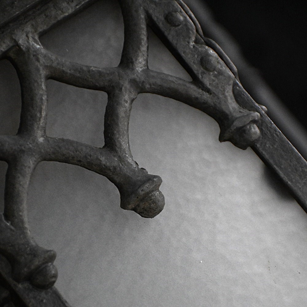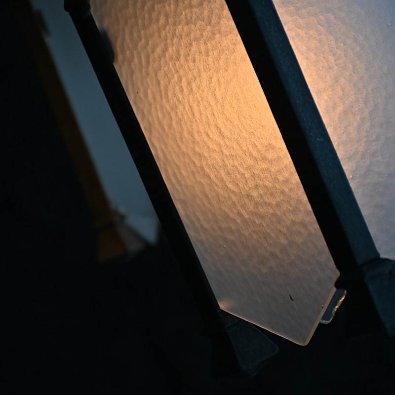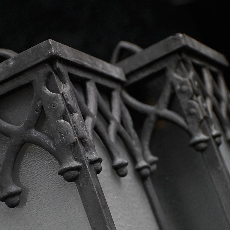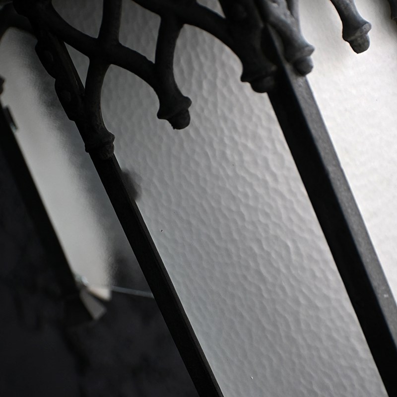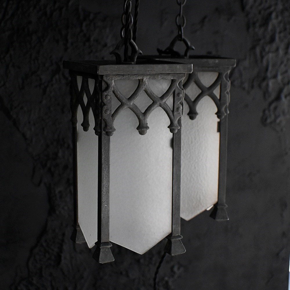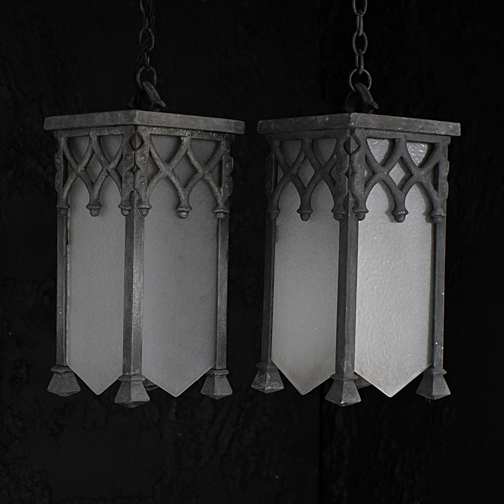 A nice set of turn of the century metal and glass gothic style lights, rewired and with one replacement glass panel. With hanging chains in place and ready to use.