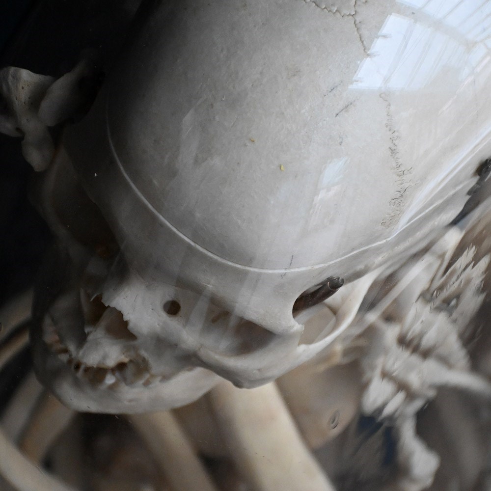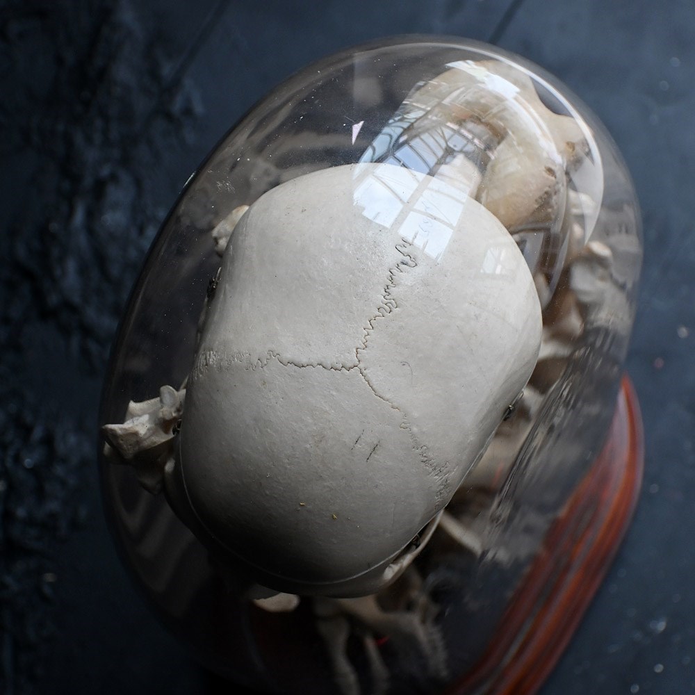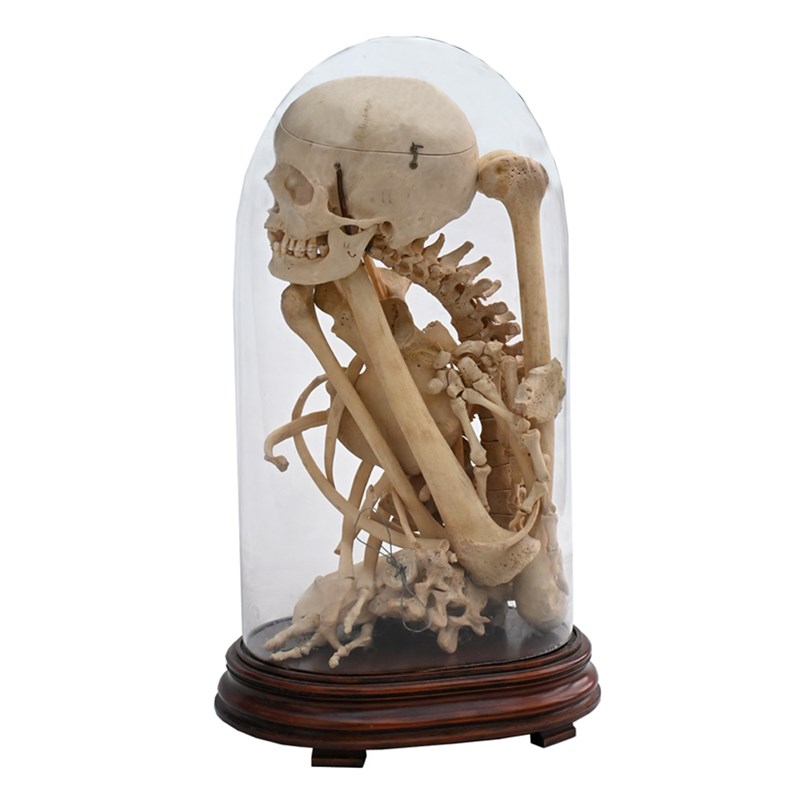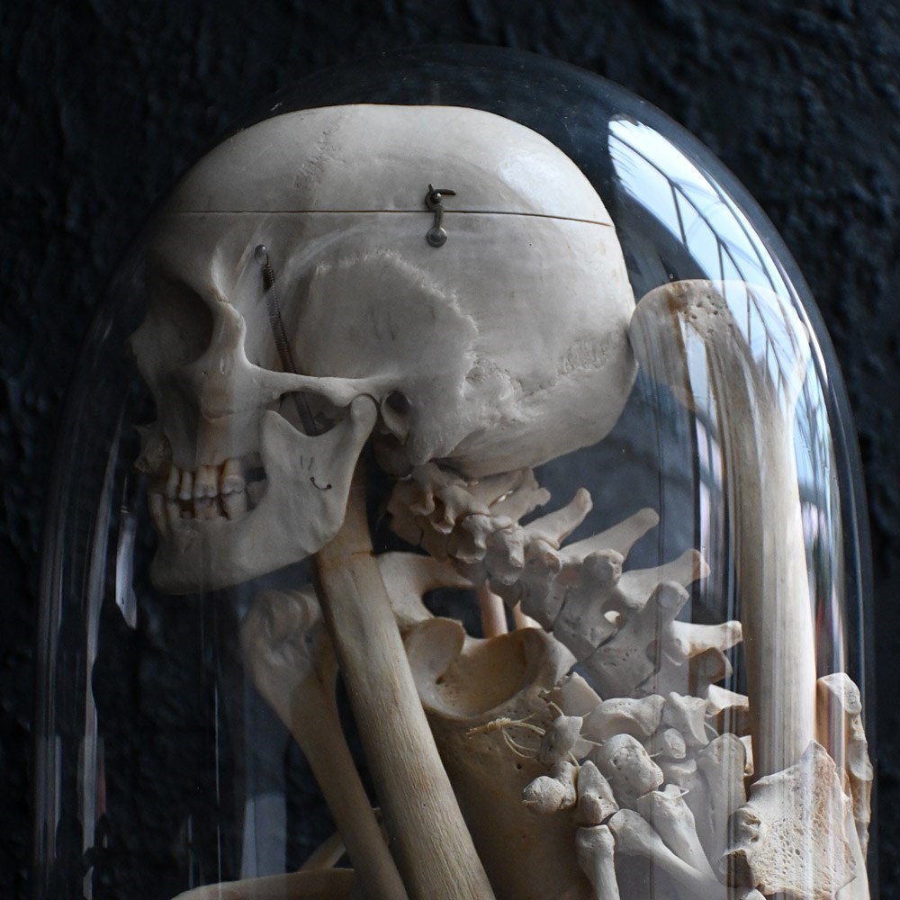 A replica half human skeleton form made by Adam Rouilly, positioned into an 19th Century glass display jar, entitled “half the man I was” The skeleton is very lifelike as you would expect. The item is sold with the large antique jar displayed but will be unassembled and boxed for transport and safety.