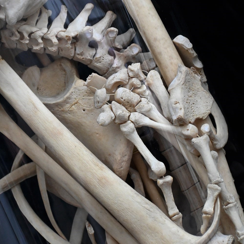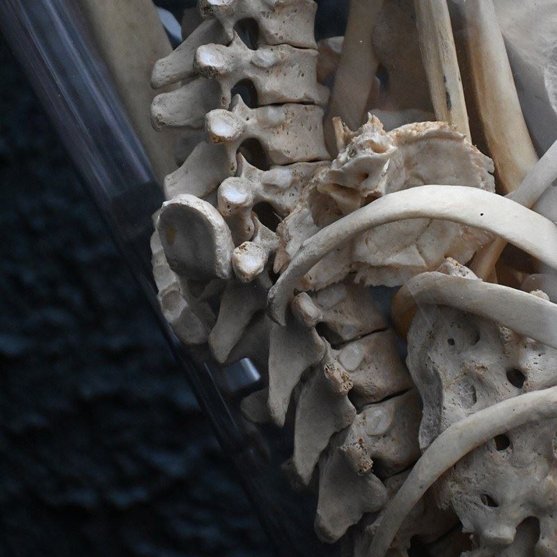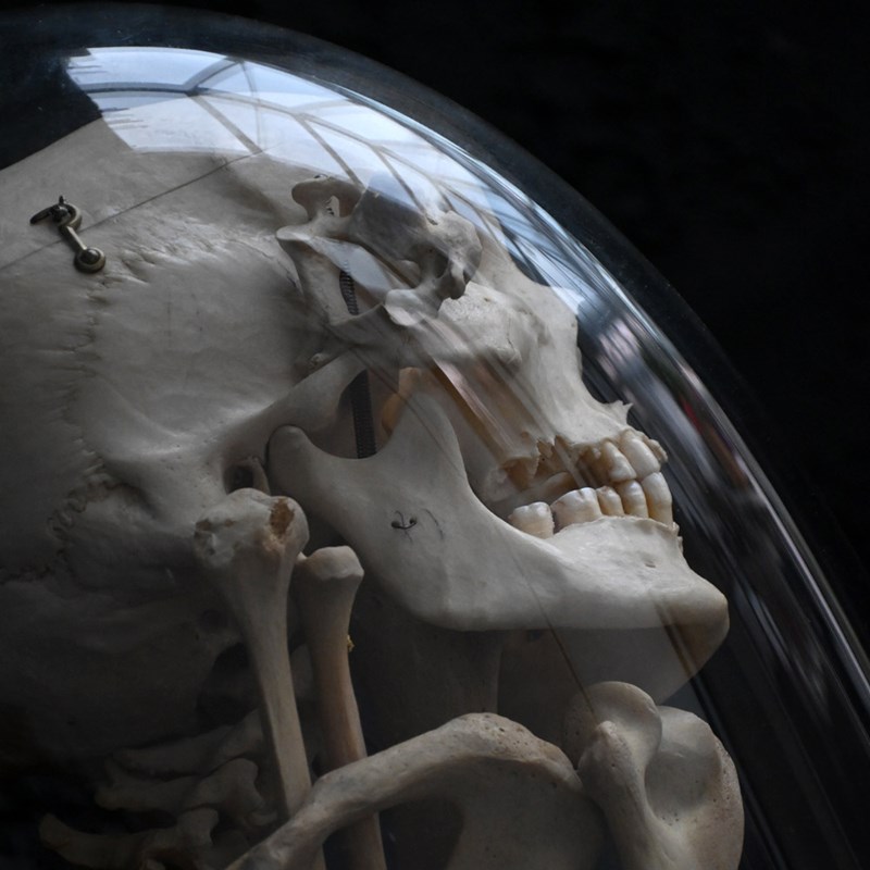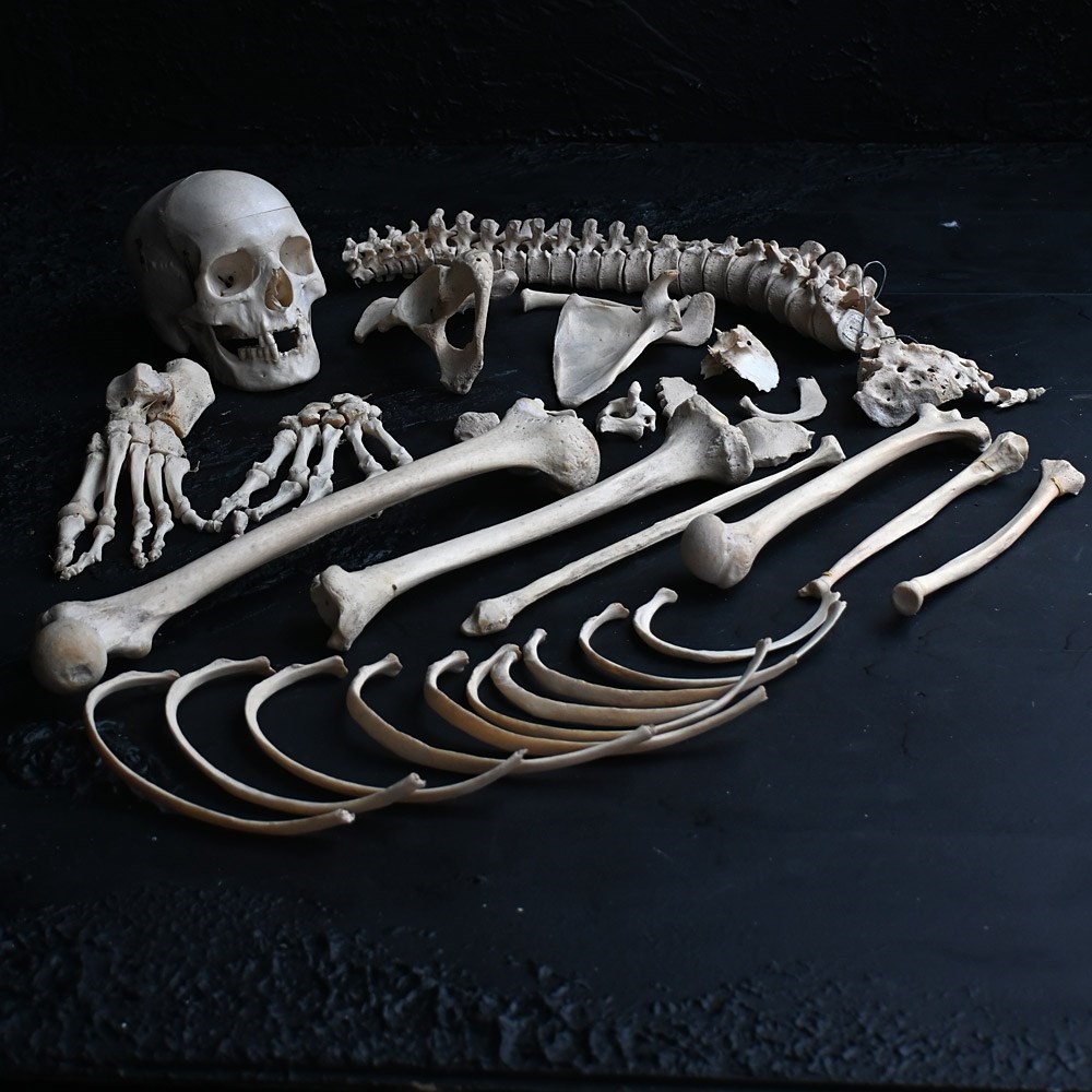 A replica half human skeleton form made by Adam Rouilly, positioned into an 19th Century glass display jar, entitled “half the man I was” The skeleton is very lifelike as you would expect. The item is sold with the large antique jar displayed but will be unassembled and boxed for transport and safety.