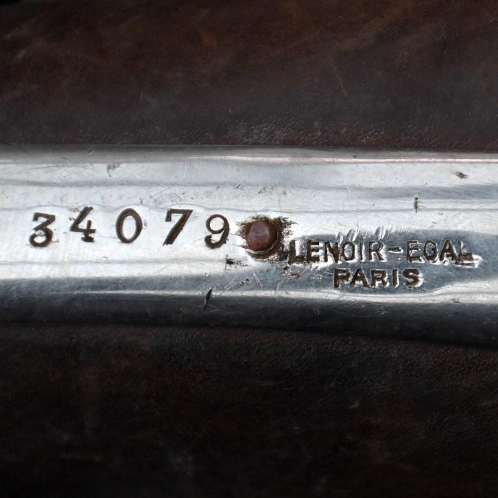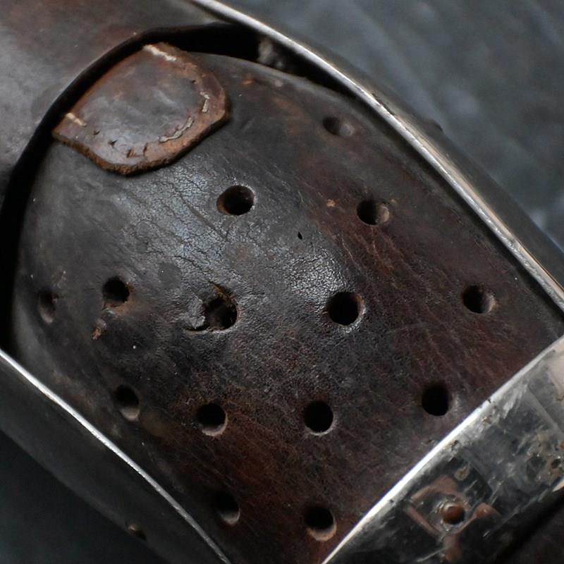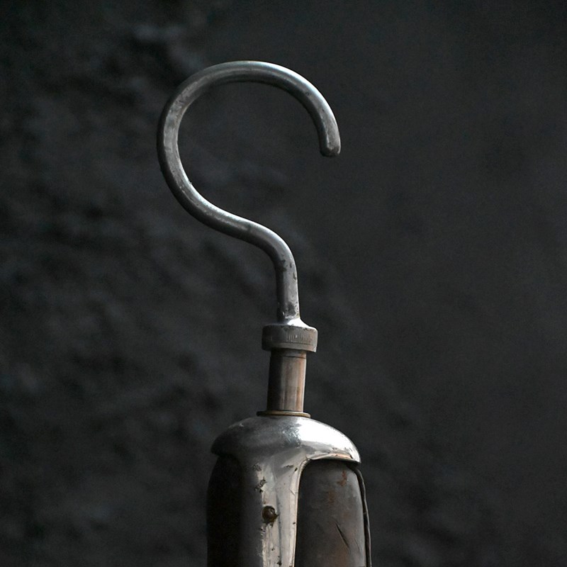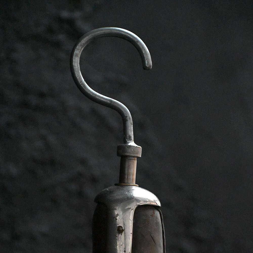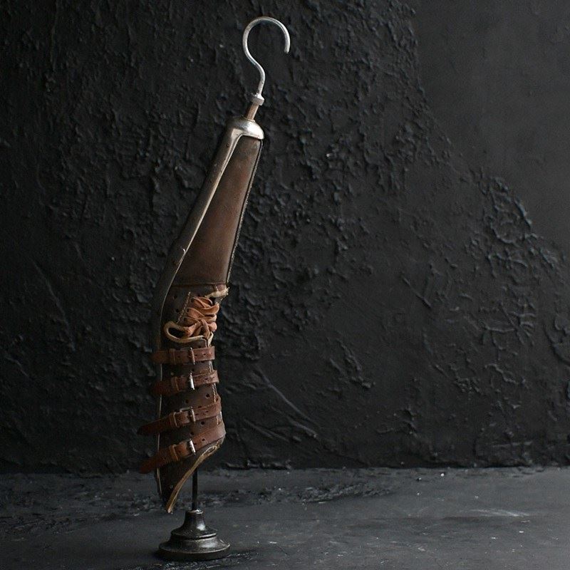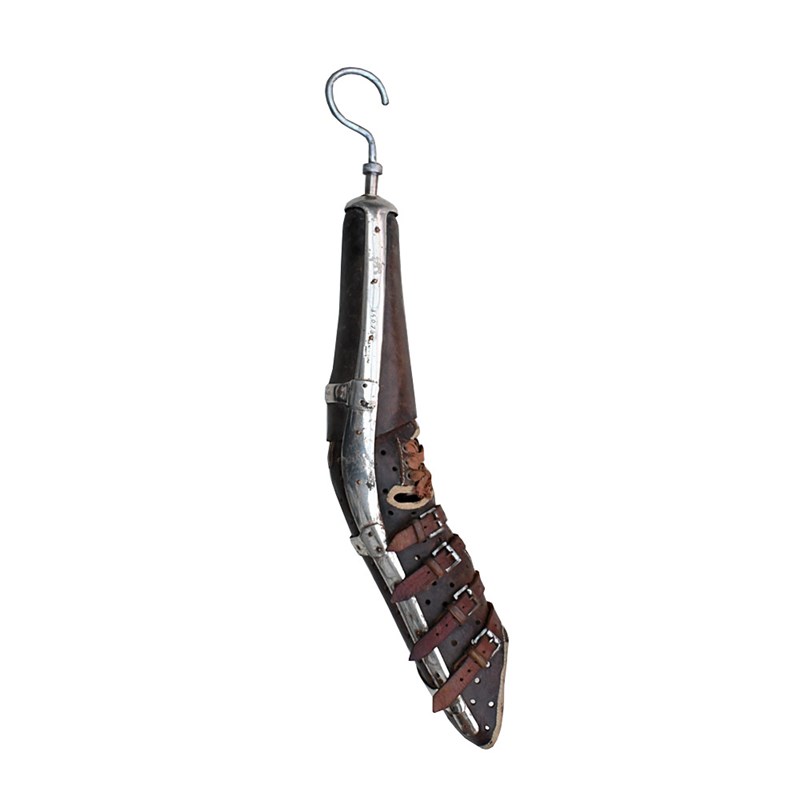 A child size small model of a leather prosthetic arm with hook. Traces of rust on nickel-plated steel structure with patinated leather. Work made between the wars, circa 1920 and stamped with number and Paris (France) makers mark as shown.