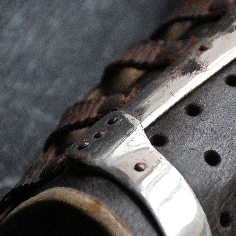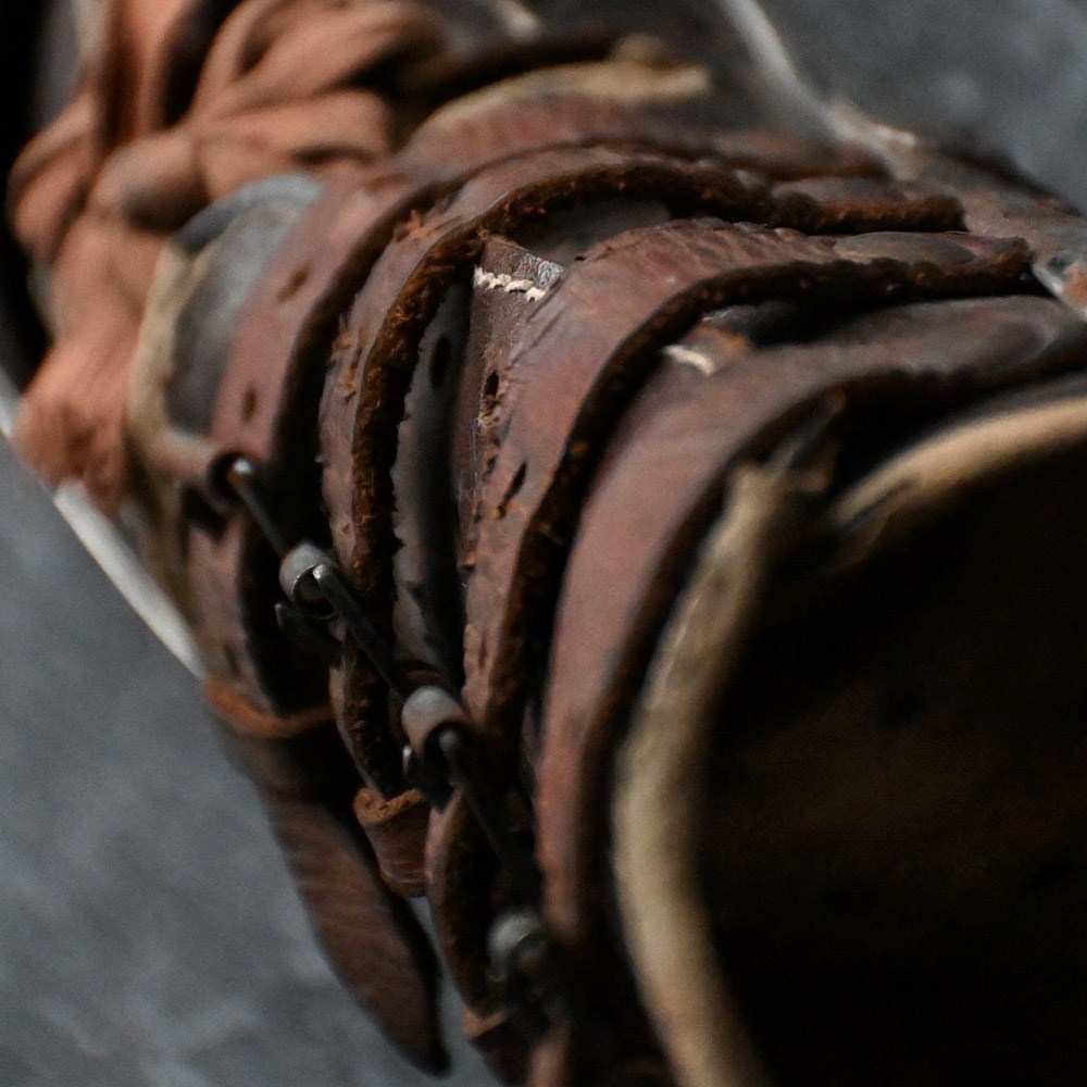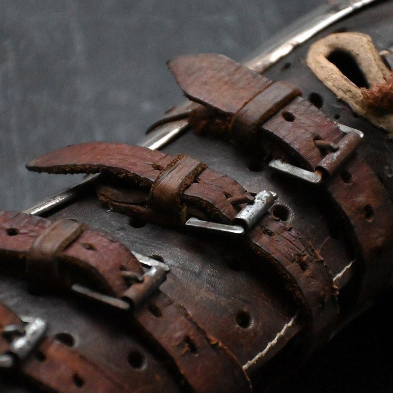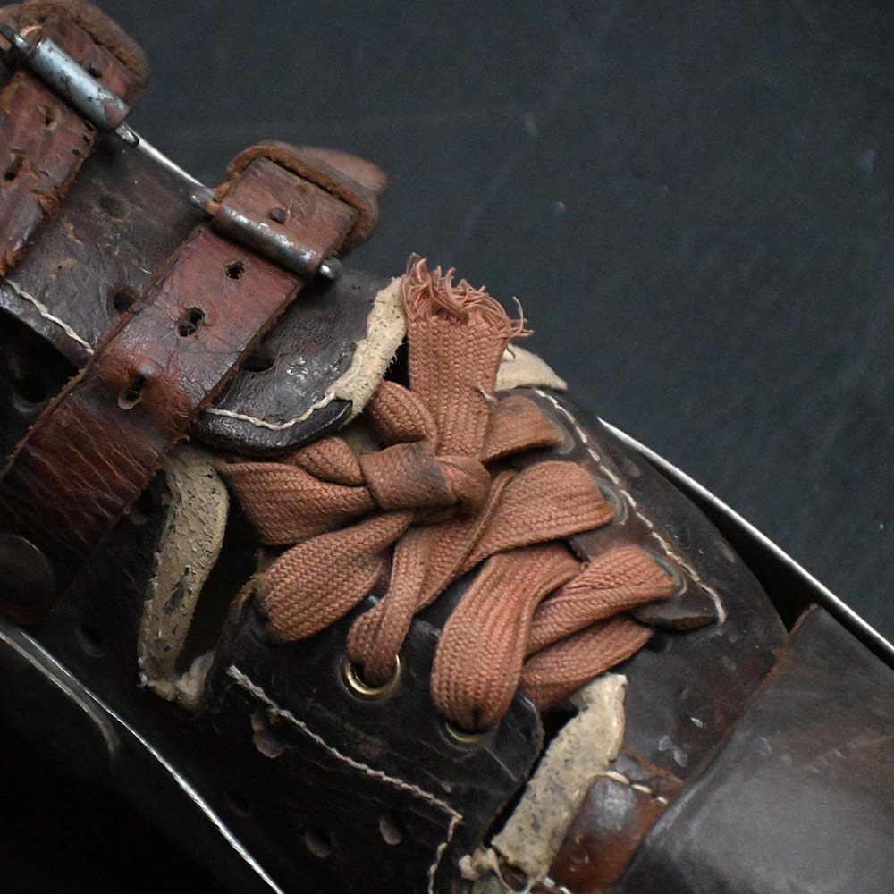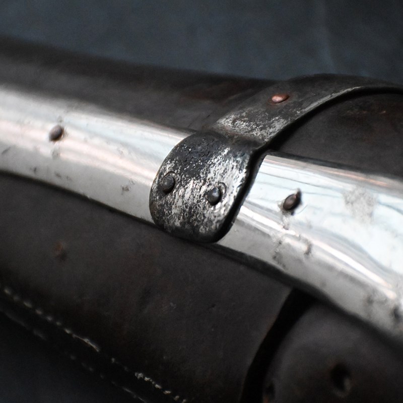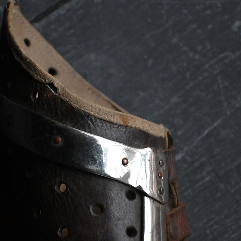 A child size small model of a leather prosthetic arm with hook. Traces of rust on nickel-plated steel structure with patinated leather. Work made between the wars, circa 1920 and stamped with number and Paris (France) makers mark as shown.