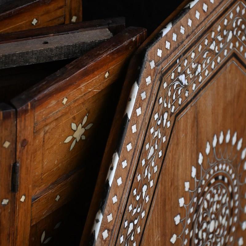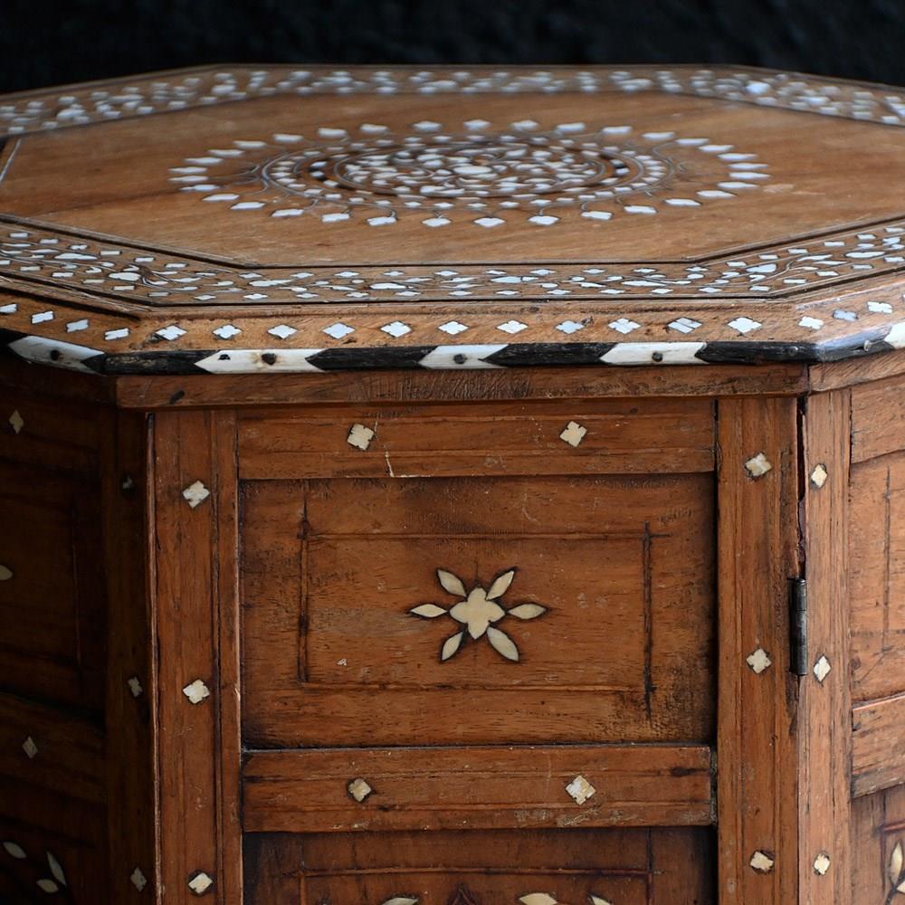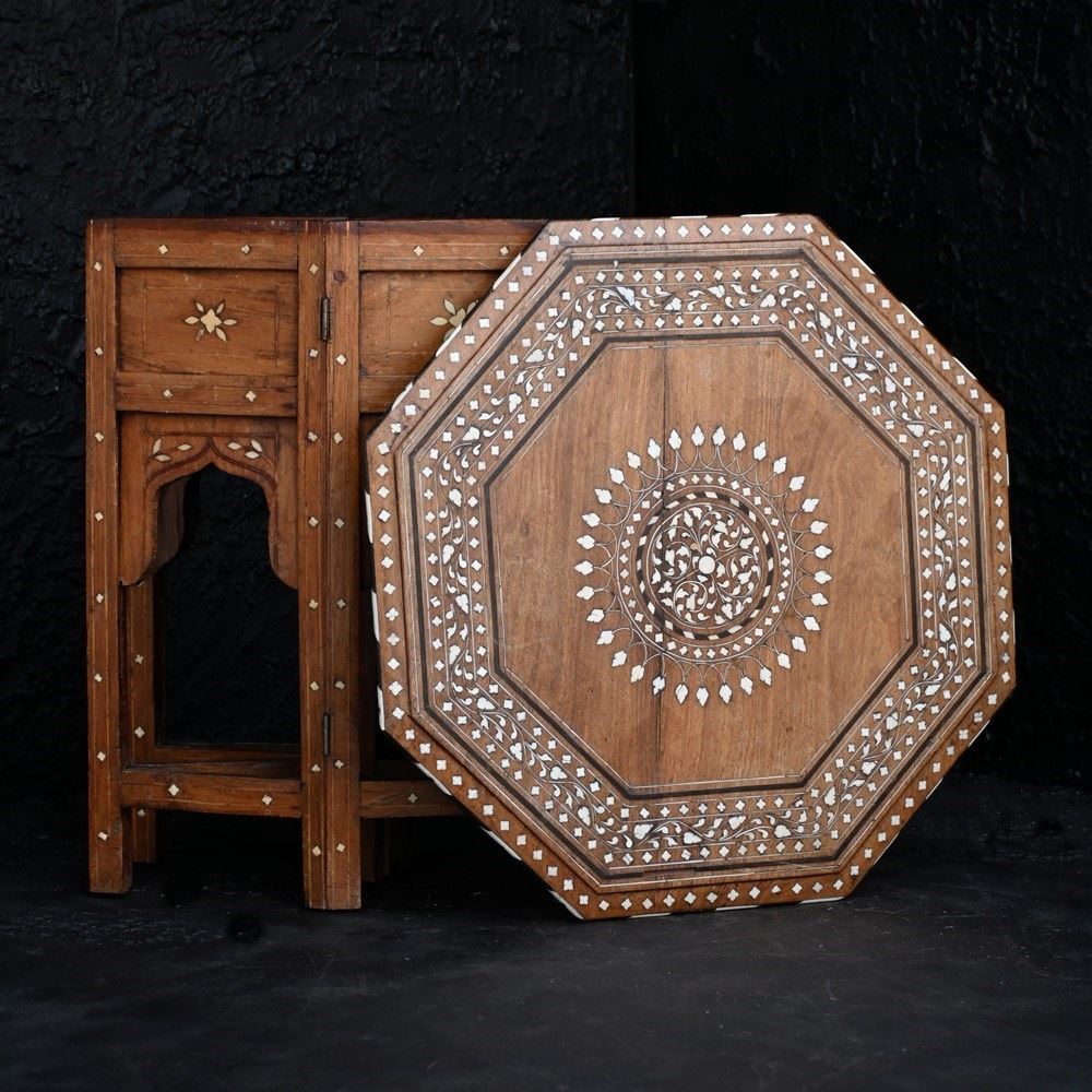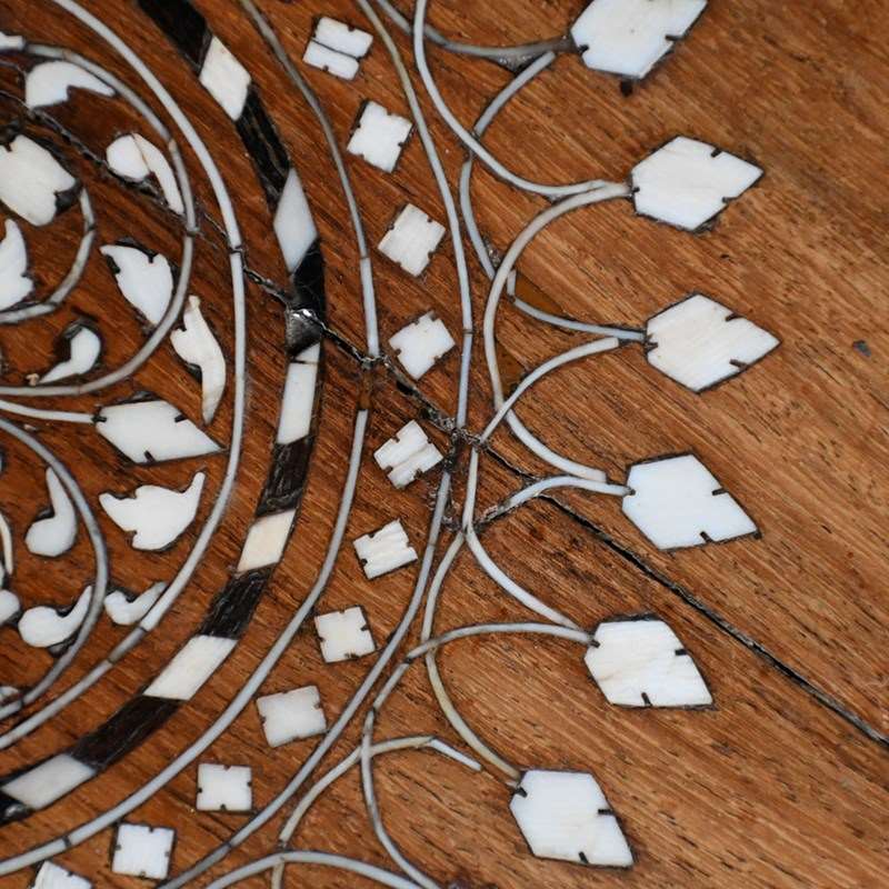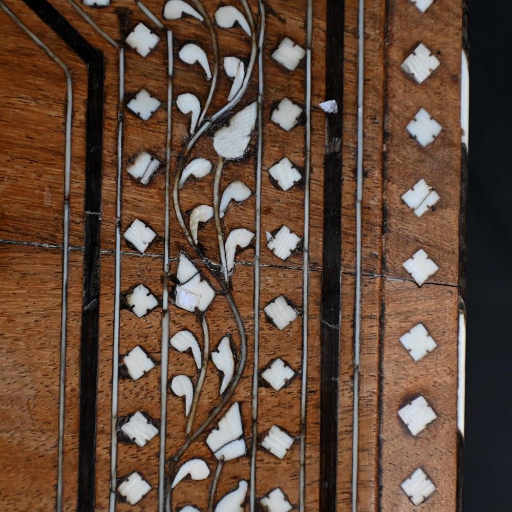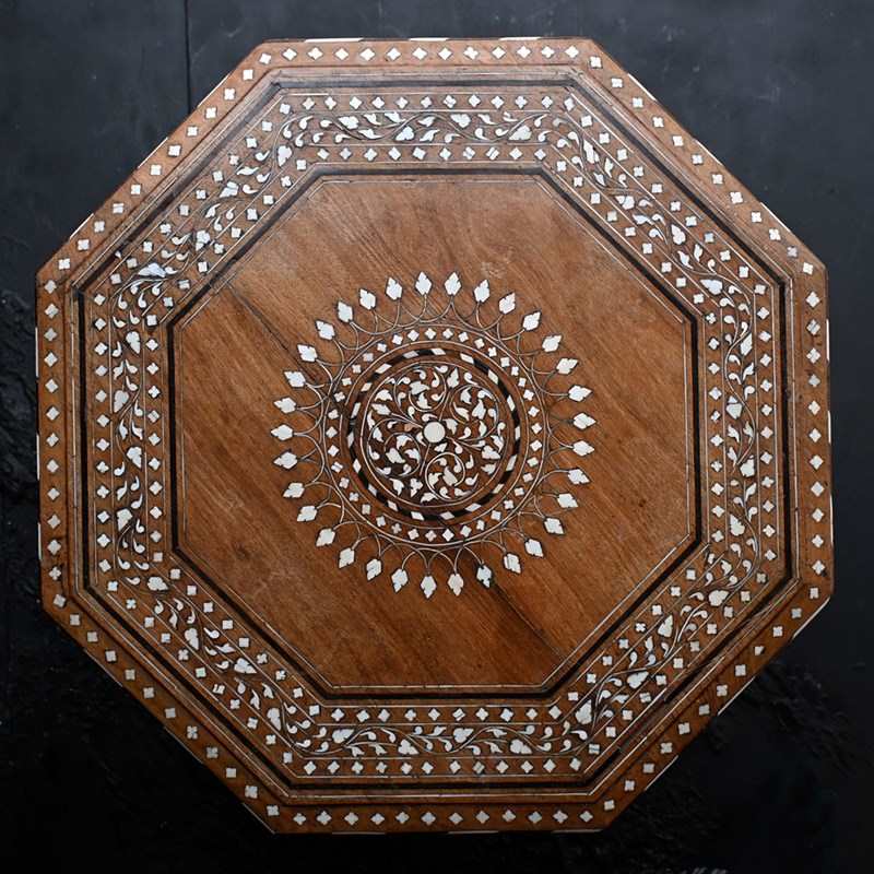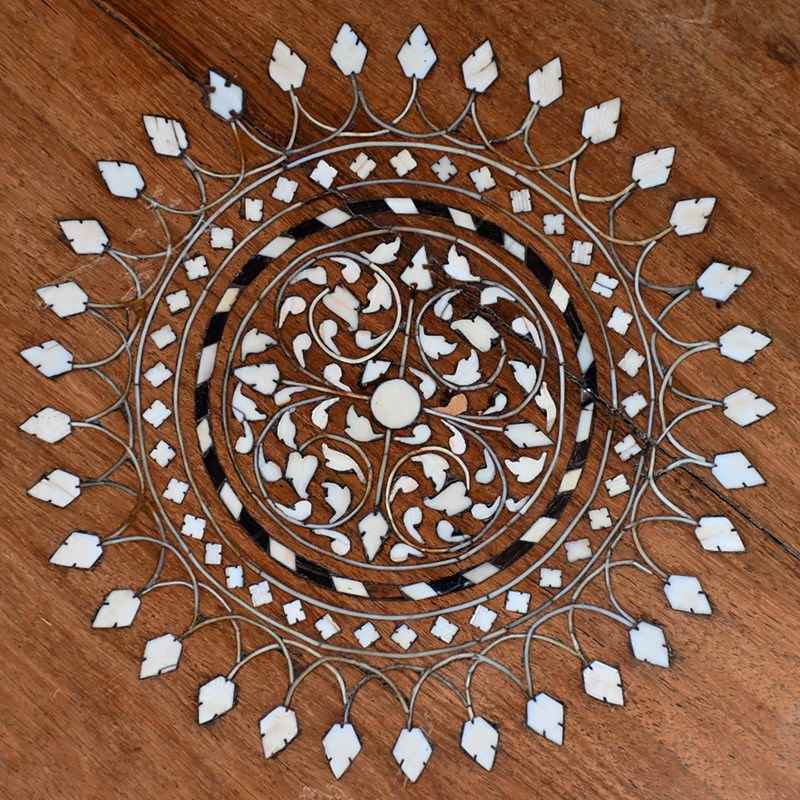 A piece of historic Indian furniture dated to the early 20th century, hand crafted in India, Hoshiarpur. Inlaid detail as shown and paper stamped underside to align the table with the base which comes apart.