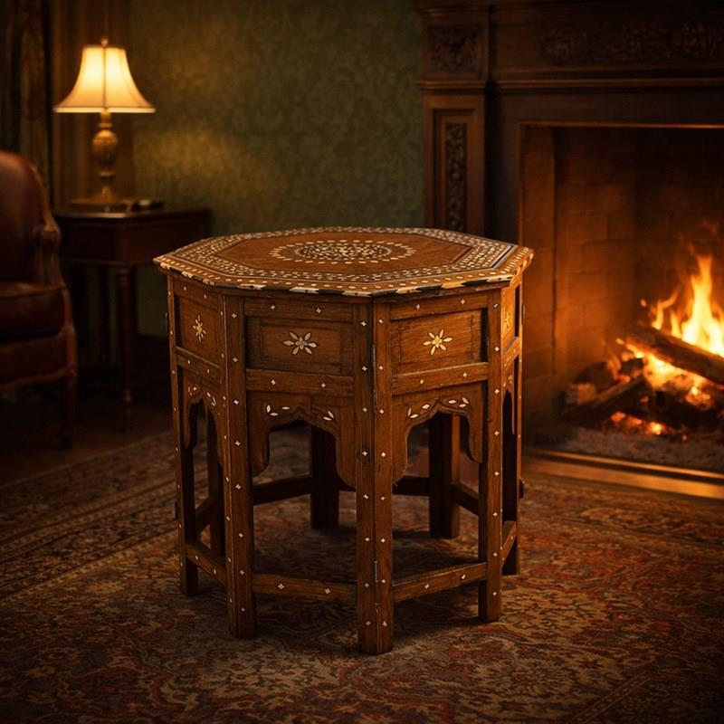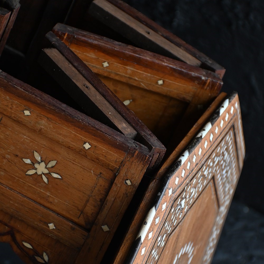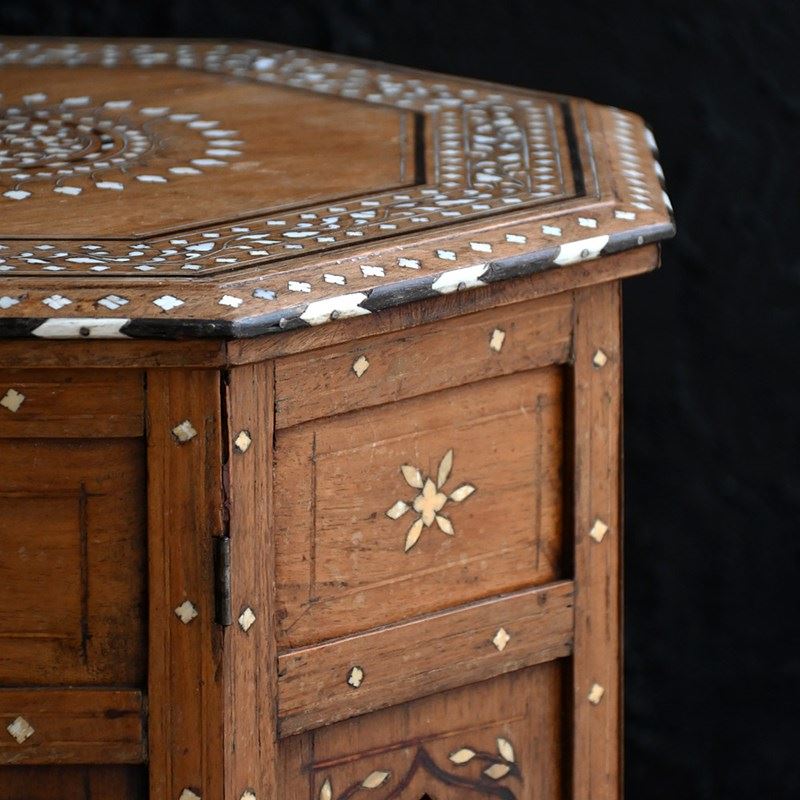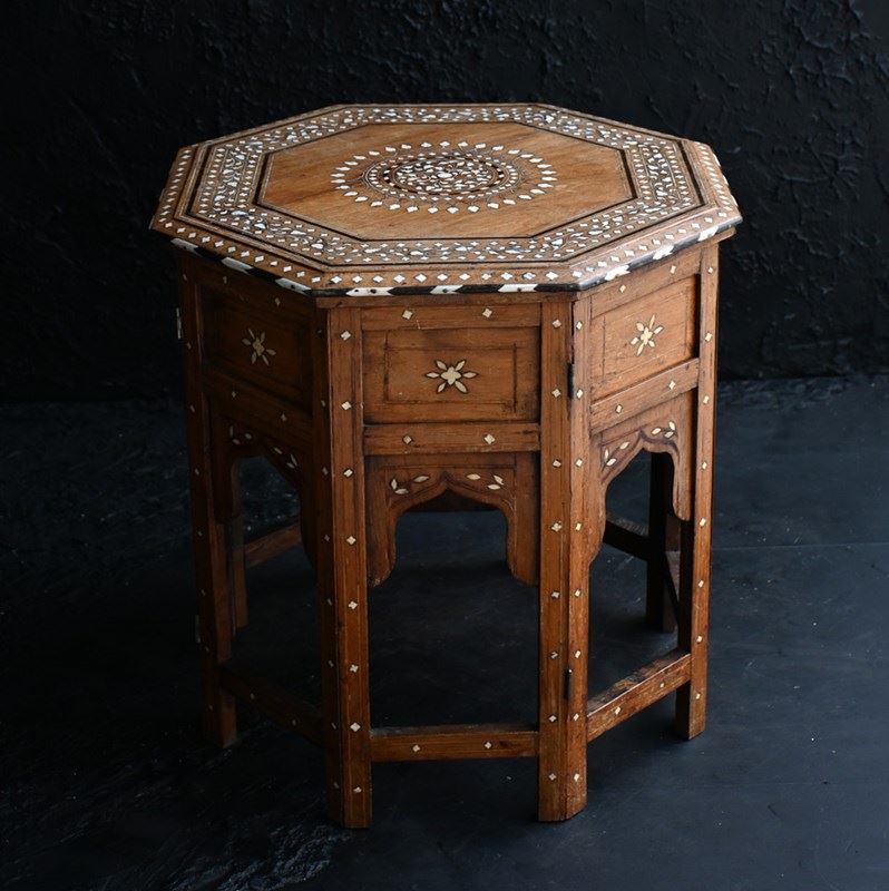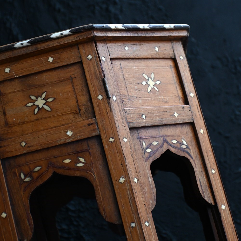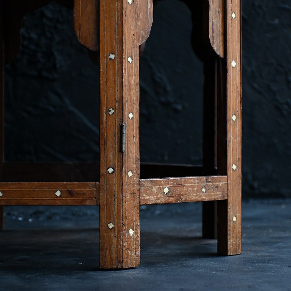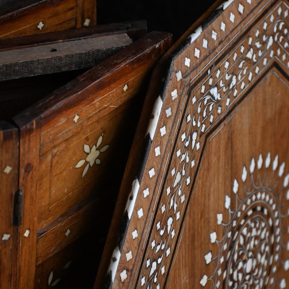 A piece of historic Indian furniture dated to the early 20th century, hand crafted in India, Hoshiarpur. Inlaid detail as shown and paper stamped underside to align the table with the base which comes apart.