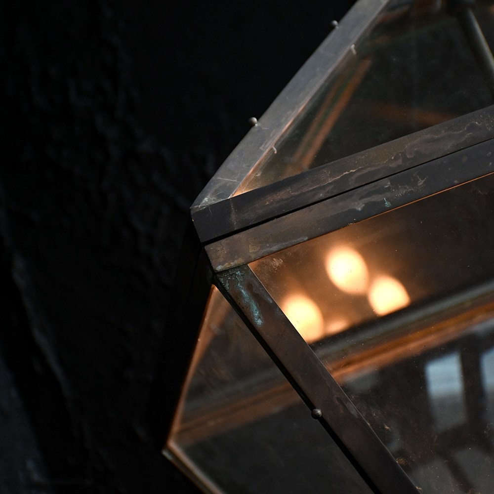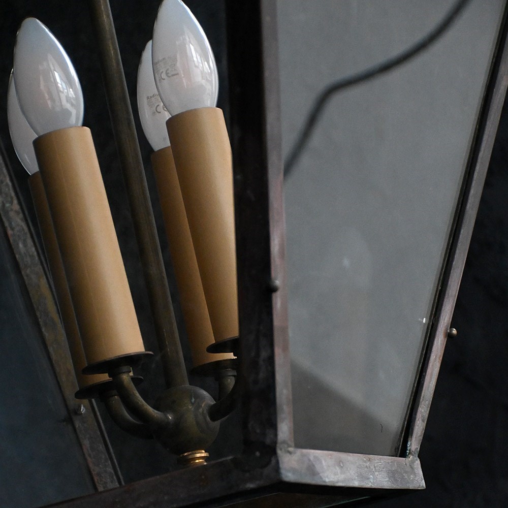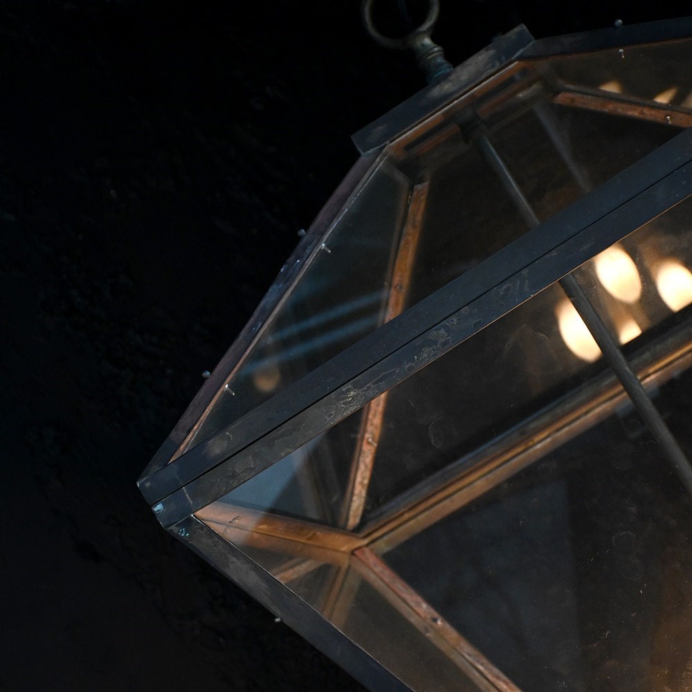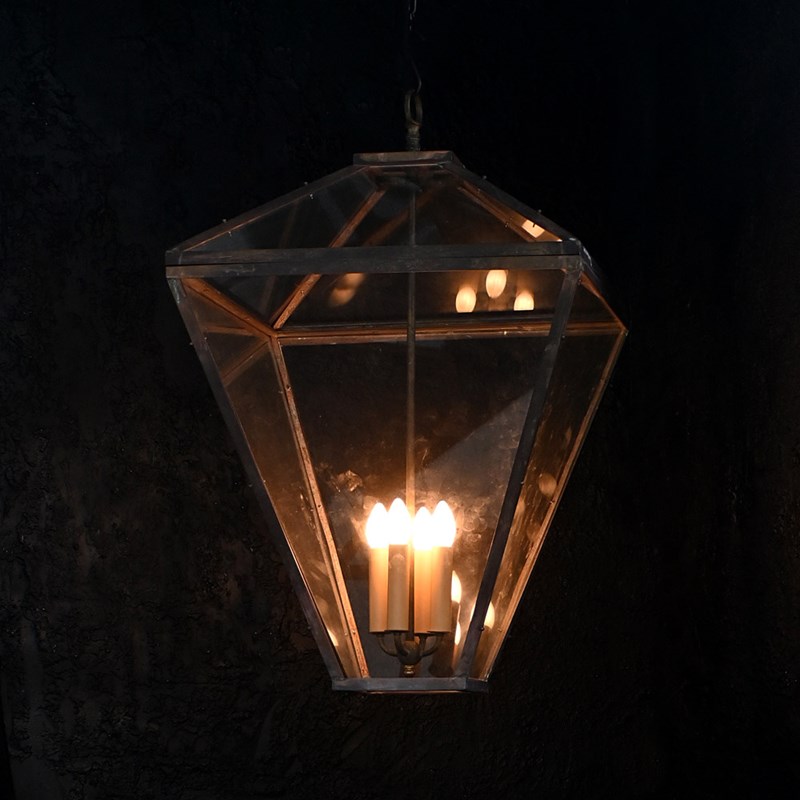 A huge example of an early to mid-20th century copper and glass English lantern. With updated rewired flex cables and light holders, new glass plates as shown. The copper frame and hanging hooked are aged well with a light patination across all surfaces.
