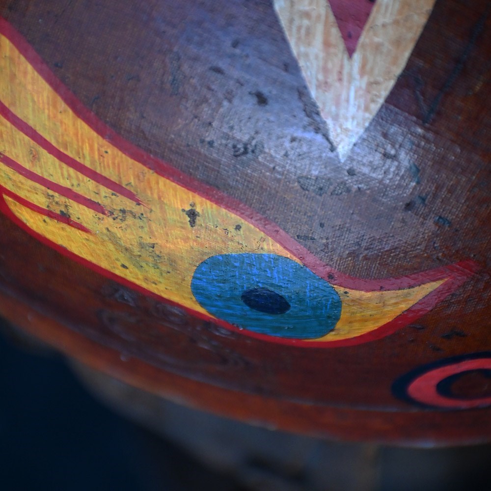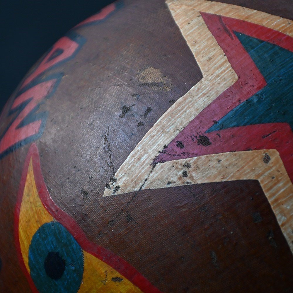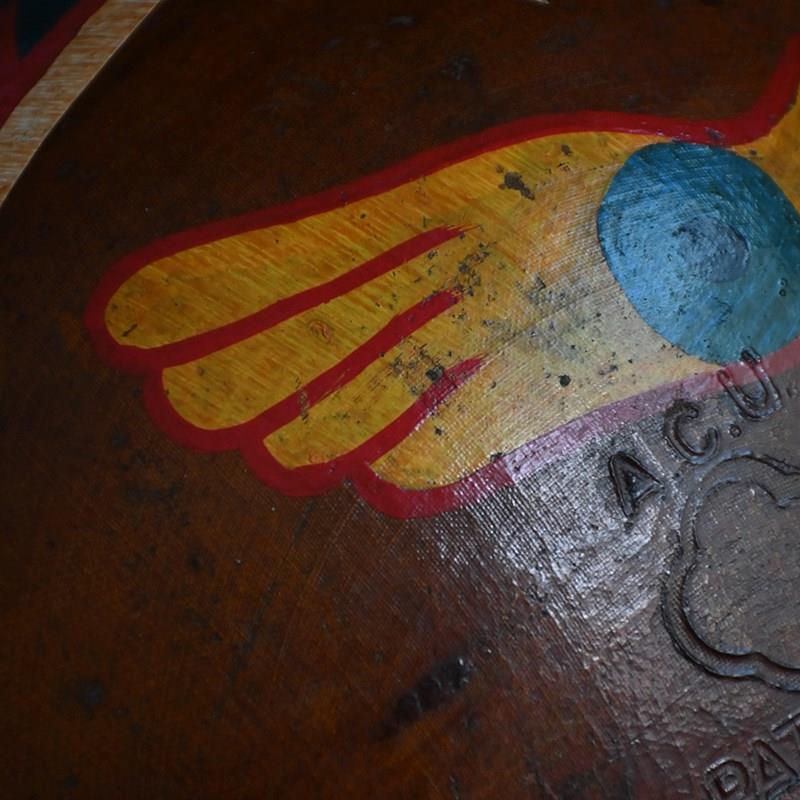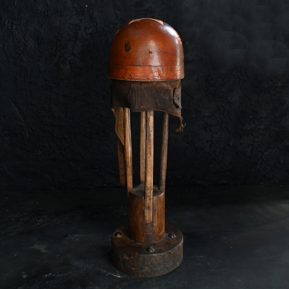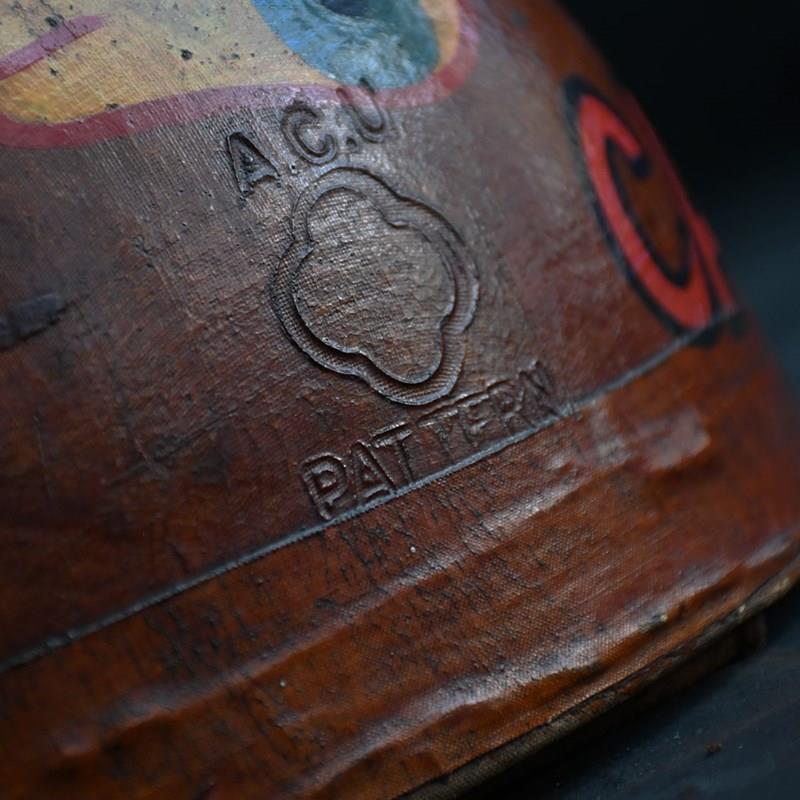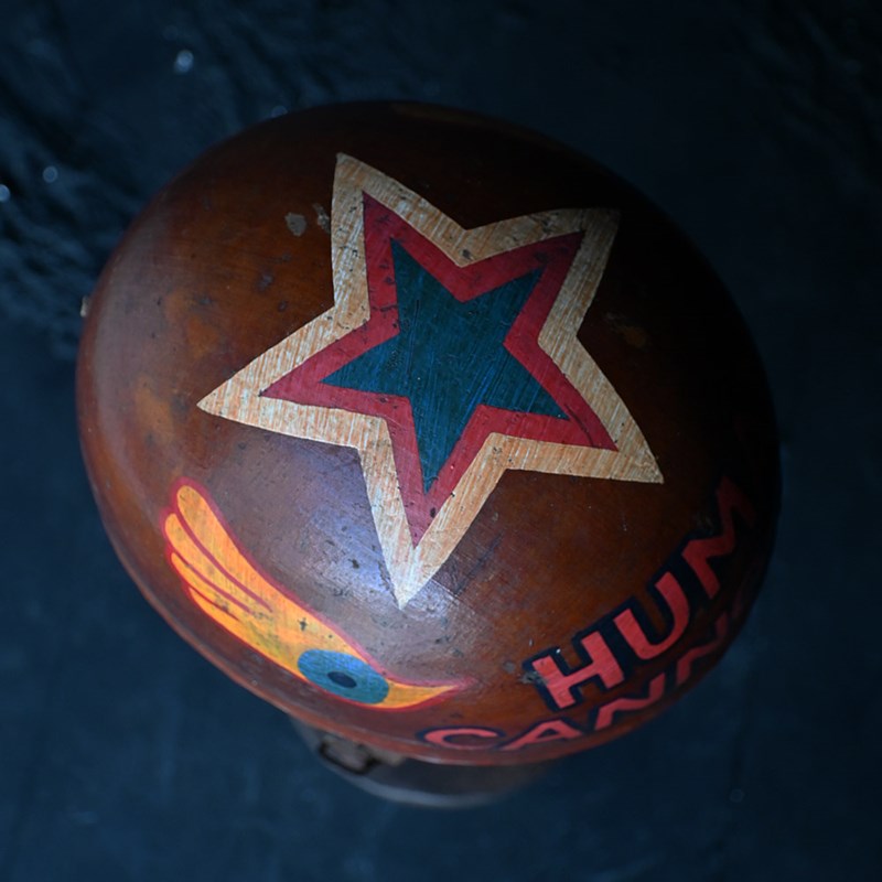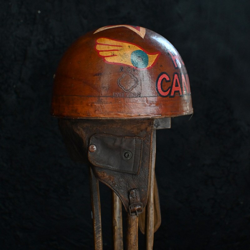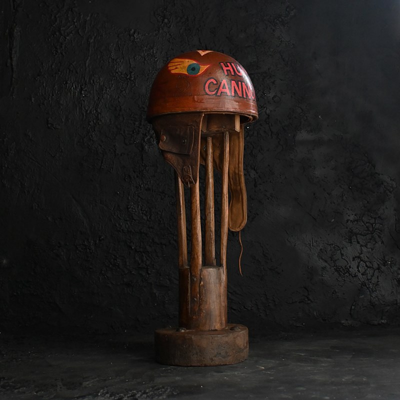 An item of curios nature, In the form of this mid-20th hand painted human cannonball helmet. With bespoke wooden stand. With natural wear and aged well.
