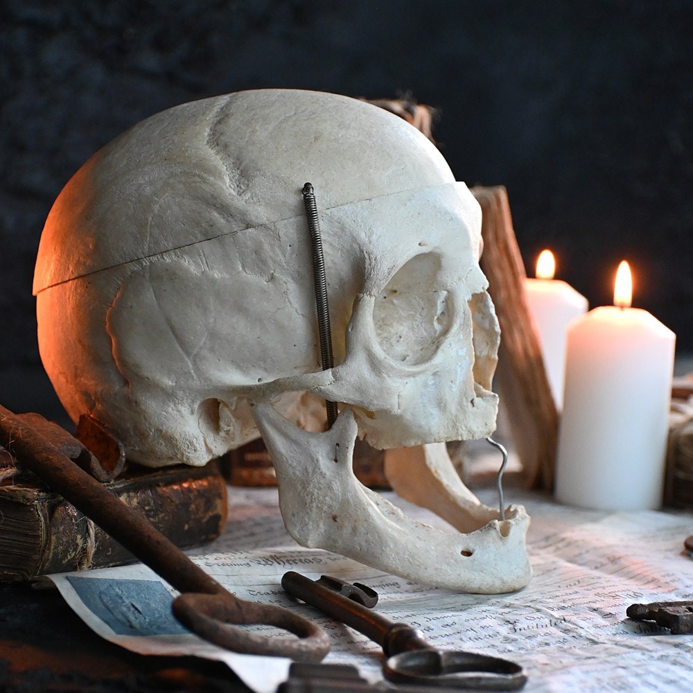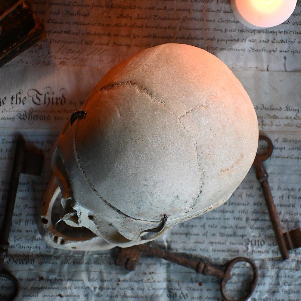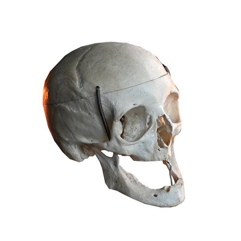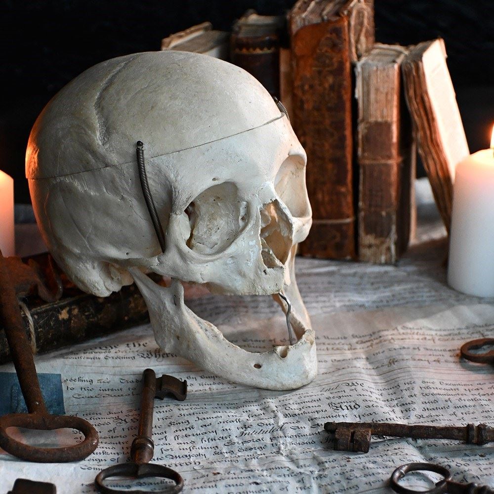 A 19th Century medical human skull specimen, with articulated jaw and removable mandible and cranium cap. This example is of an old, aged female specimen as without any teeth and with large wide eye sockets.