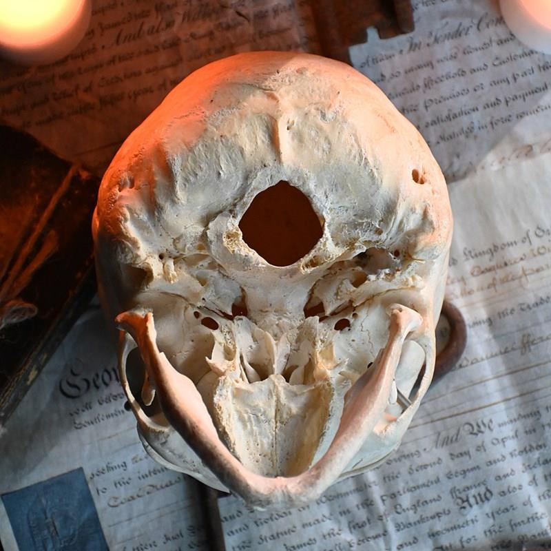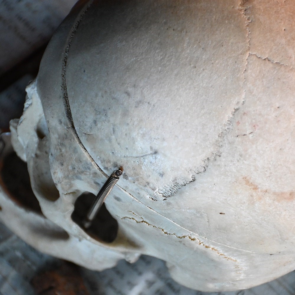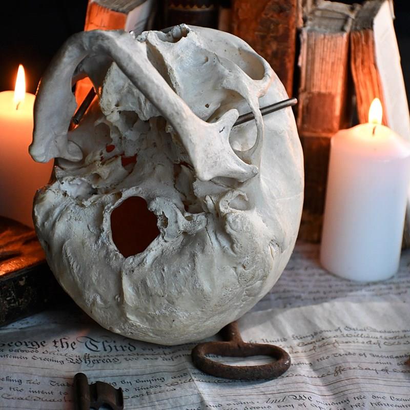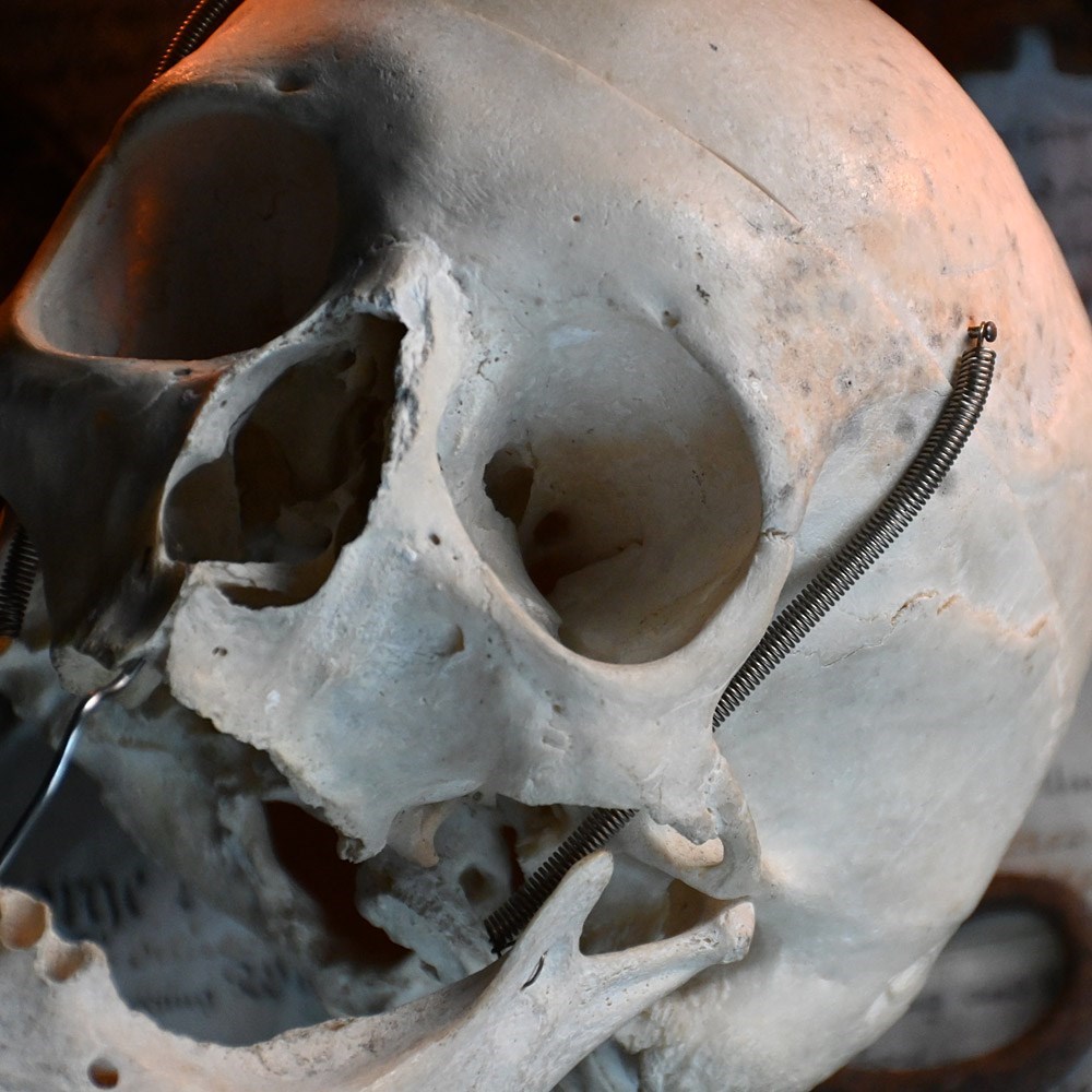 A 19th Century medical human skull specimen, with articulated jaw and removable mandible and cranium cap. This example is of an old, aged female specimen as without any teeth and with large wide eye sockets.