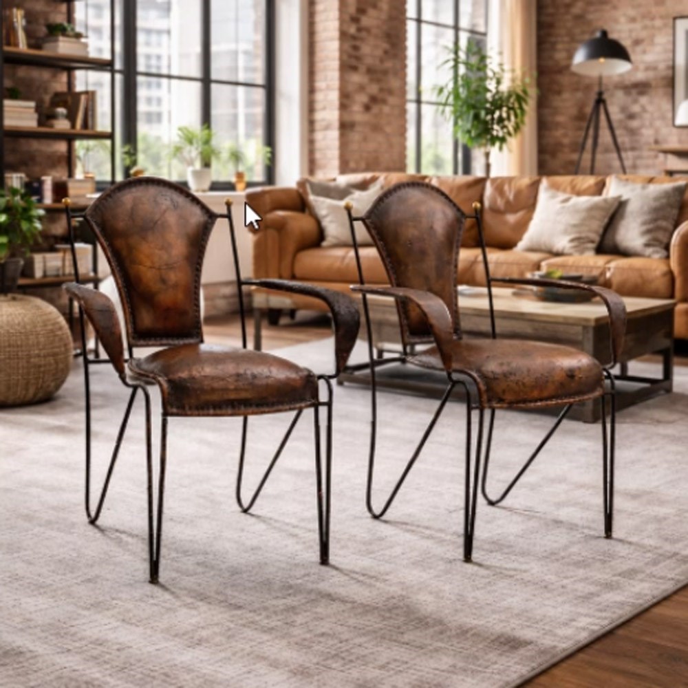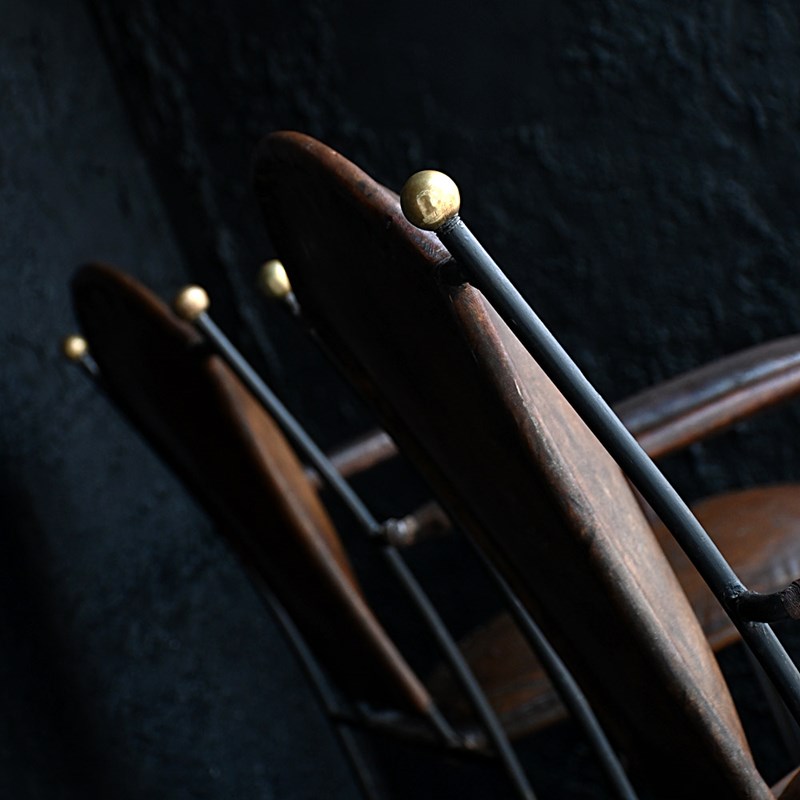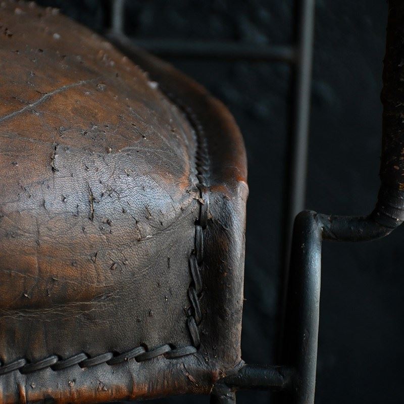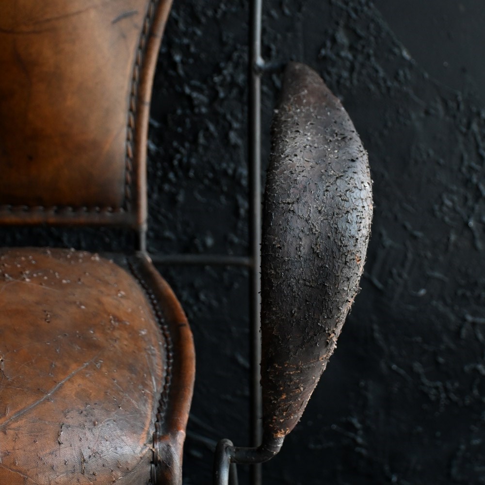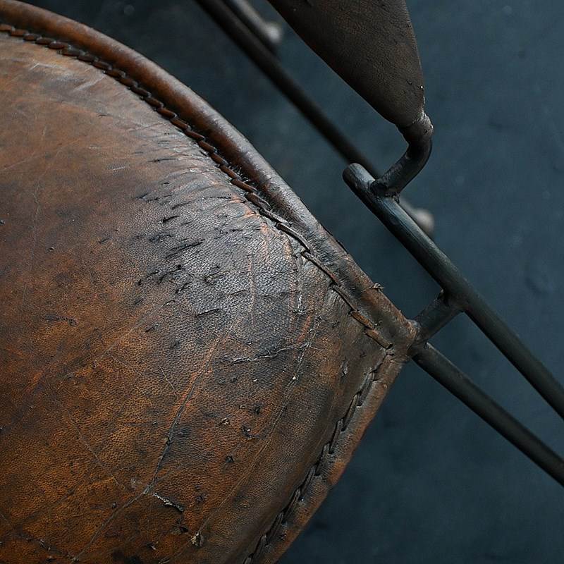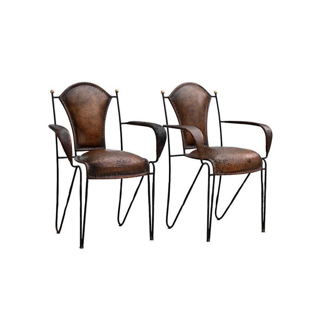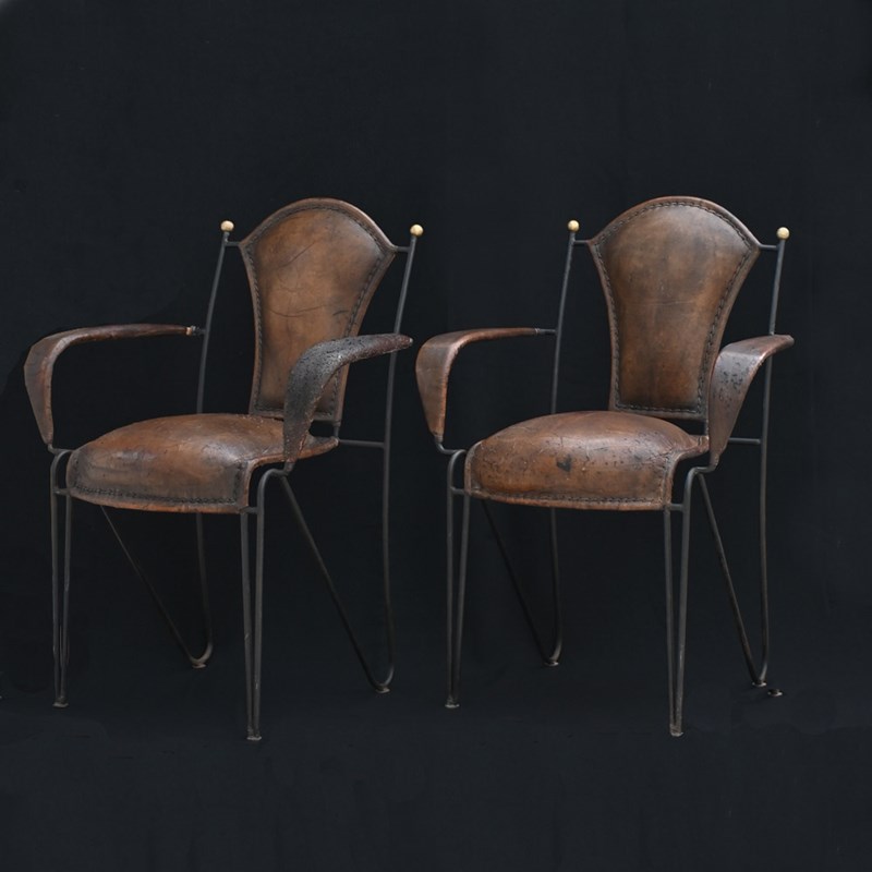 They feature a reassuringly solid streamlined wrought iron frame, with which the rare original-toned and sculpturally shaped, padded and hand-stitched tan leather complements wonderfully. The brass ball finials atop the back complete the wonderful mix of colour and materials and really set these chairs off as sculptural artforms as much as comfortable and eye-catchingly smart armchairs.