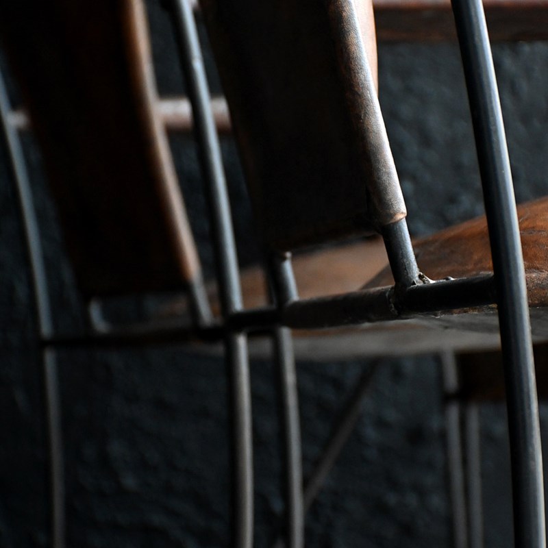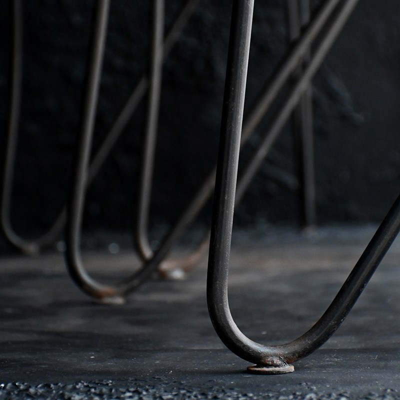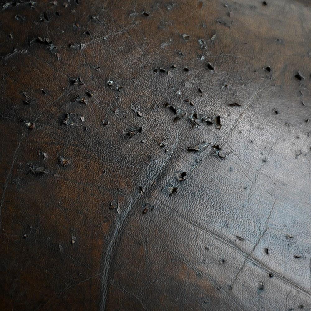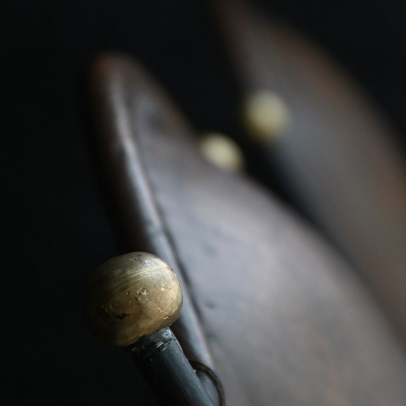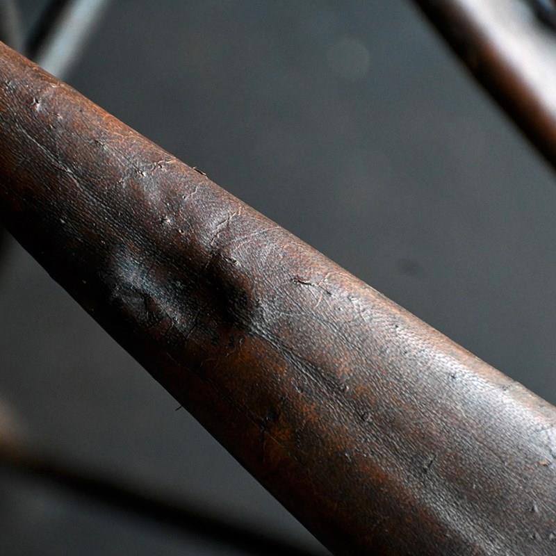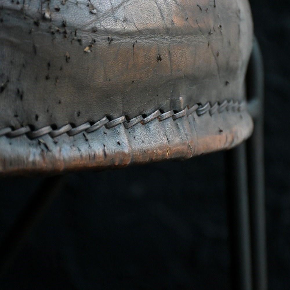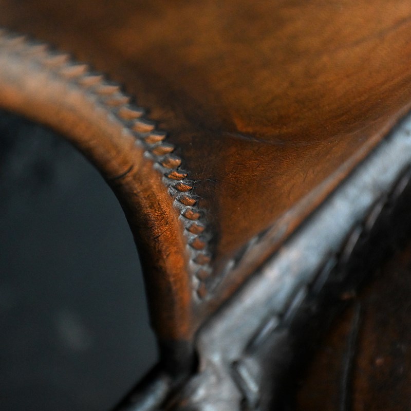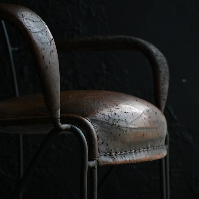 They feature a reassuringly solid streamlined wrought iron frame, with which the rare original-toned and sculpturally shaped, padded and hand-stitched tan leather complements wonderfully. The brass ball finials atop the back complete the wonderful mix of colour and materials and really set these chairs off as sculptural artforms as much as comfortable and eye-catchingly smart armchairs.