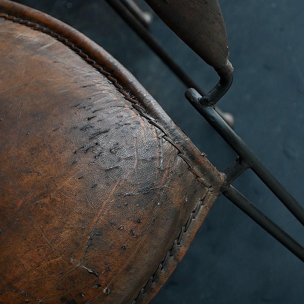 A well-used pair of Mid-Century leather wrought iron and brass armchairs. Designed by French Modernist giant Jacques Adnet and made in France in the 1950s, As much sculptural works of art as they are comfortable armchairs and will add fascination and an unmistakably fabulous French Modernist aesthetic to any setting.