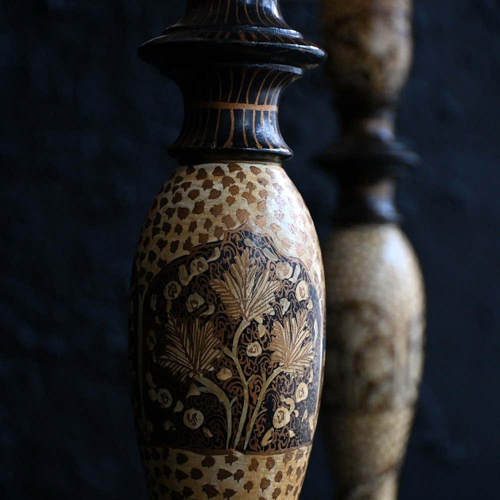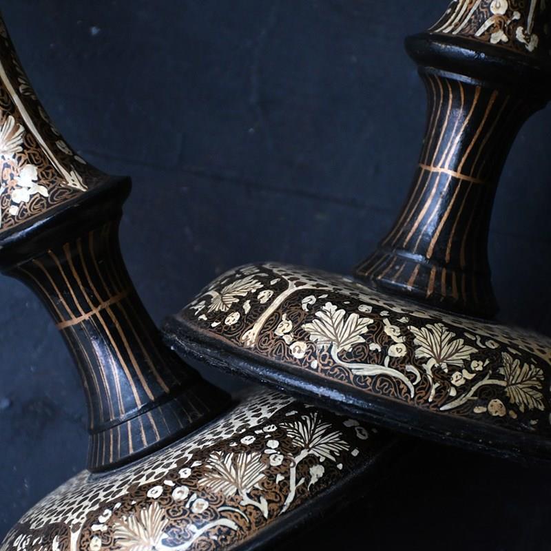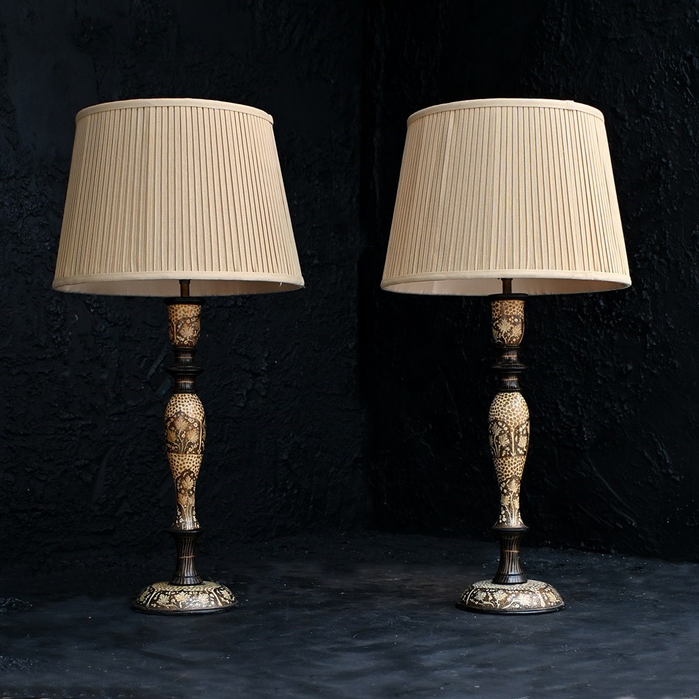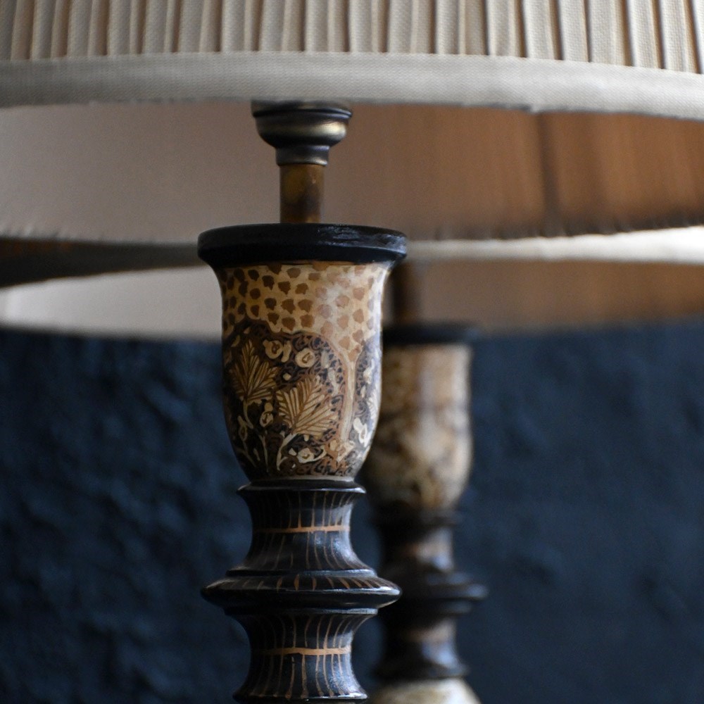 A highly decorative and functional matched pair of early to mid-20th Century hand crafted Kashmiri lights. Painted with cream and gold floral patterns on an ebonised black surface, these highly decorative lights have been rewired with new neutral-coloured shades as shown.