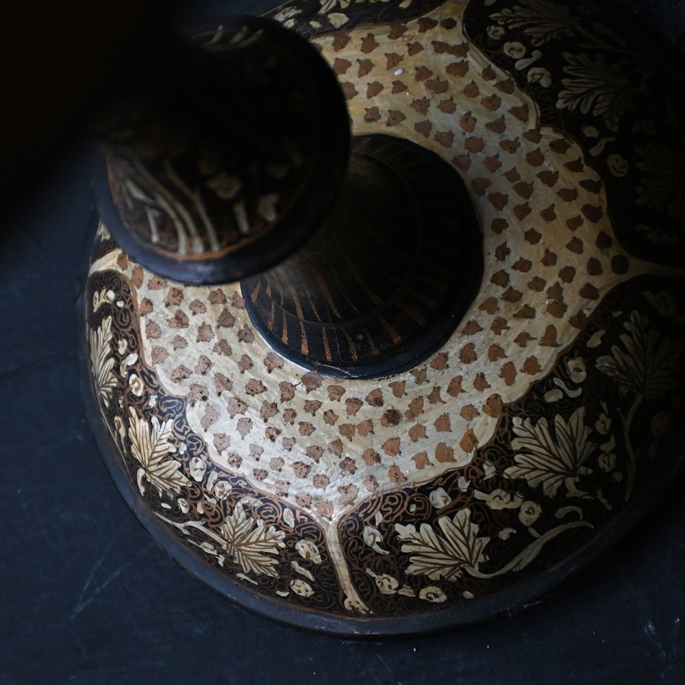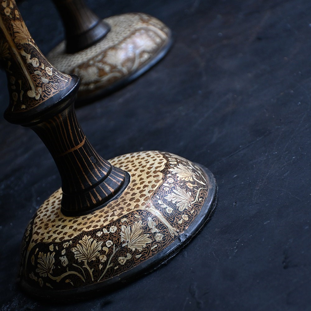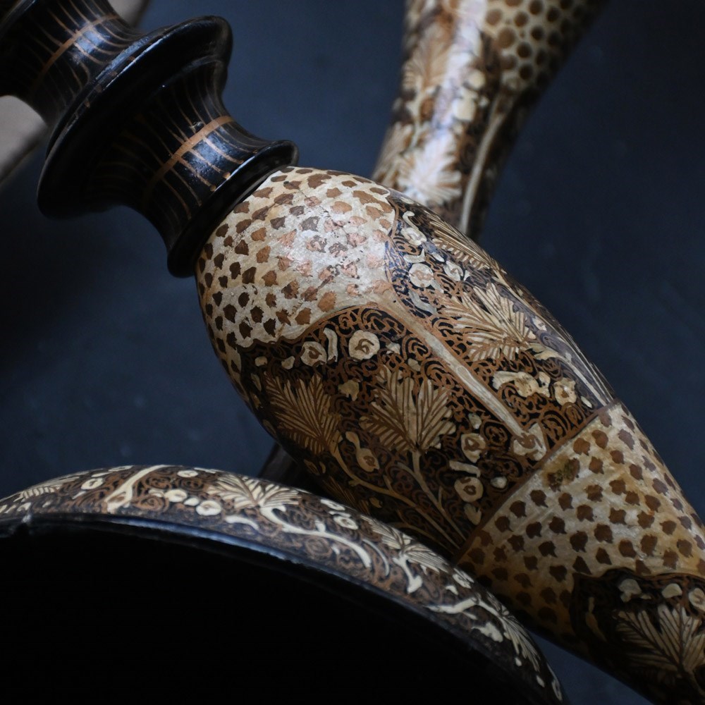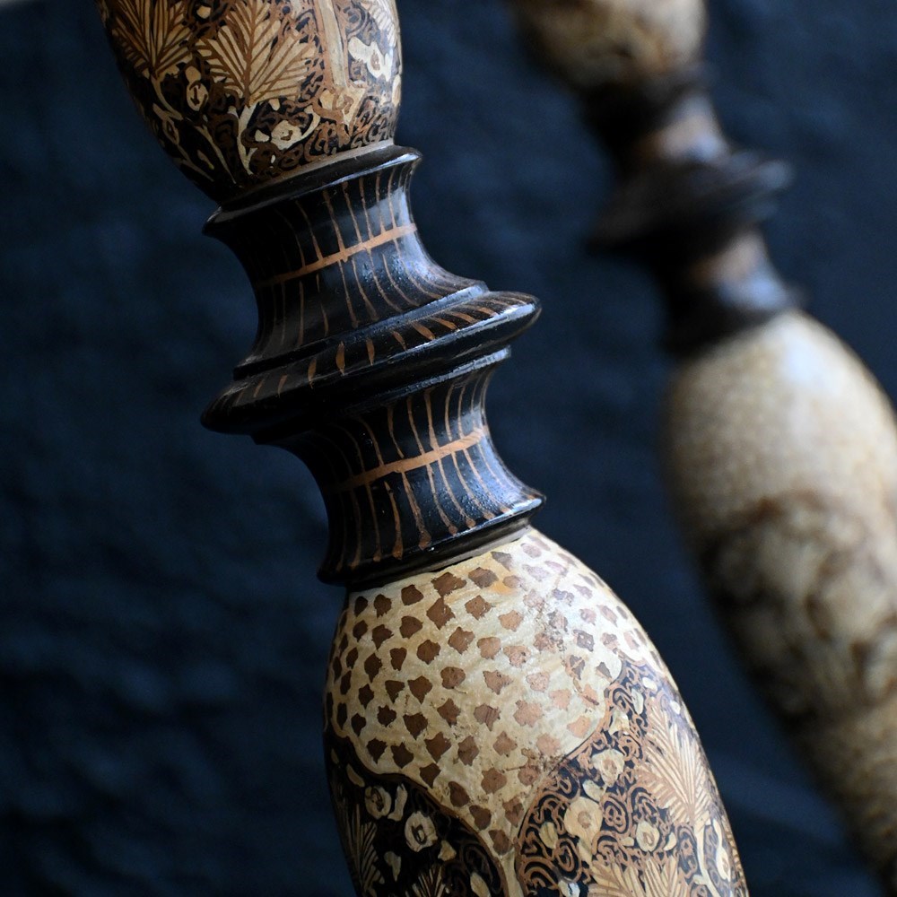 A highly decorative and functional matched pair of early to mid-20th Century hand crafted Kashmiri lights. Painted with cream and gold floral patterns on an ebonised black surface, these highly decorative lights have been rewired with new neutral-coloured shades as shown.