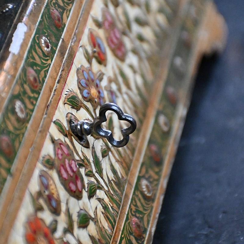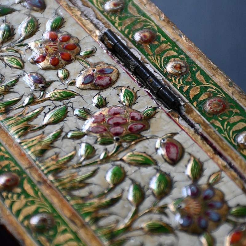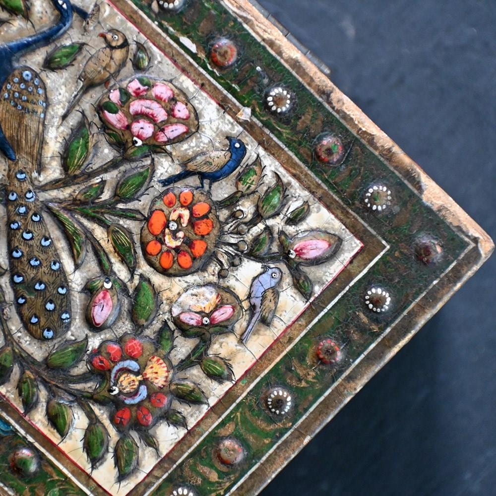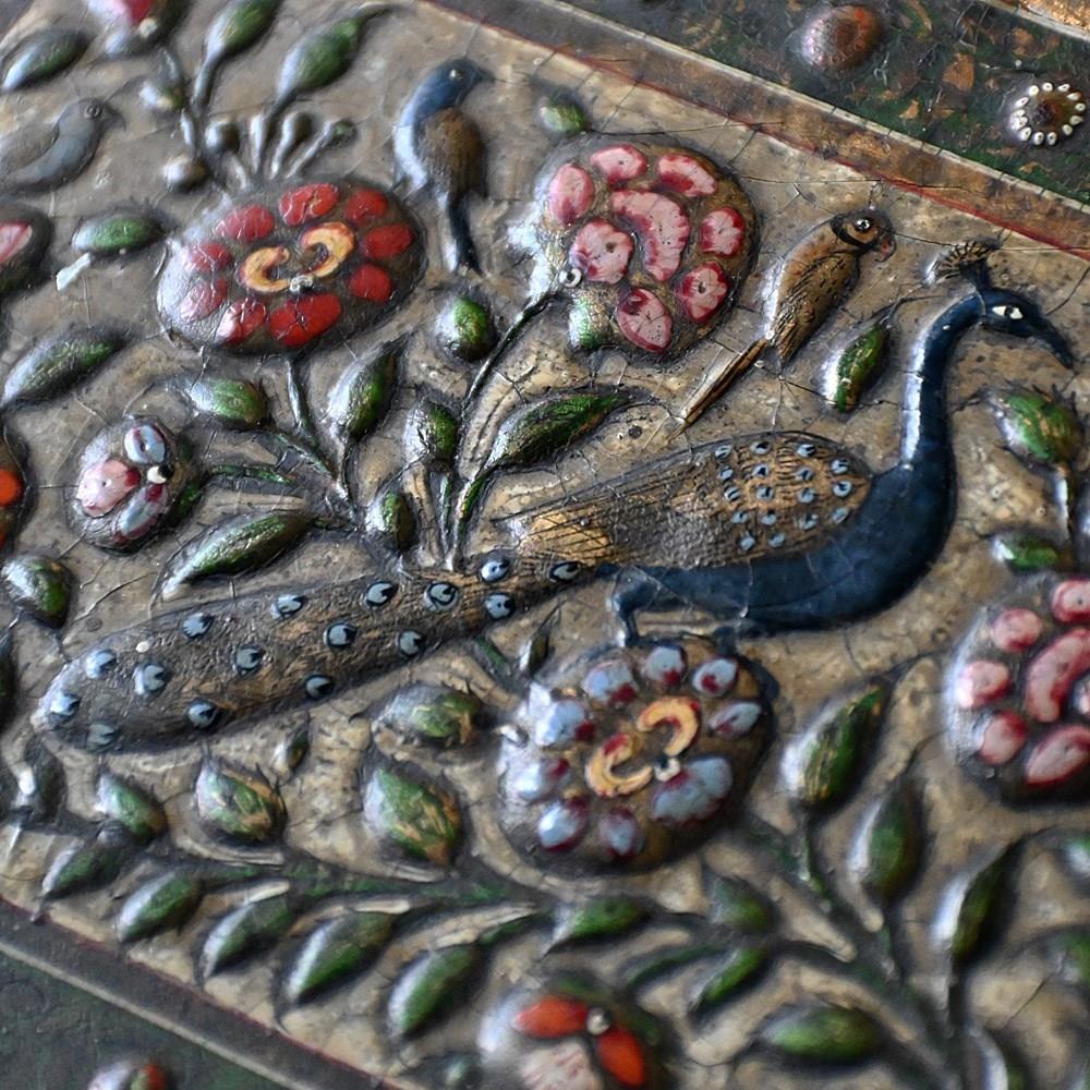 A true work of art, this mid-19th Century Kashmiri hand-crafted trinket box is covered in beautiful detail. Including peacocks, birds, flowers, and foliage. The hand painted detail is raised from the box with gold gilded paint and vibrant colours. The box is hinged with its original key and painted orange inside, this example would likely have been owner by a wealthy individual considering the amount of detail and craftsmanship that has gone into creating it, A rare survivor.