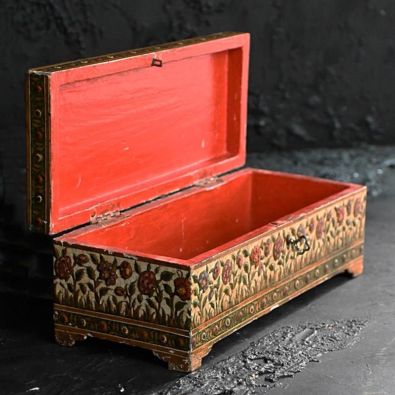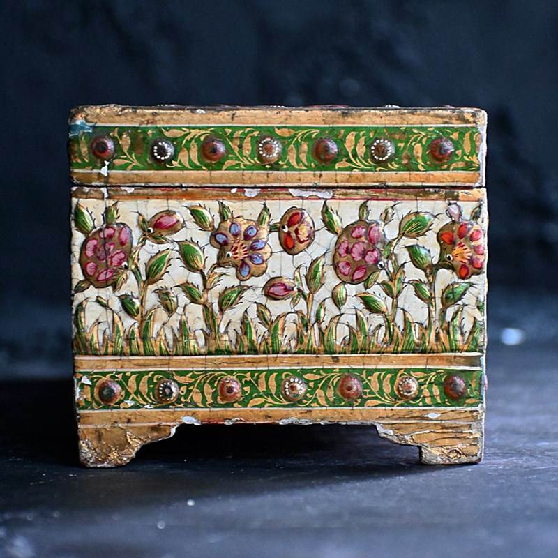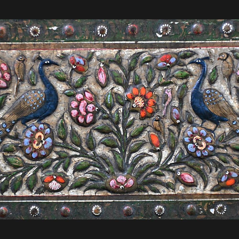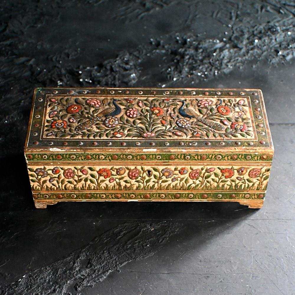 A true work of art, this mid-19th Century Kashmiri hand-crafted trinket box is covered in beautiful detail. Including peacocks, birds, flowers, and foliage. The hand painted detail is raised from the box with gold gilded paint and vibrant colours. The box is hinged with its original key and painted orange inside, this example would likely have been owner by a wealthy individual considering the amount of detail and craftsmanship that has gone into creating it, A rare survivor.