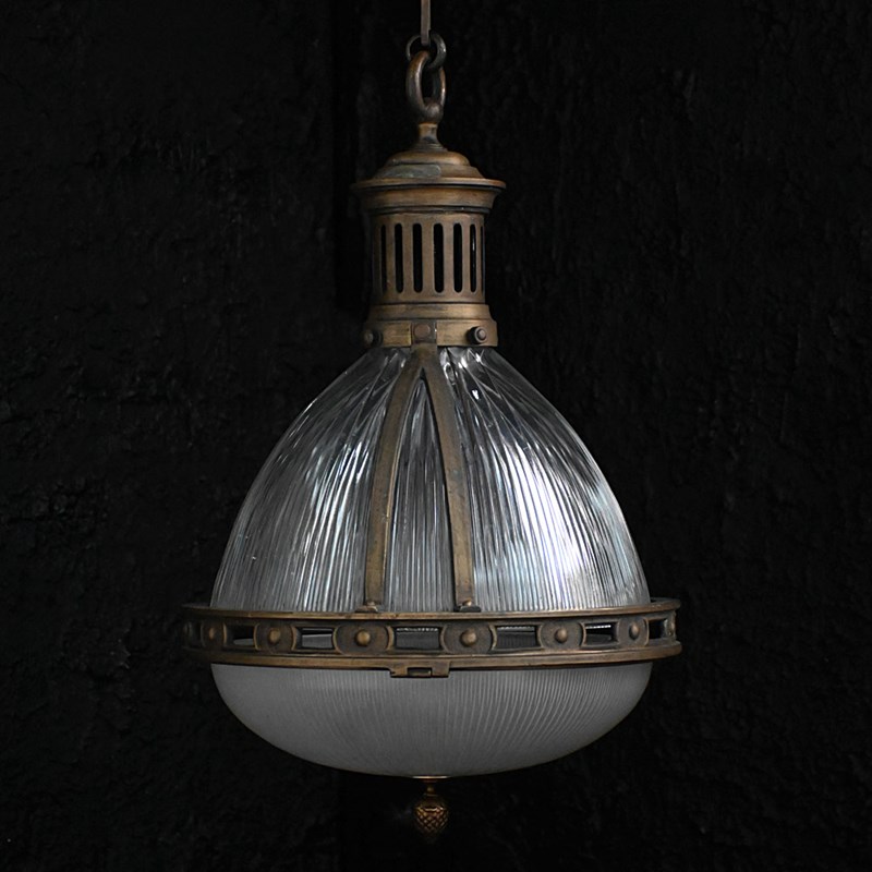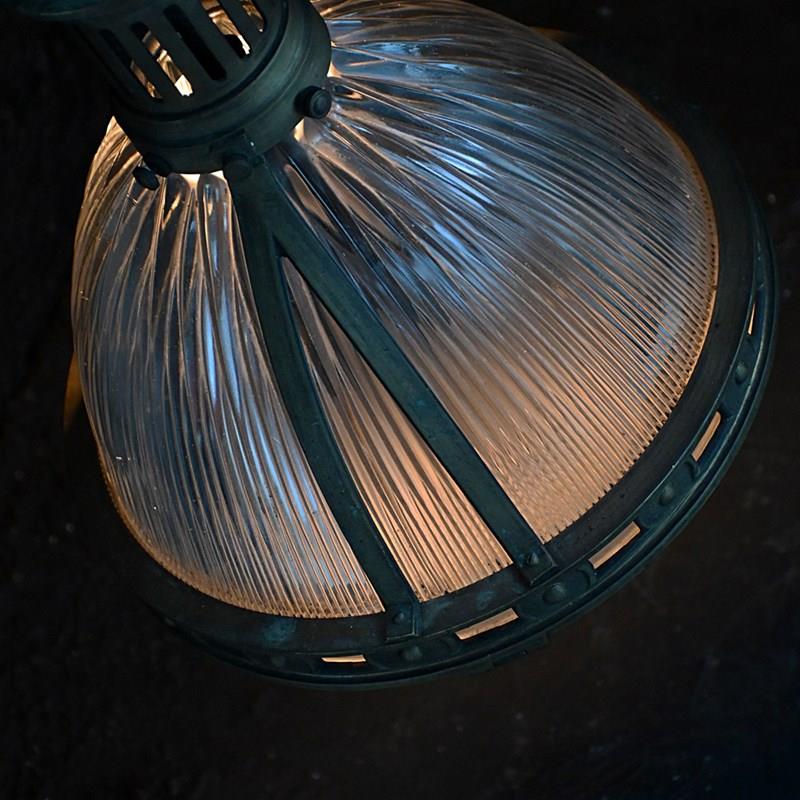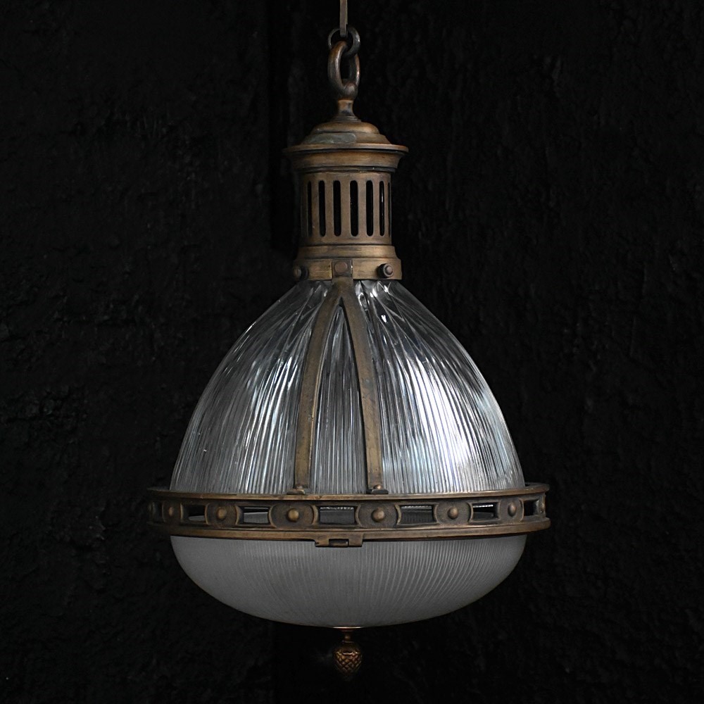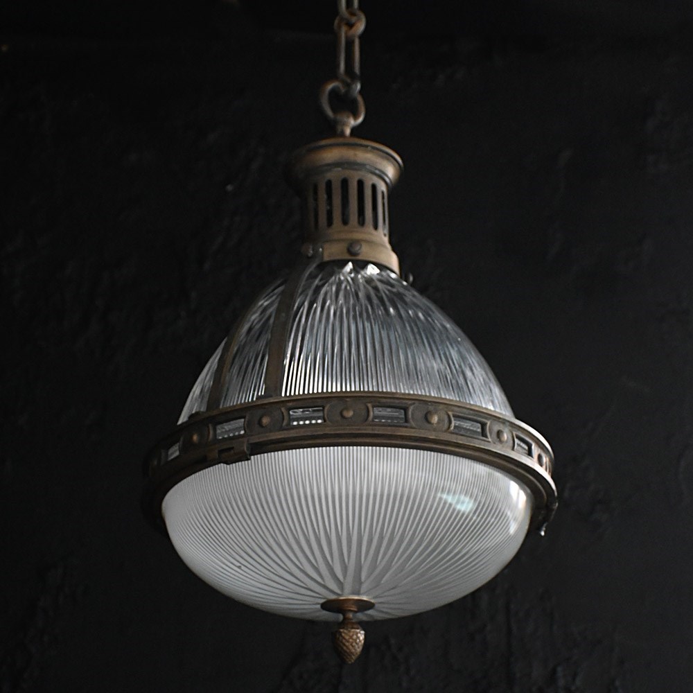 A huge early 20th century French Holophane glass and brass caged gallery with hanging chain. With a stunning illuminated glow and small acorn addition to its base. This item is not wired but can be by a professional to your needs.