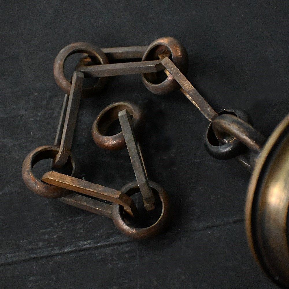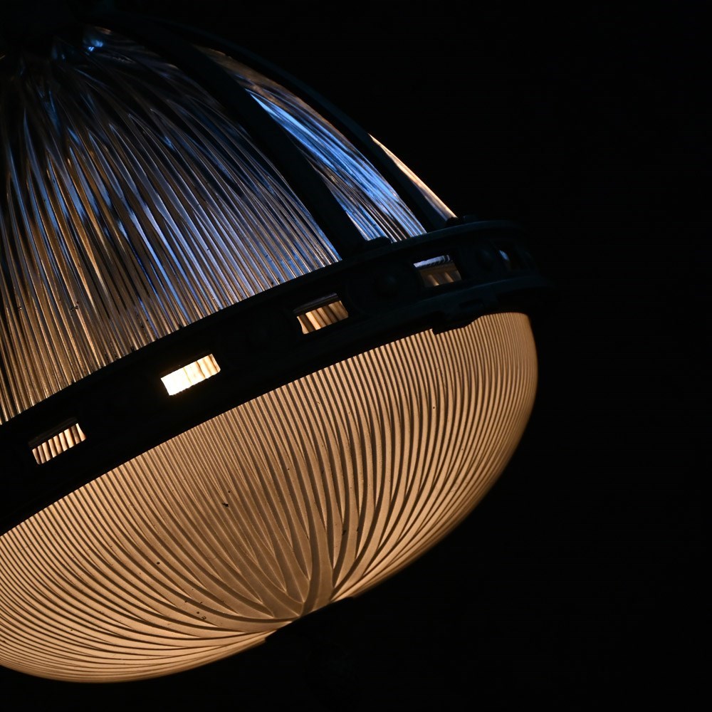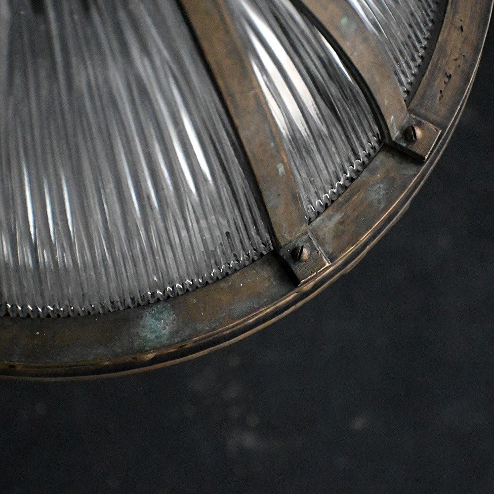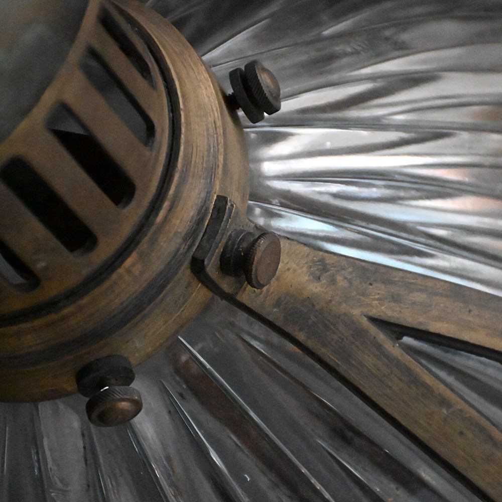 A huge early 20th century French Holophane glass and brass caged gallery with hanging chain. With a stunning illuminated glow and small acorn addition to its base. This item is not wired but can be by a professional to your needs.