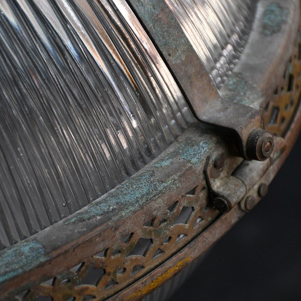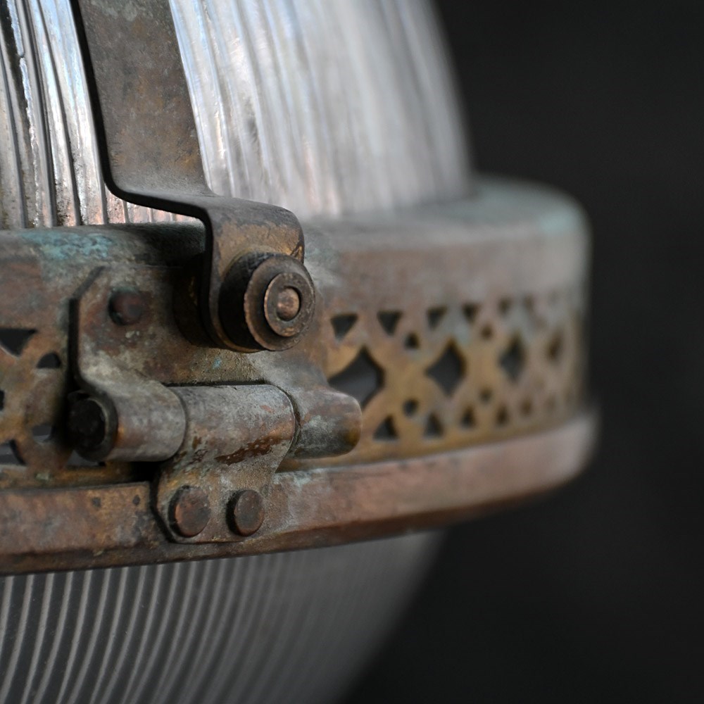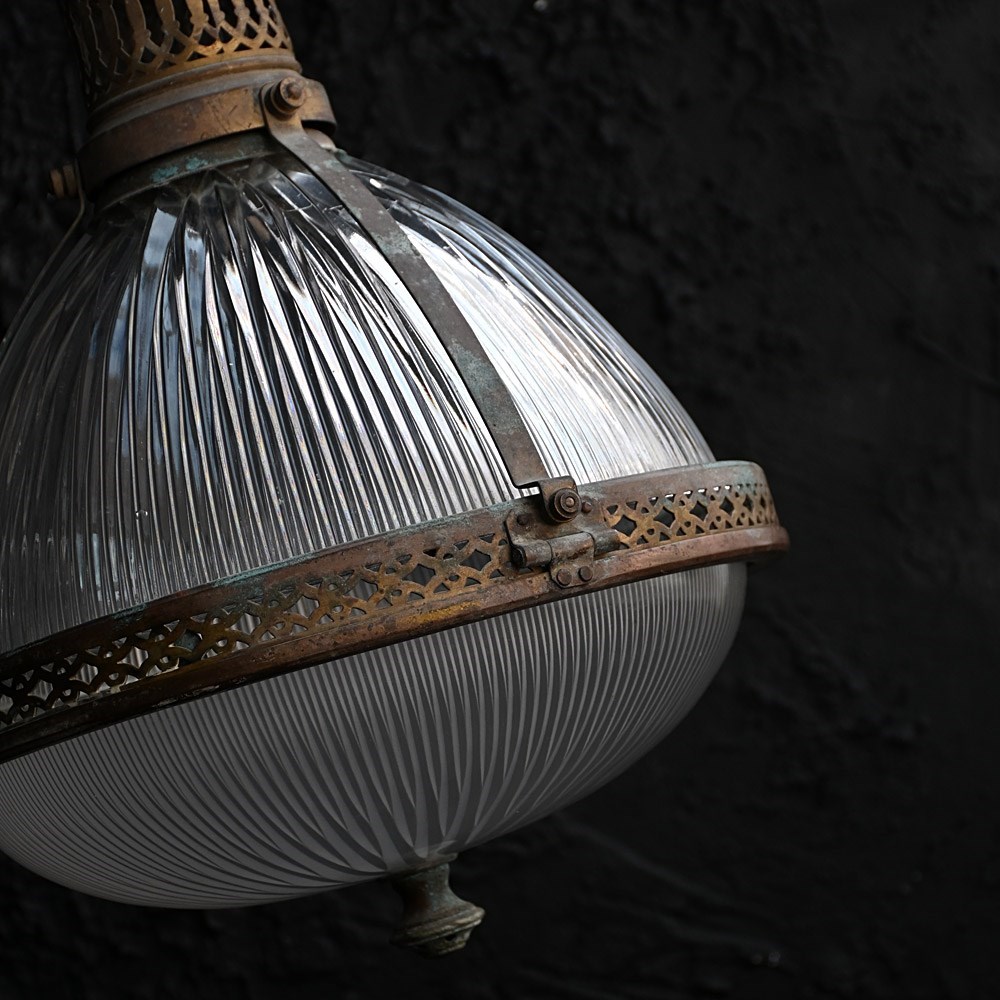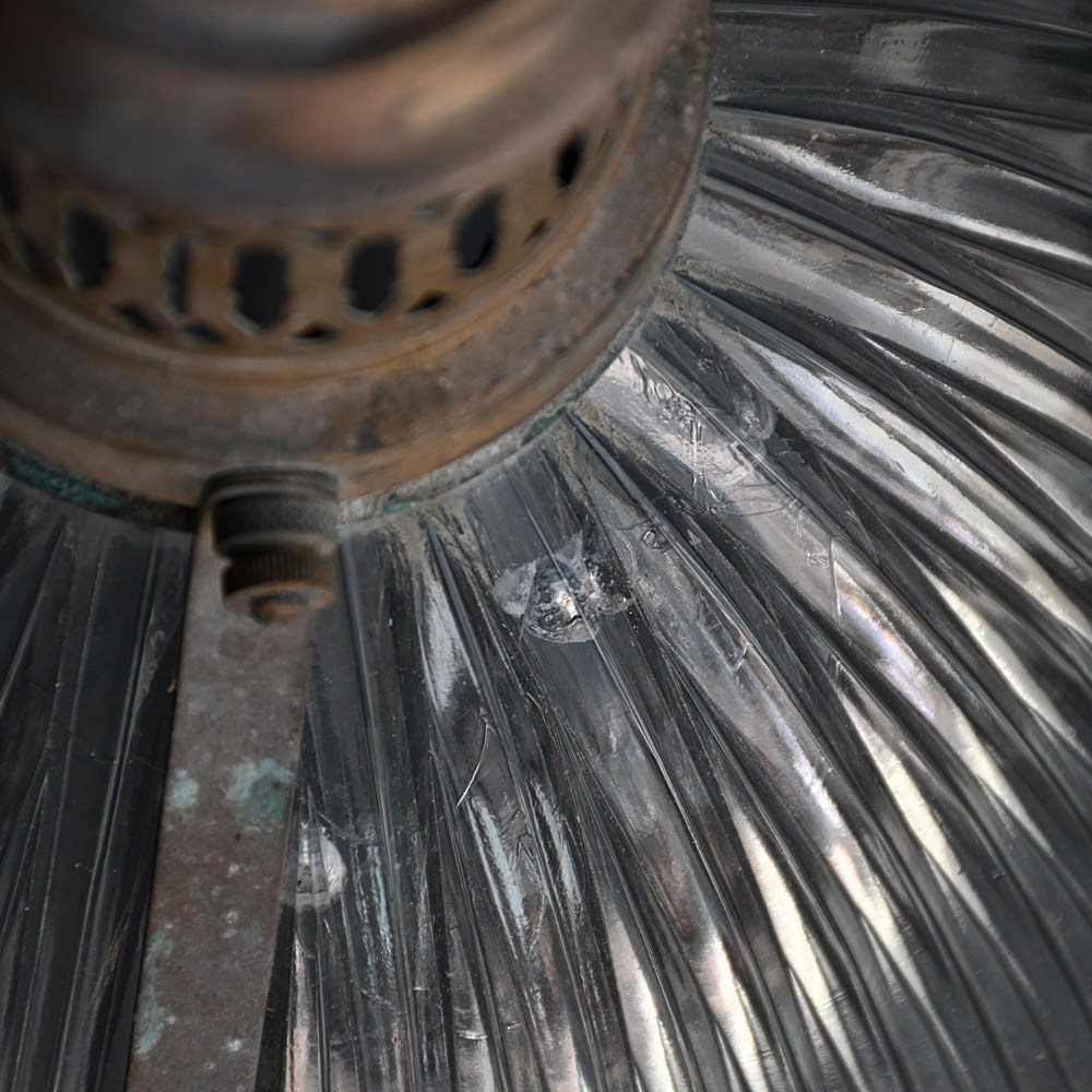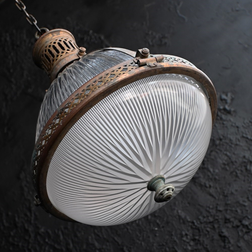 With an internal section of damage to the top of this light that doesn’t effect its ability to hold a soft sharp light. The metal across this light is covered in a natural patina. This pendant is unwired but can easily be rewired by a professional to suit your needs. In overall good condition considering its age and obvious use.
