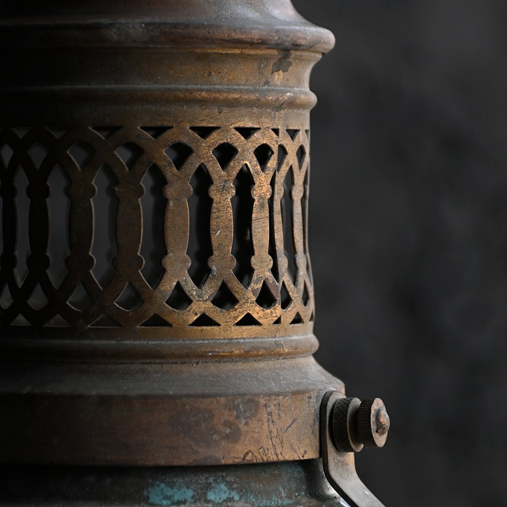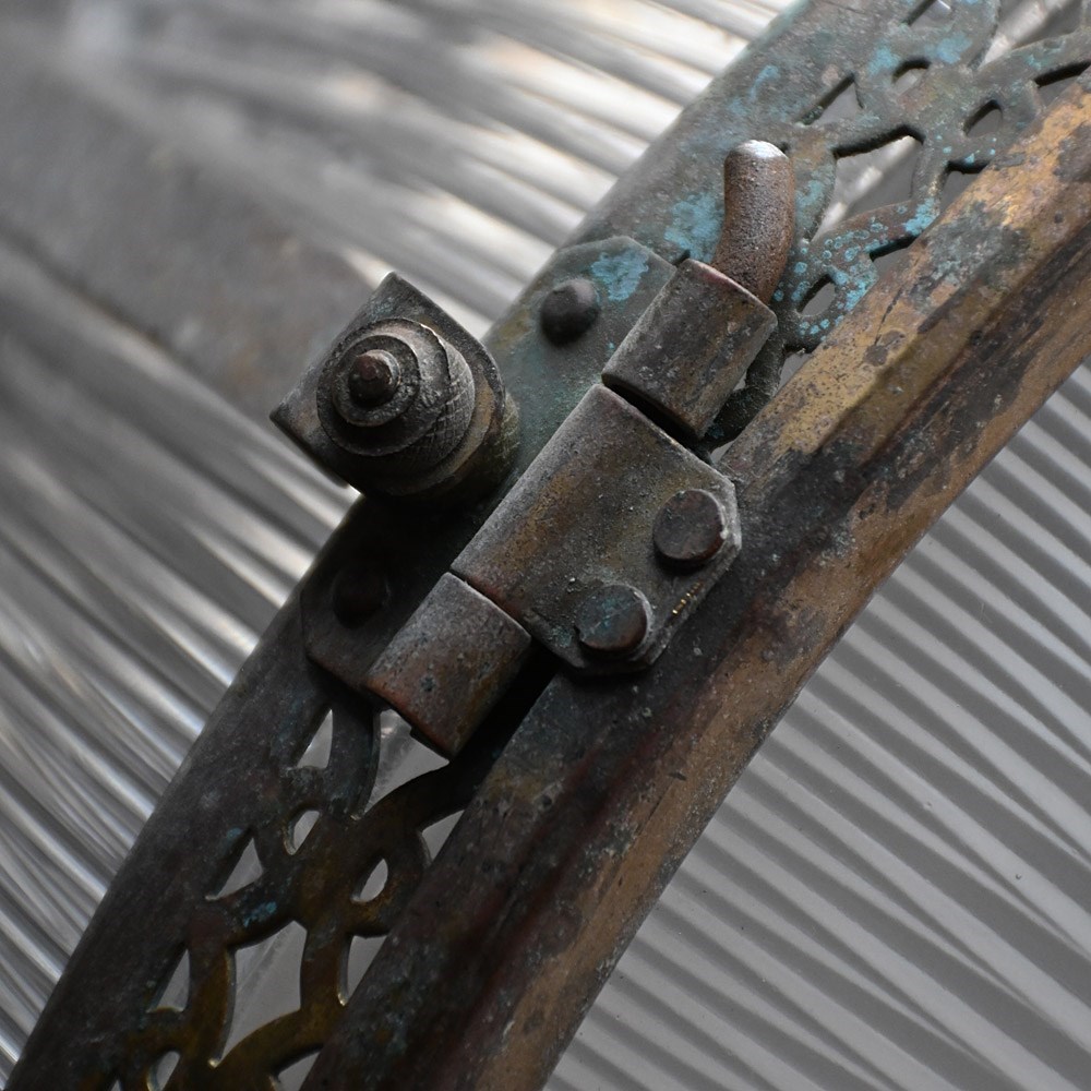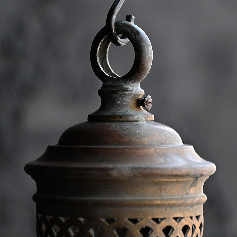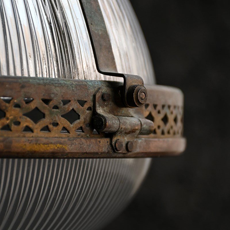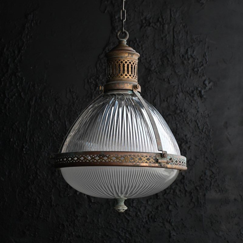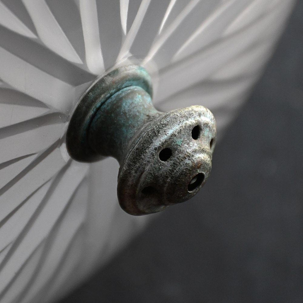 With an internal section of damage to the top of this light that doesn’t effect its ability to hold a soft sharp light. The metal across this light is covered in a natural patina. This pendant is unwired but can easily be rewired by a professional to suit your needs. In overall good condition considering its age and obvious use.
