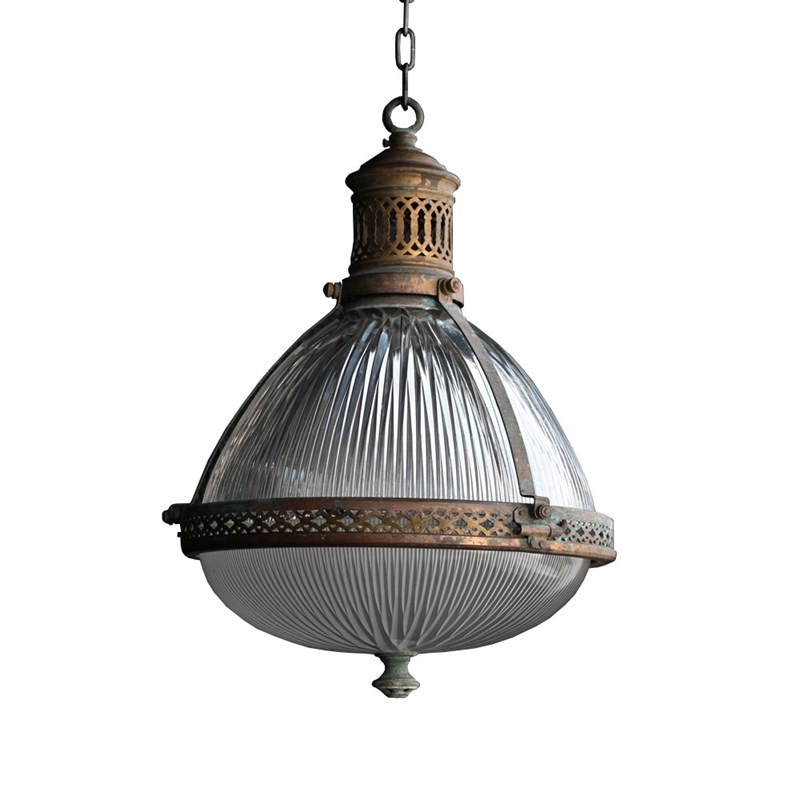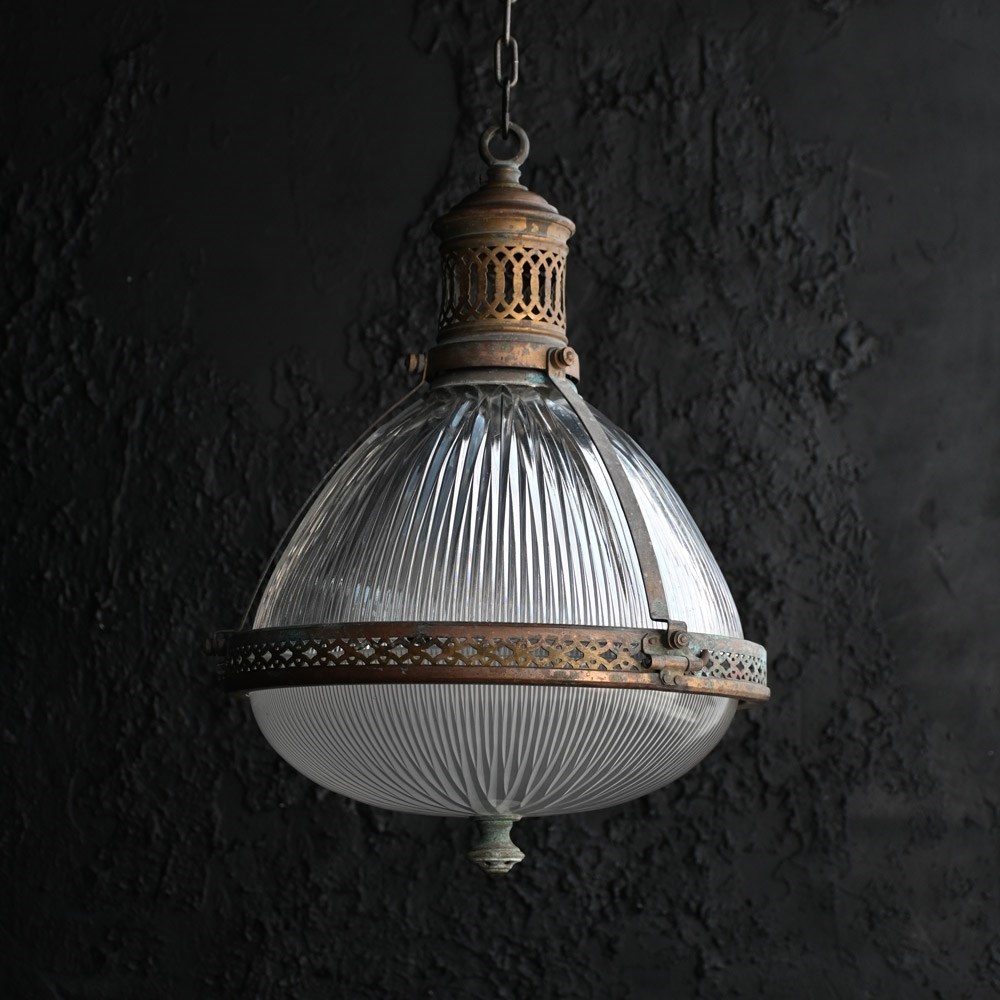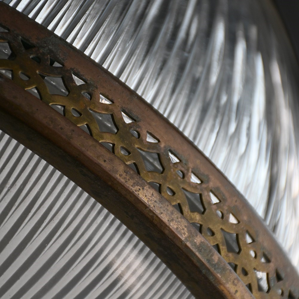 A large example of an early 20th Century Holophane pendant light. Constructed of hand cut glass and brass. With a natural deep patination covering the metal area of this highly decorative interior lighting fixture.