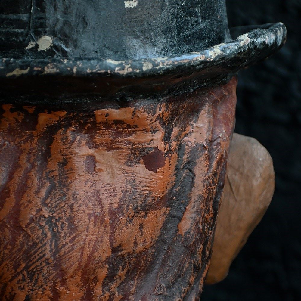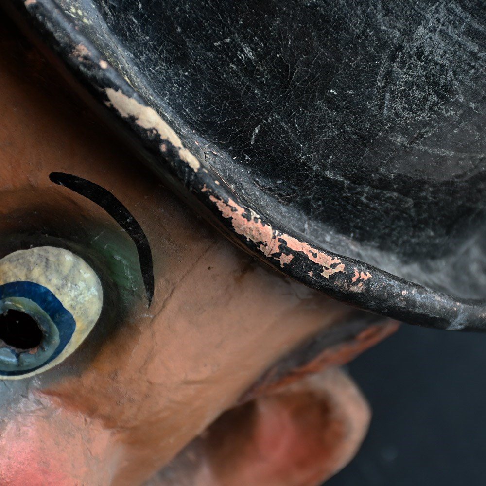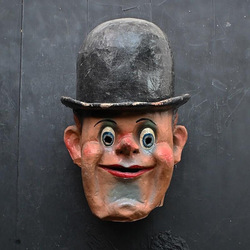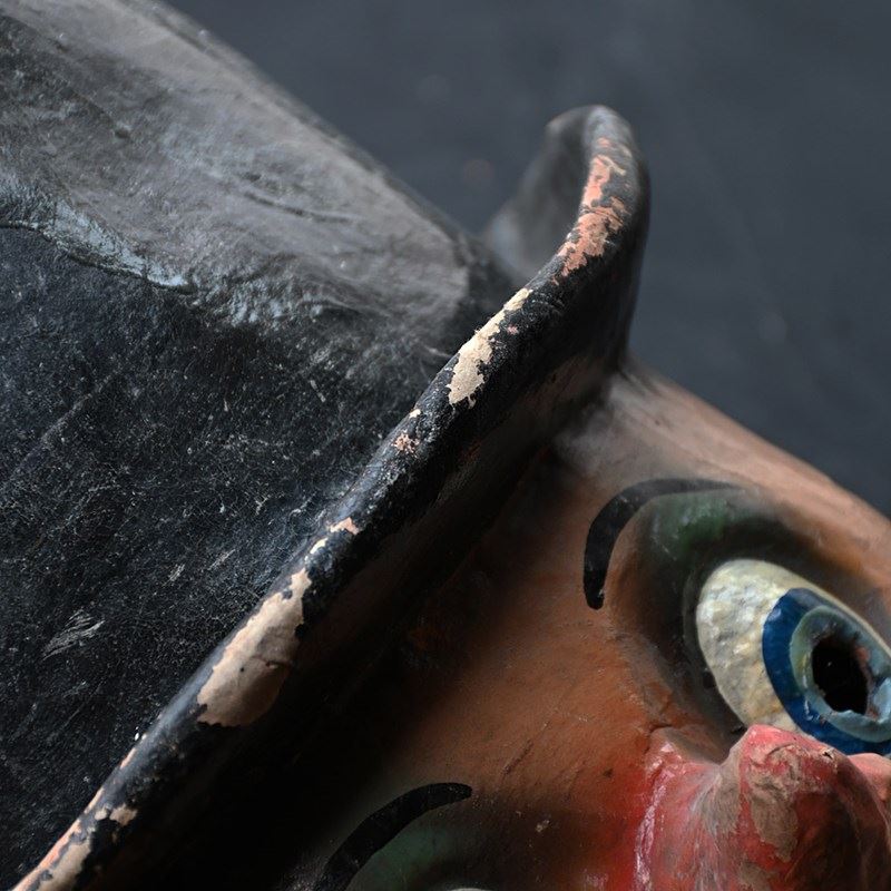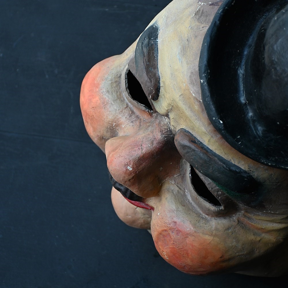 A quirky matched pair of hand-crafted papier mache mid-20th Century French theatre masks. In the form of the world-renowned movie stars and comedians Laurel and Hardy. Both these items show good age and would have been used to entertain audiences in theatres across Paris at one point.