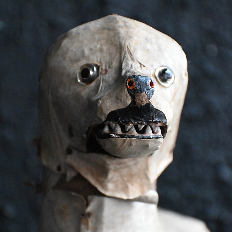 A very unusual and quirky example of an early 20th century English folk art articulated weighted jaw toy dog. Made from some kind of thin leather material (Faux) over a wooden and paper form. With thin metal wheels, glass eyes, wired tail and wooden teeth. This item would likely have been covered in some sort of fur at one point as some remanence is still present. The mouth opens and close which is attached to a lead weight inside the head. A rare object when back in the day when toys were made with love and care.