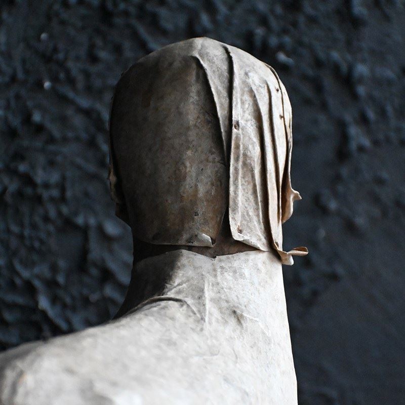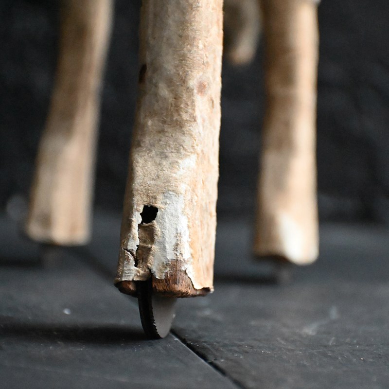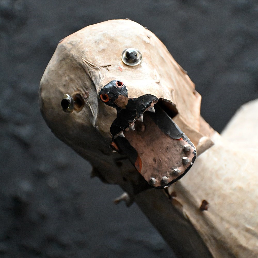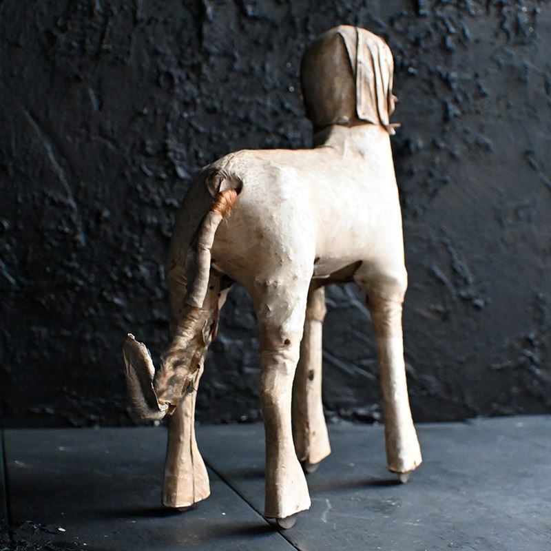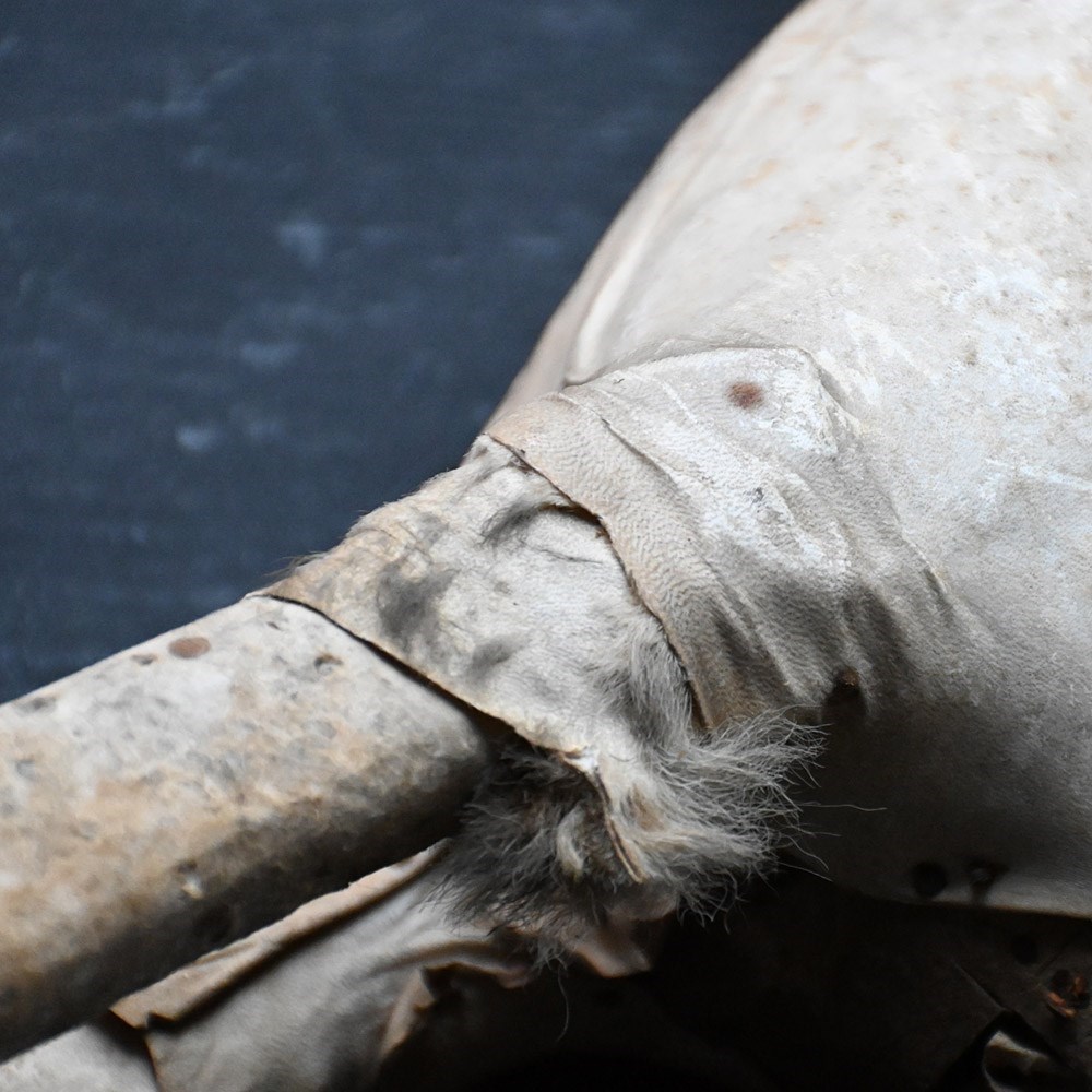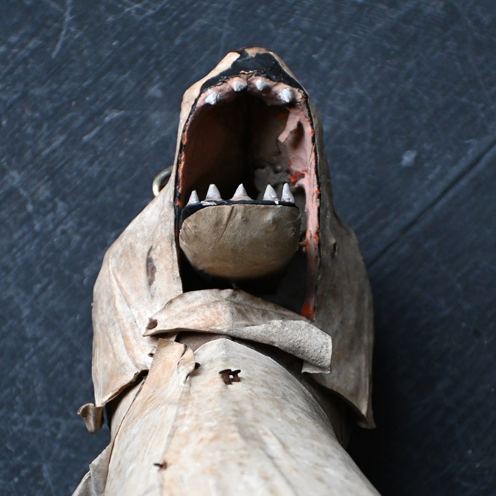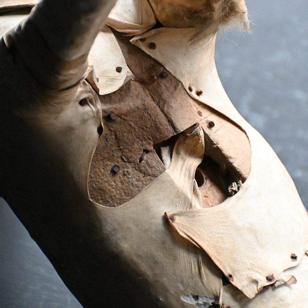 This item is aged naturally, a deep patination across all its surface as shown, an old used object that has missing detail, frayed areas, and rust to the metal sections. The leather material is missing and loss in areas, one of the glass eyes moves when the mouth is opened and closed. It’s an old decorative object so please expect age and loss in all this item please. Its firm in form and not wobbly.
