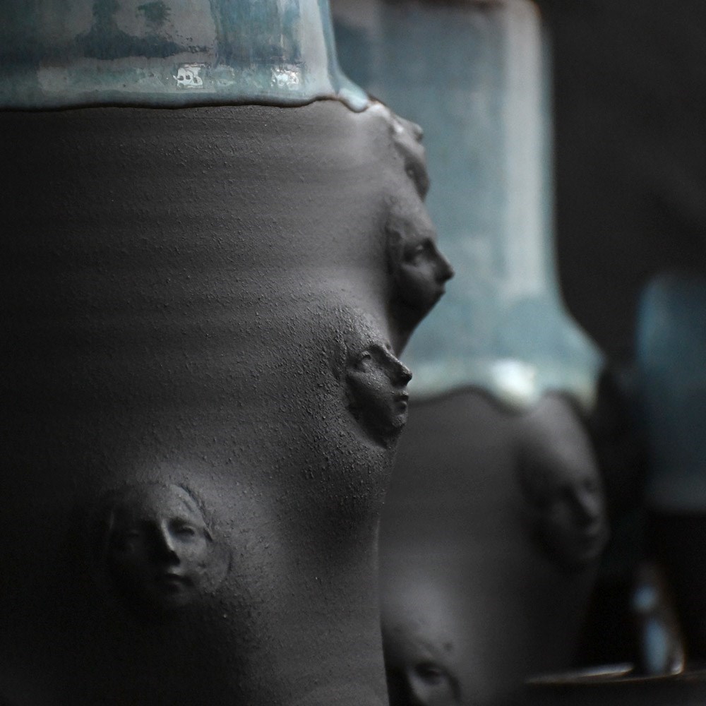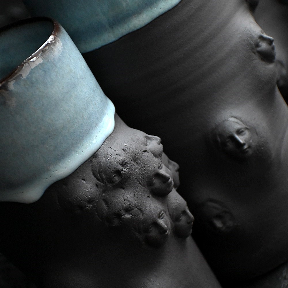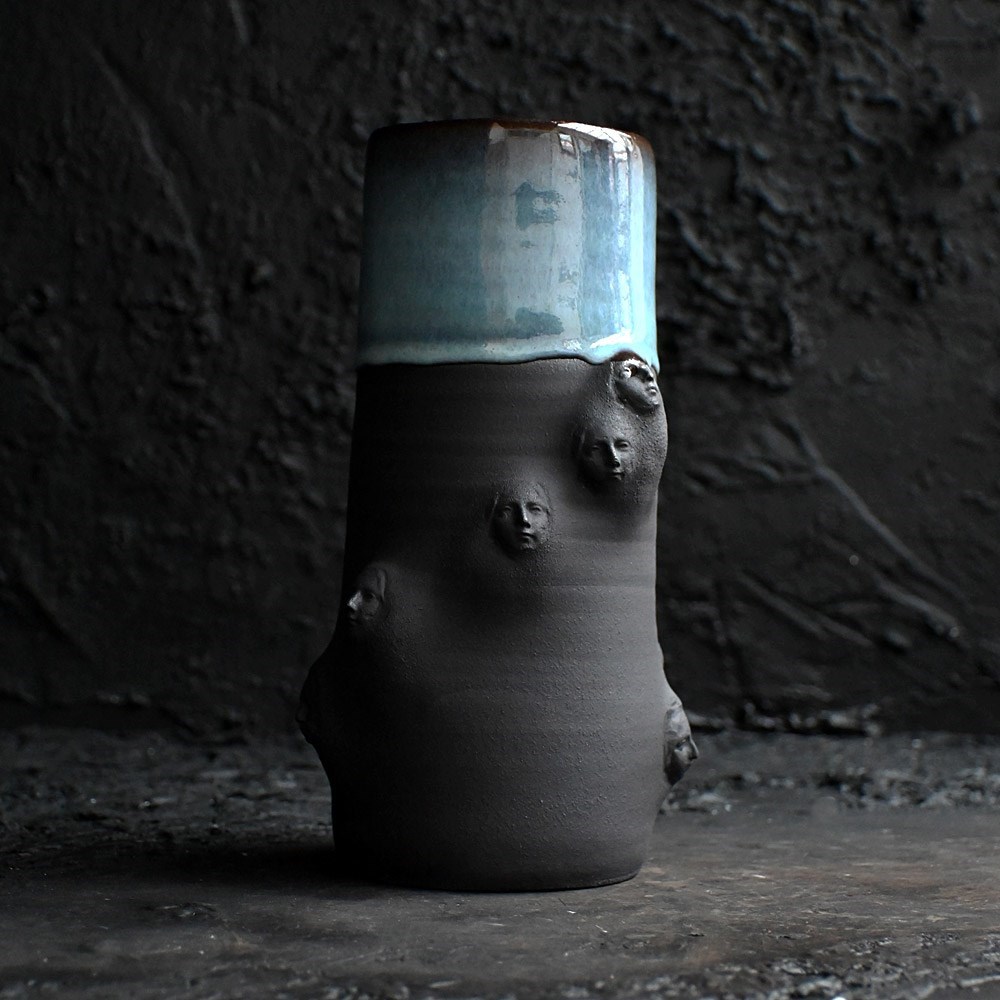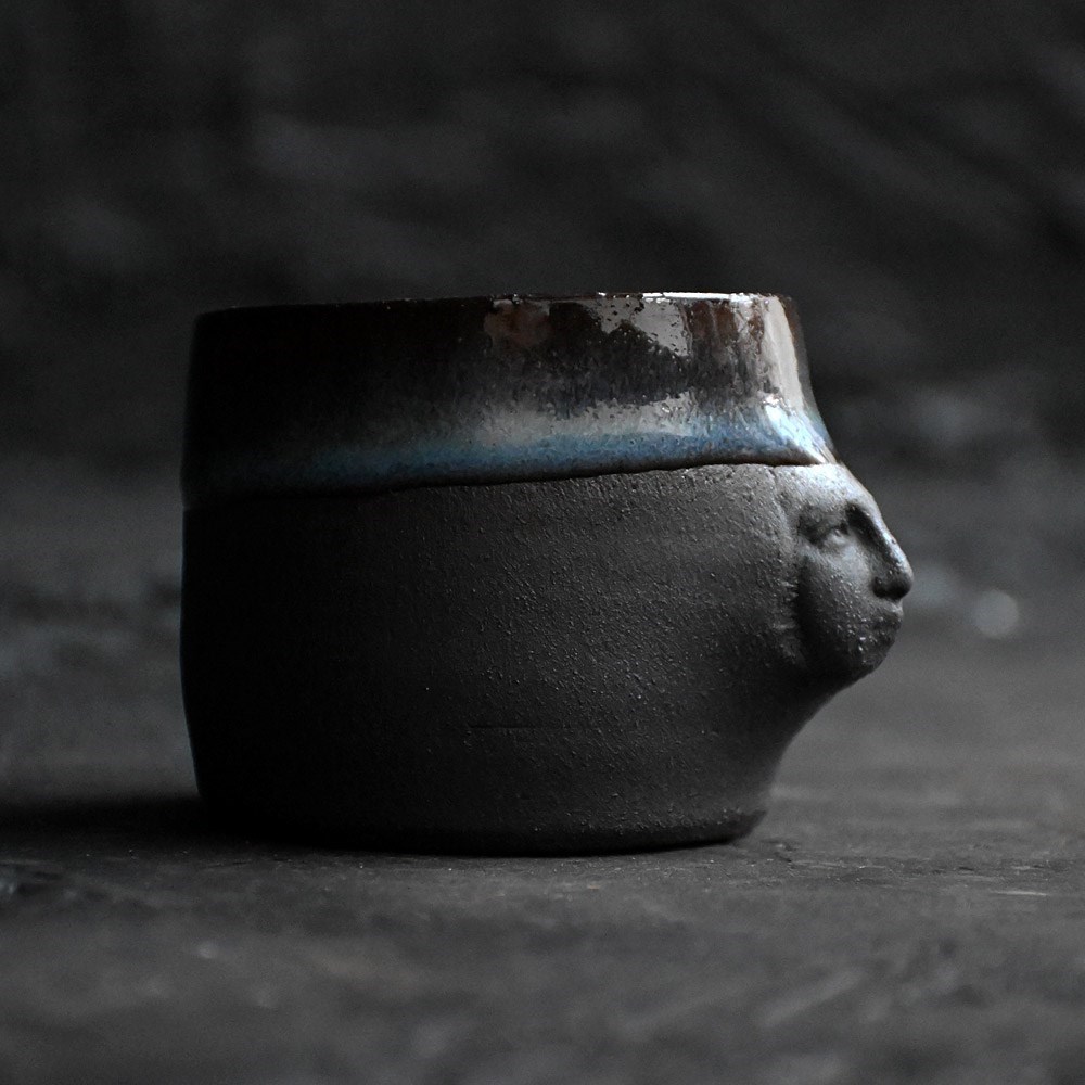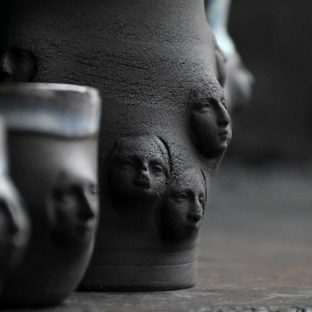 Collection of artistic hand sculpted ceramic Madonna faced vessels in black with halo glazed rims. Five display vessels and 2 small sake cups one with bespoke spoon.