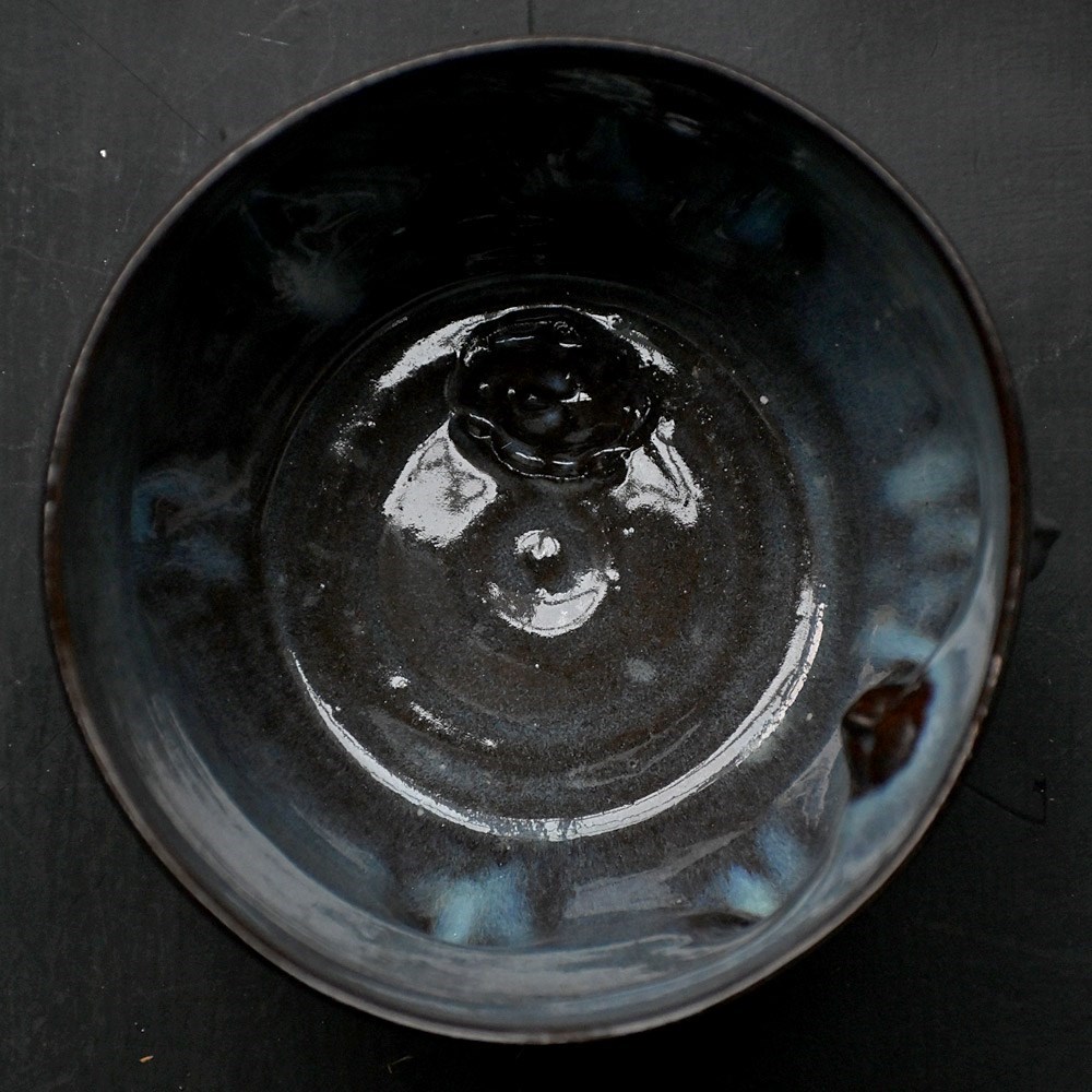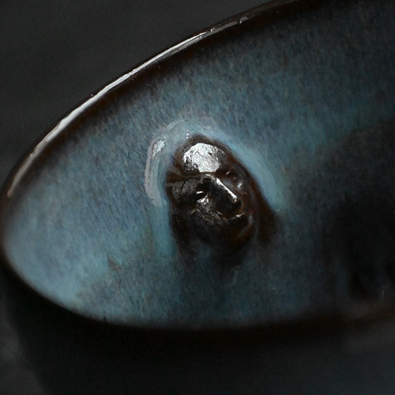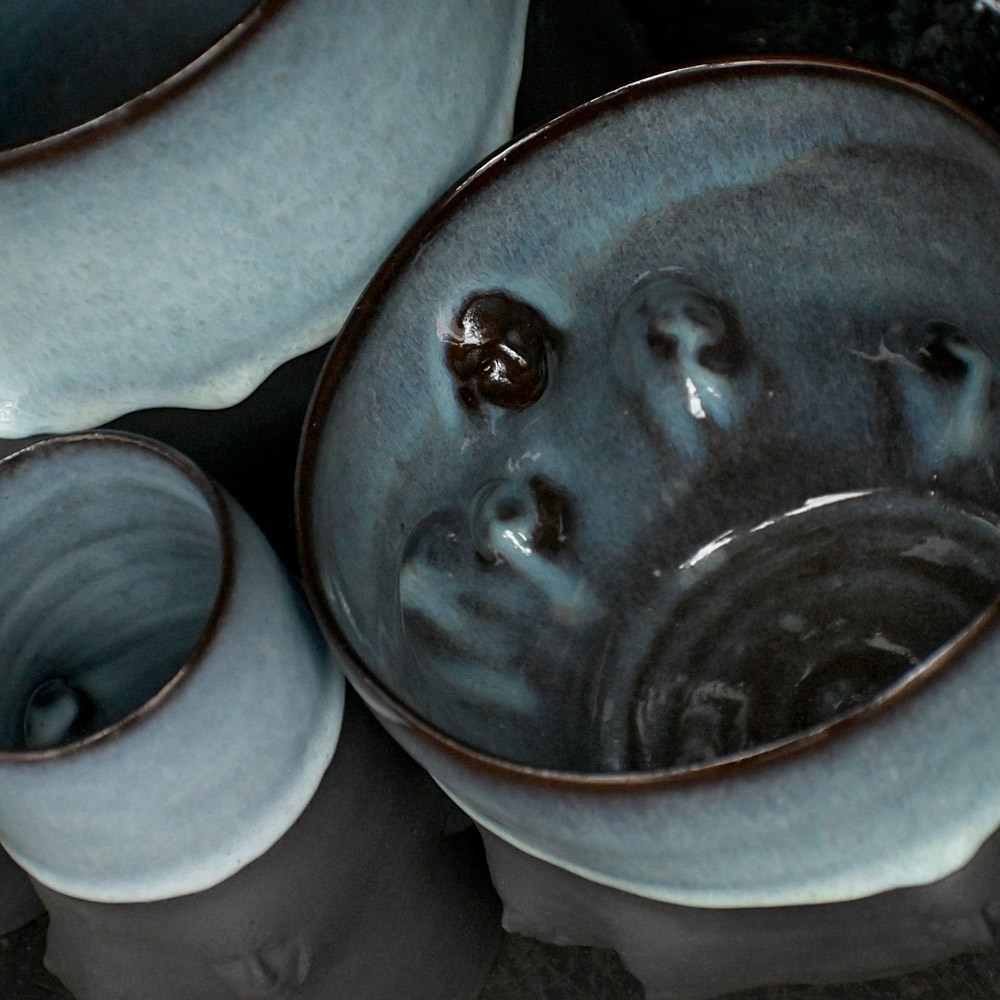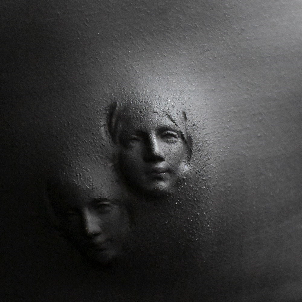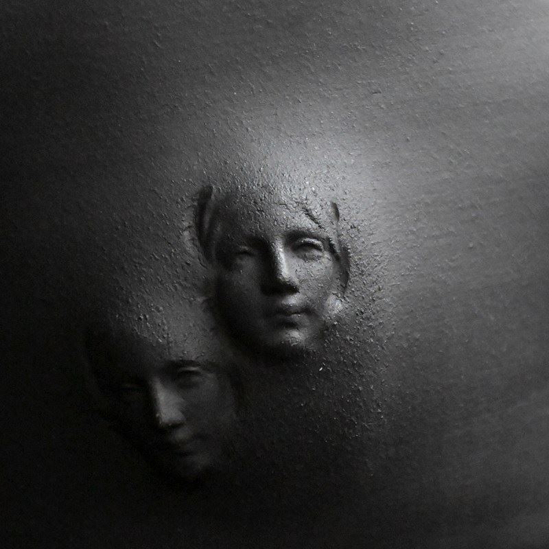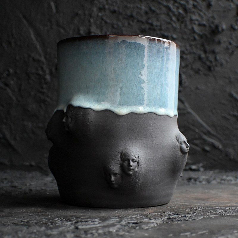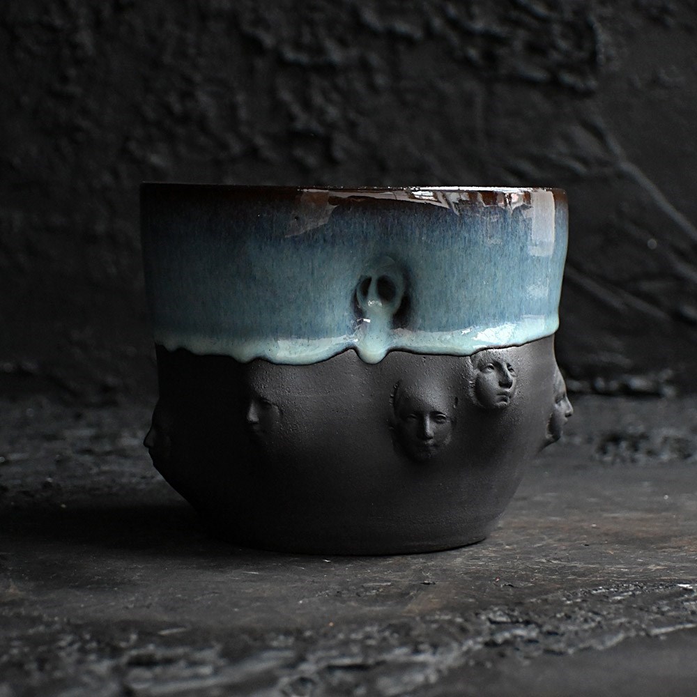 Collection of artistic hand sculpted ceramic Madonna faced vessels in black with halo glazed rims. Five display vessels and 2 small sake cups one with bespoke spoon.