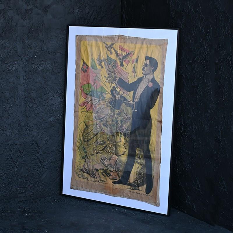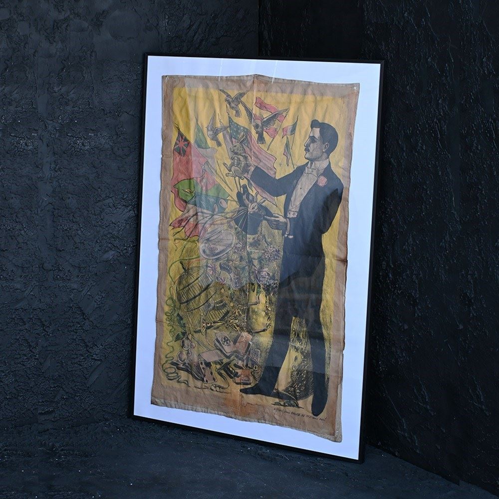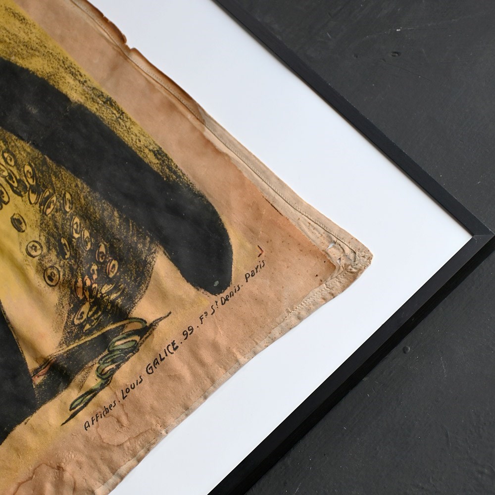 A rare example of a late 19th century lithograph on canvas Paris magician’s promotional poster. By Efficher. Louis GALICE. 99. F9 St. Denis. Paris. With vibrant colours and still in good condition considering its age and obvious use. Illustrating a magician pulling a rabbit out of a hat. In the backdrop are playing cards, a bird cage, birds, a fishbowl, flowers and several international flags.