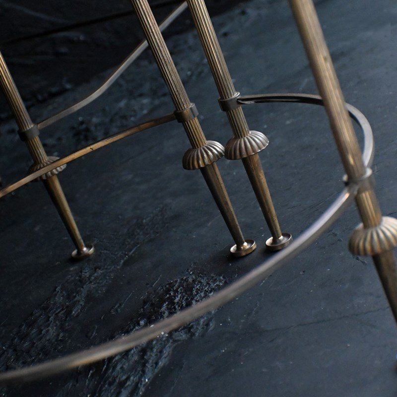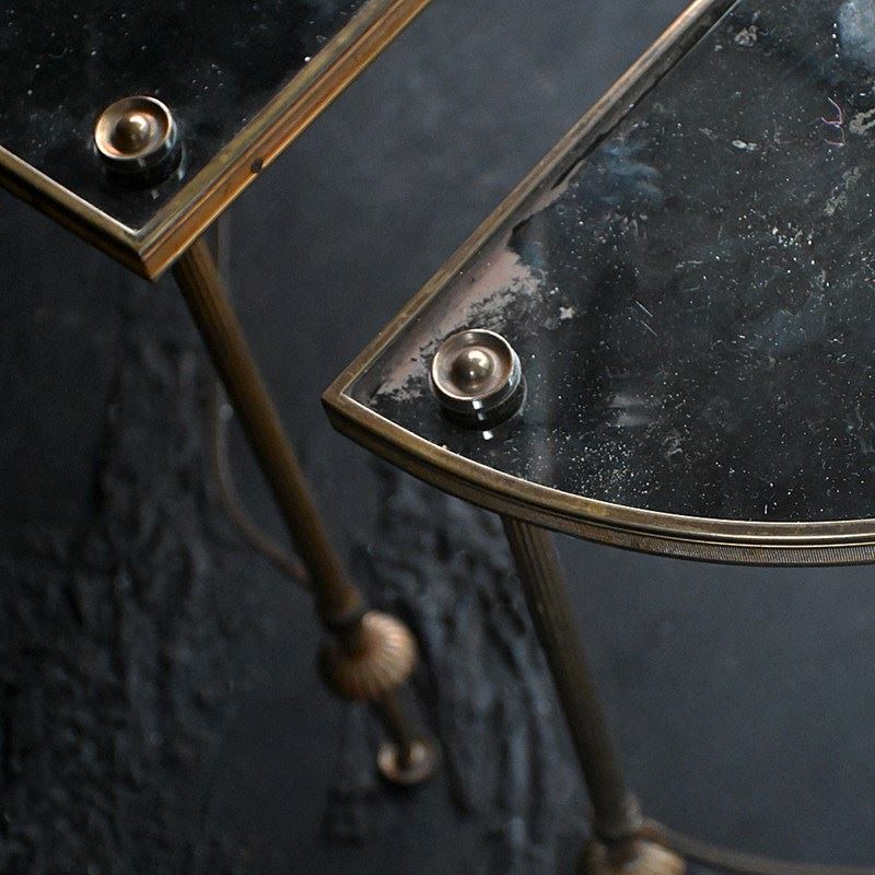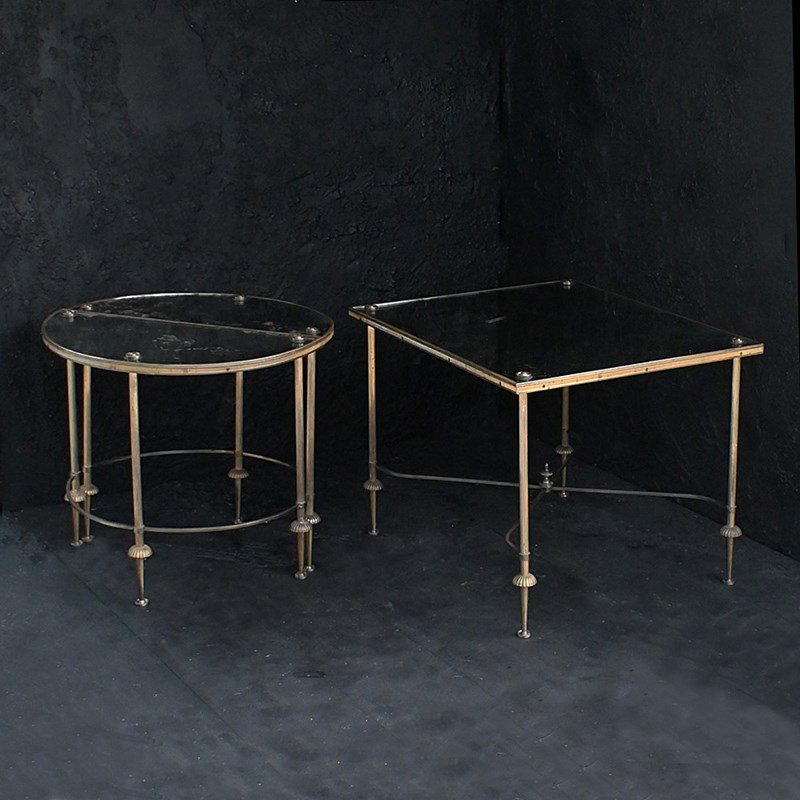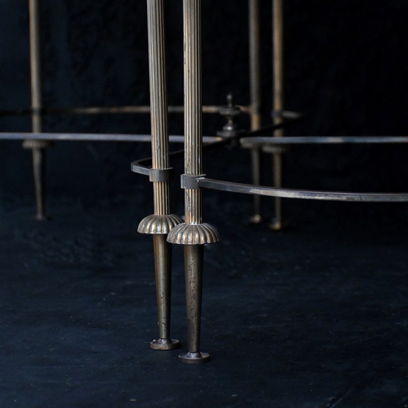 An elegant early 20th Century tripartite (3 part) verre églomisé, Maison Baguès coffee table. Reeded brass legs with fluted detail and a decorative centre finial. Useful demi lune side tables, which can be used separately or in conjunction with the main table, with original glass with light surface wear.