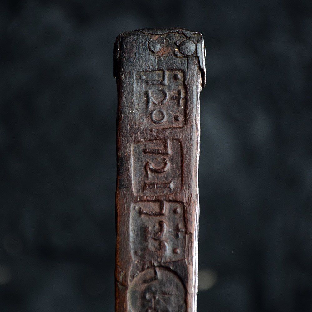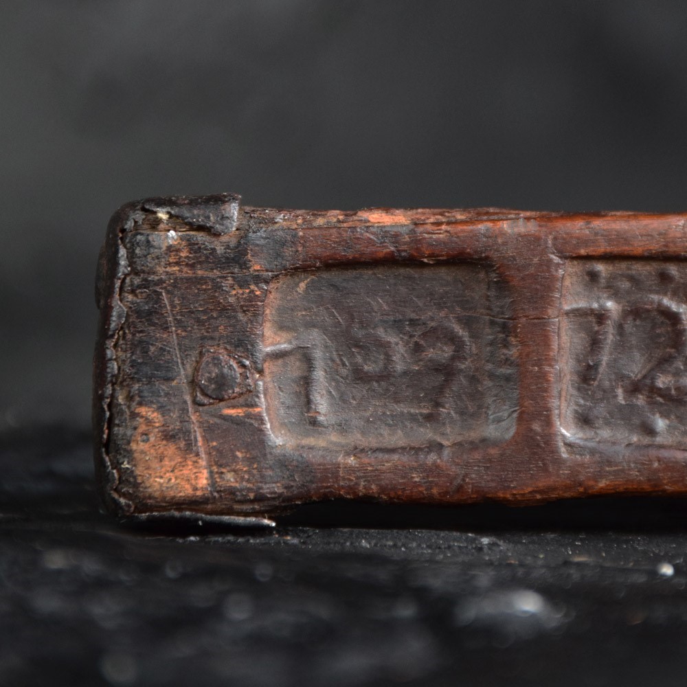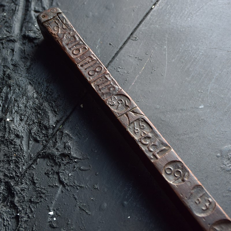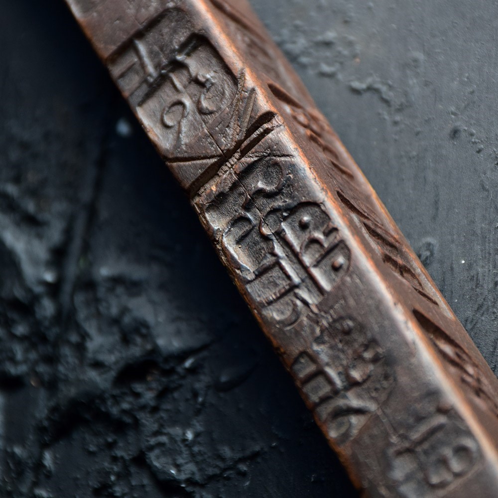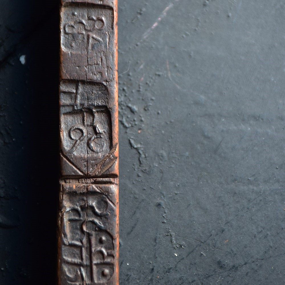 One of the most unusual and tactile objects we have uncovered for our store. A hand carved early 19th century four sided numerically detailed measuring stick of sorts. Believed to be used as an instrument to measure bags of grain from the Tibetan regions. Both ends have a metal nailed section and loophole which could have been attached to a rope at some point. The patination and natural wear across the surface of this artefact is outstanding, a true work of art in our humble opinion.
