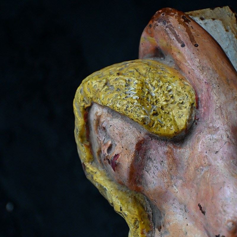 An early 20th century English maritime folk-art carving depicting a twin tailed mermaid surrounded by sea serpents. Hand carved from a single piece of dense wood, this sculptural fragment is believed to have originally formed part of a paired set and was likely mounted within a ship’s interior.