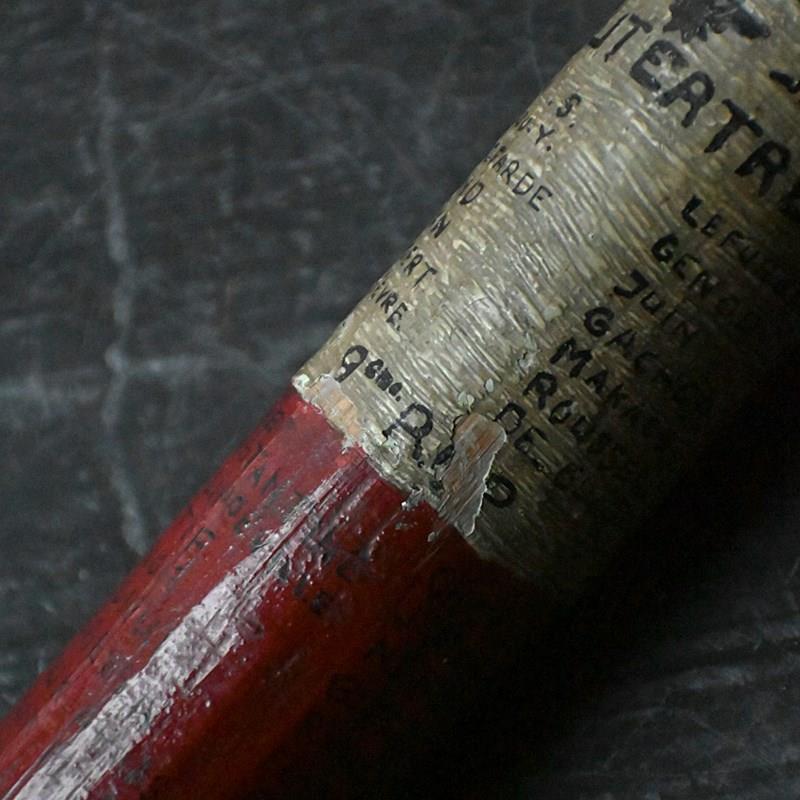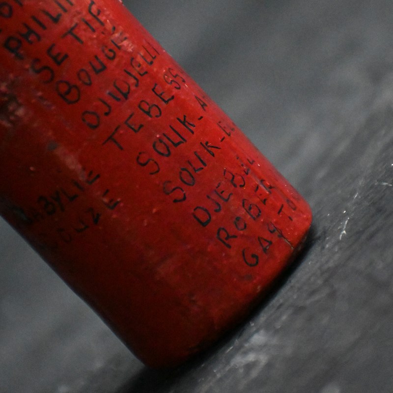 We believe this is an old skittle that has been turned into a leaving gift for someone who has finished their military service. The skittle is painted red, white and blue with black writing all around with various names and numbers.