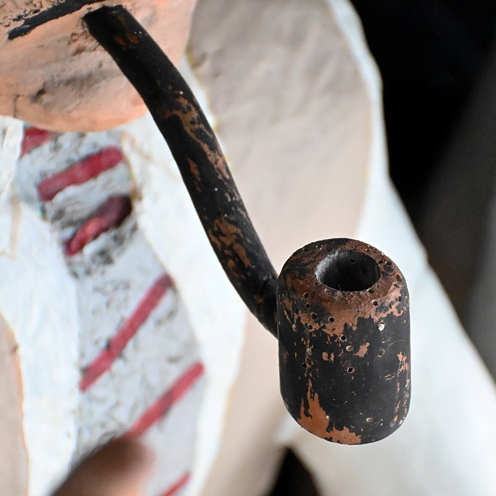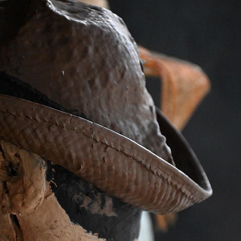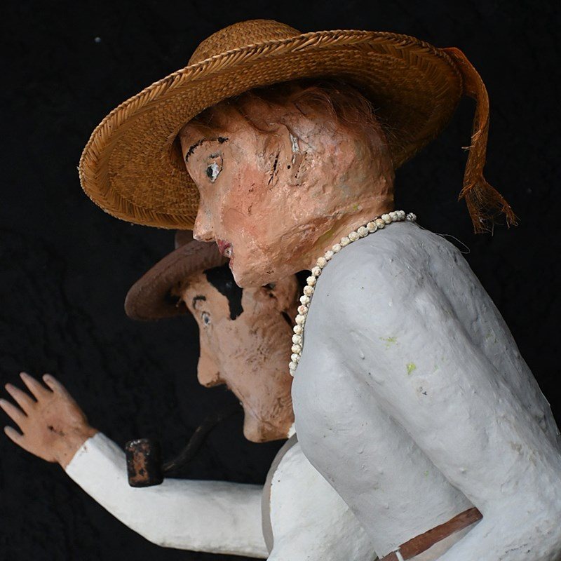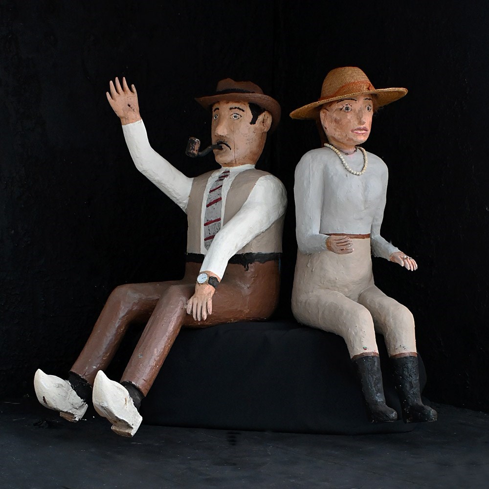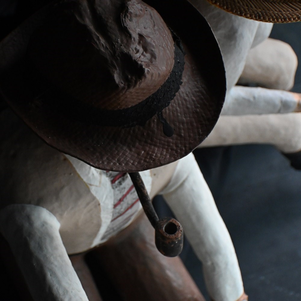 We sometimes create amazing things for the love of them, these two hand carved figures are just brilliant in our humble opinion. Seated with handcrafted detail, both in fixed seated position, we have been informed by the collector we uncovered them from that they sat outside a grocery store in the summer on a bench in Amsterdam for several years to attract customers and create an element of fun on the high-street for the shoppers passing by. The man is wearing a painted straw hat, smoking a pipe, wearing an old watch and clog shoes. The female has a woven straw hat, glass eyes, plastic necklace, old rings on her fingers and is overlayed with papier mache (both figures are heavy painted with a sheen paint that protects them from the elements. The male weighs roughly 12kg and the female about 8kg.