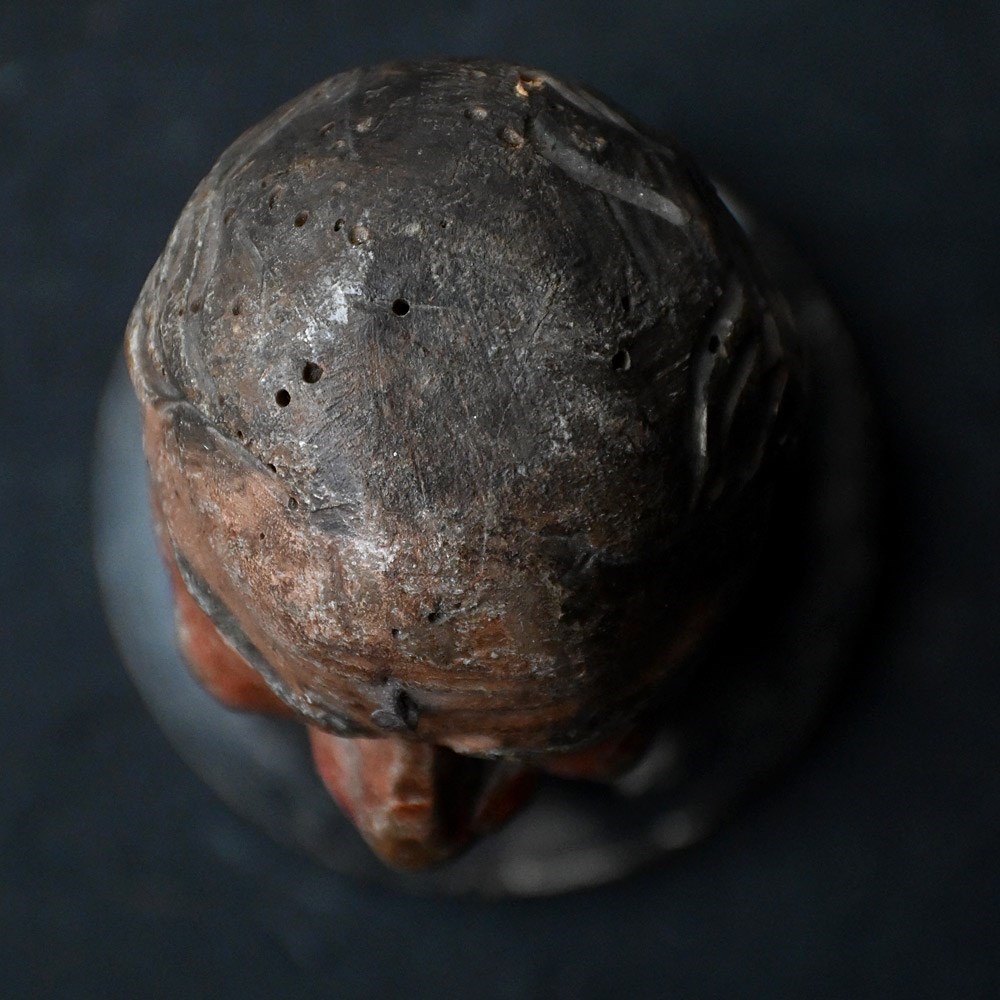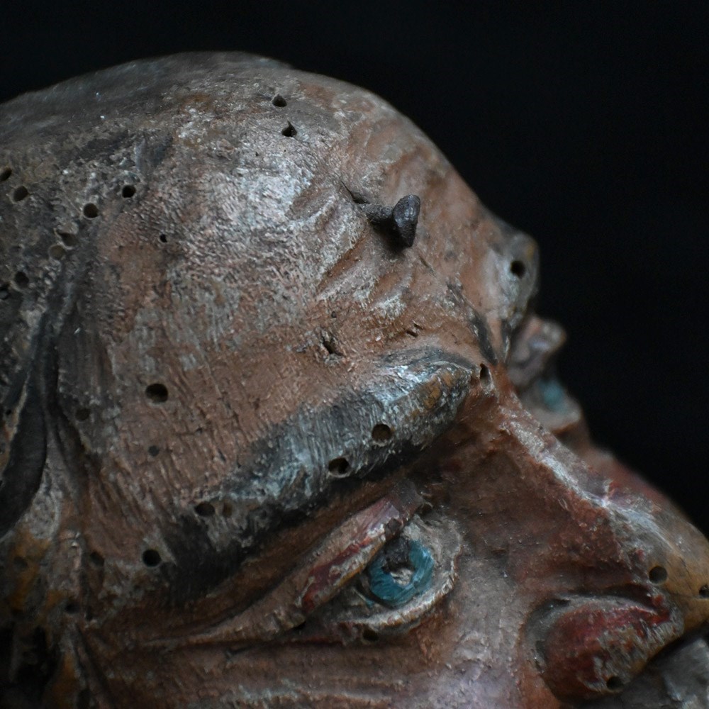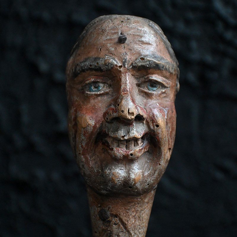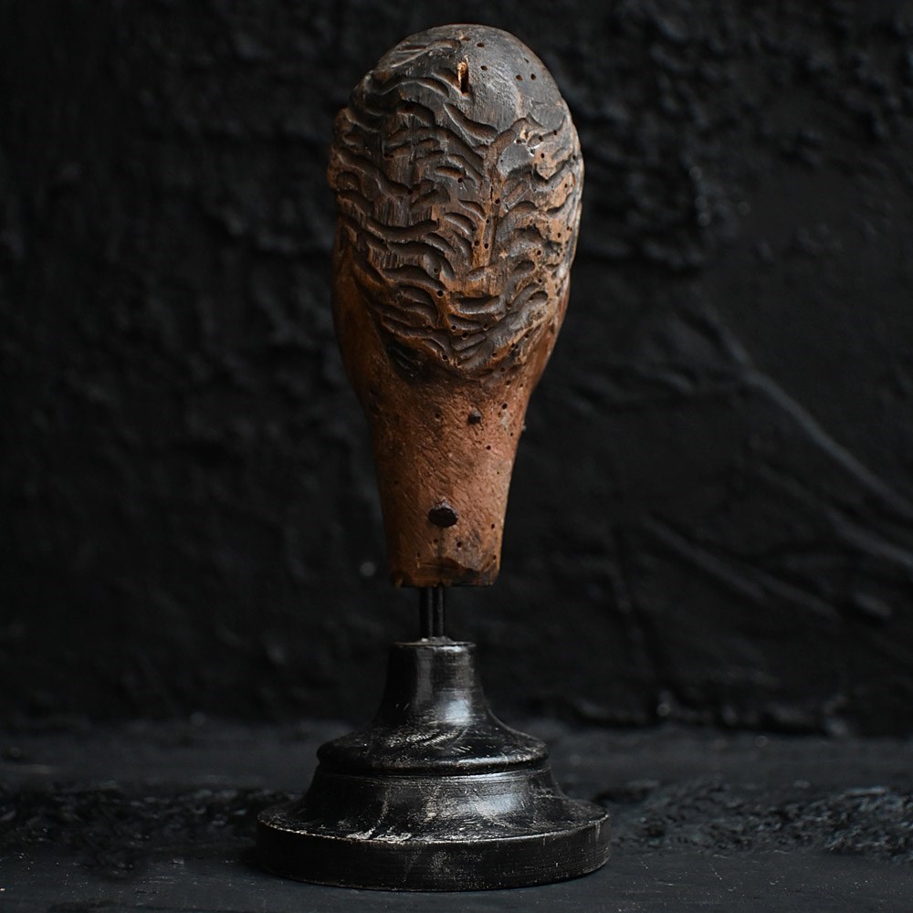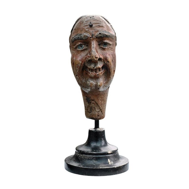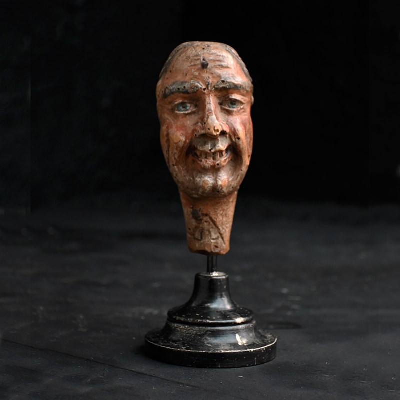 A charming and authentic example of an early 20th Century English hand carved puppet head made from pine wood. With hand painted detail and old supporting nails to which his clothing may have been attached at some point. This item comes with a bespoke ebonised stand.