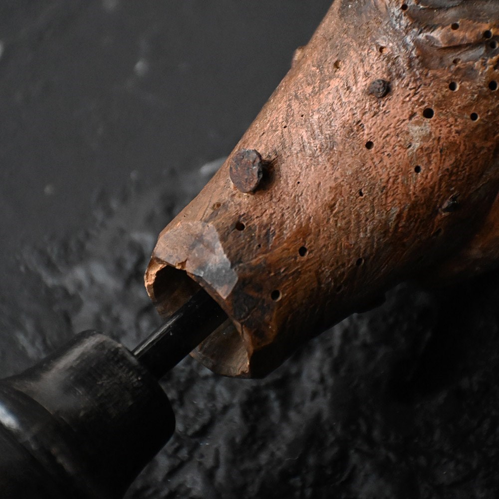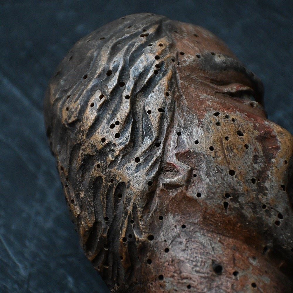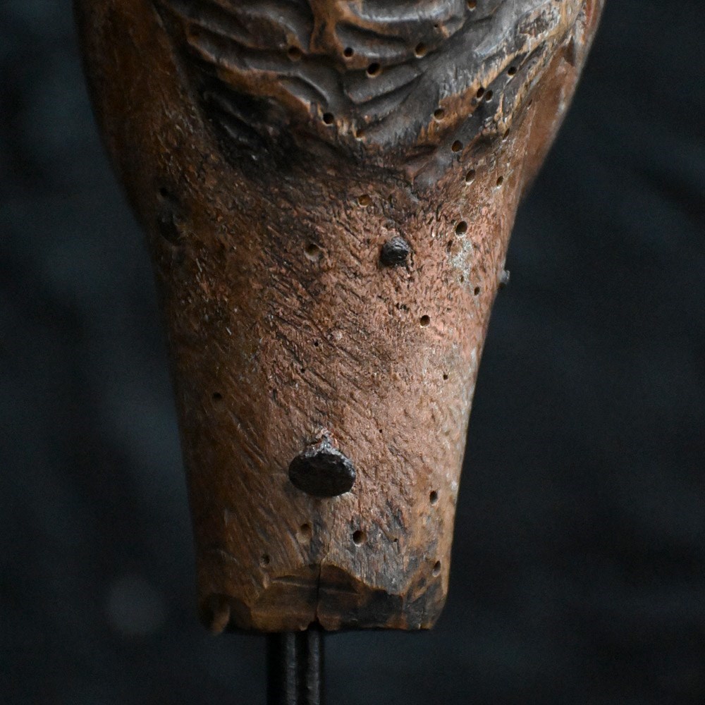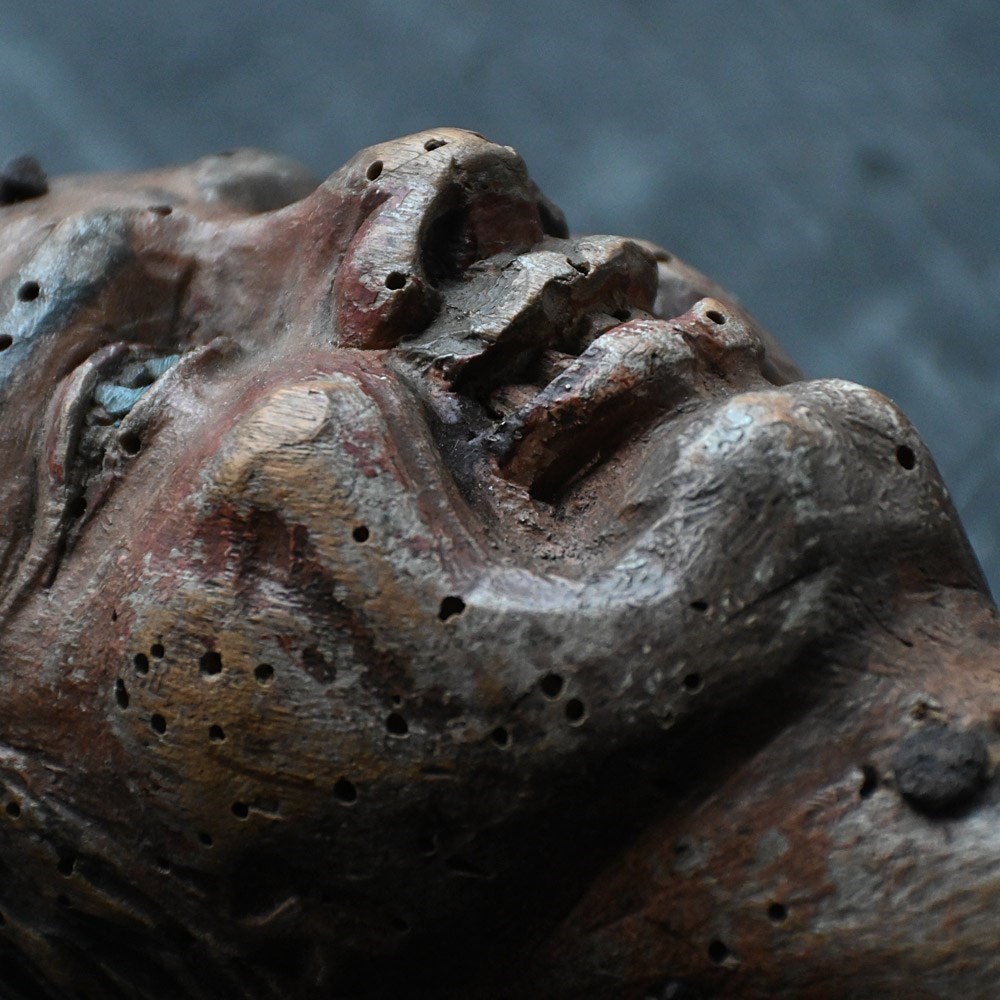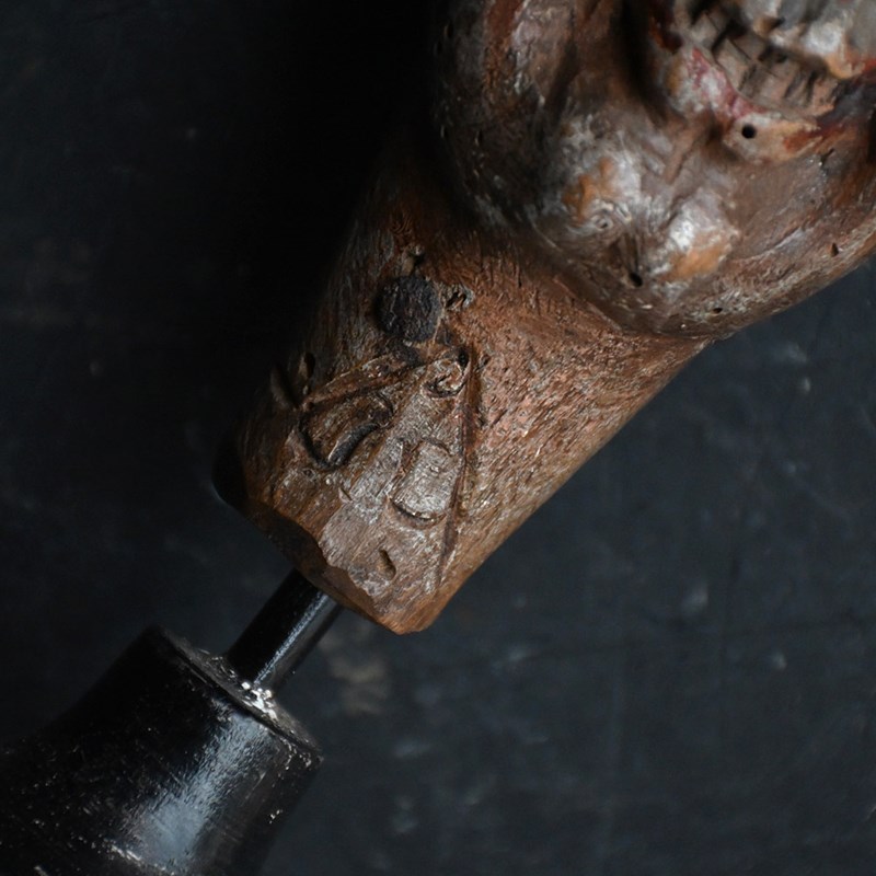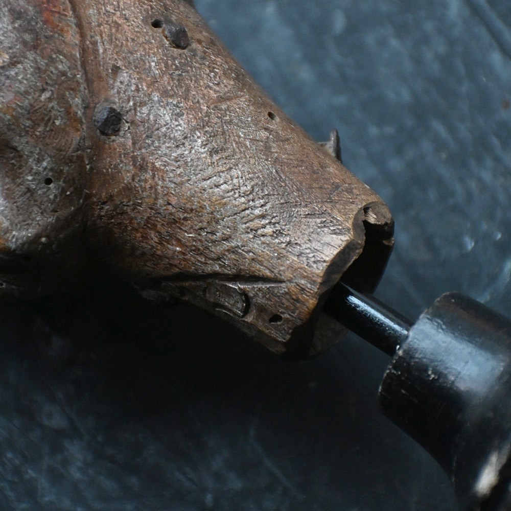 A charming and authentic example of an early 20th Century English hand carved puppet head made from pine wood. With hand painted detail and old supporting nails to which his clothing may have been attached at some point. This item comes with a bespoke ebonised stand.