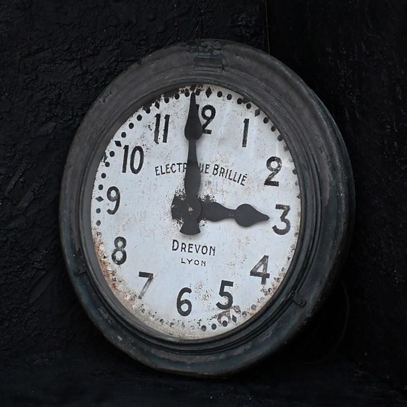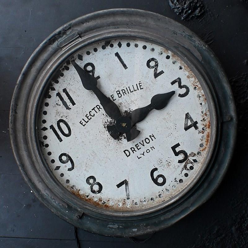 This highly decorative untouched French wall mounted station clock has recently been fitting with a new 240v motor mains power source. With adjustable brass hand movement toggle at its base. Its original hanging brackets, Hands, glass facia, and aged painted surface still in place and in original condition. Obtained from the trade in the south of France last month. This clock weighs roughly 15kg and would make a great piece of functional wall décor in our humble opinion.