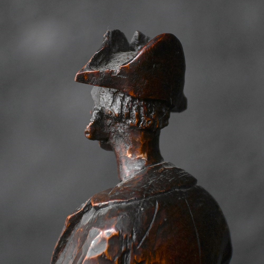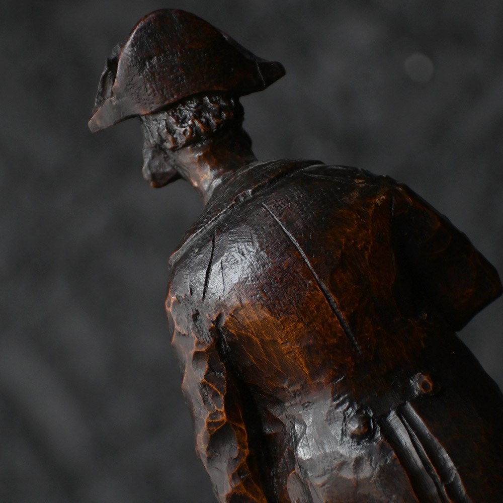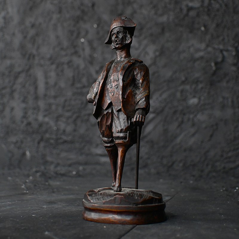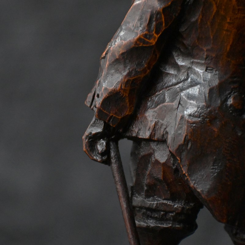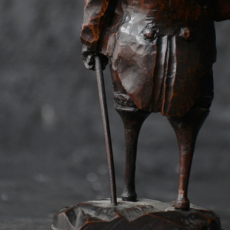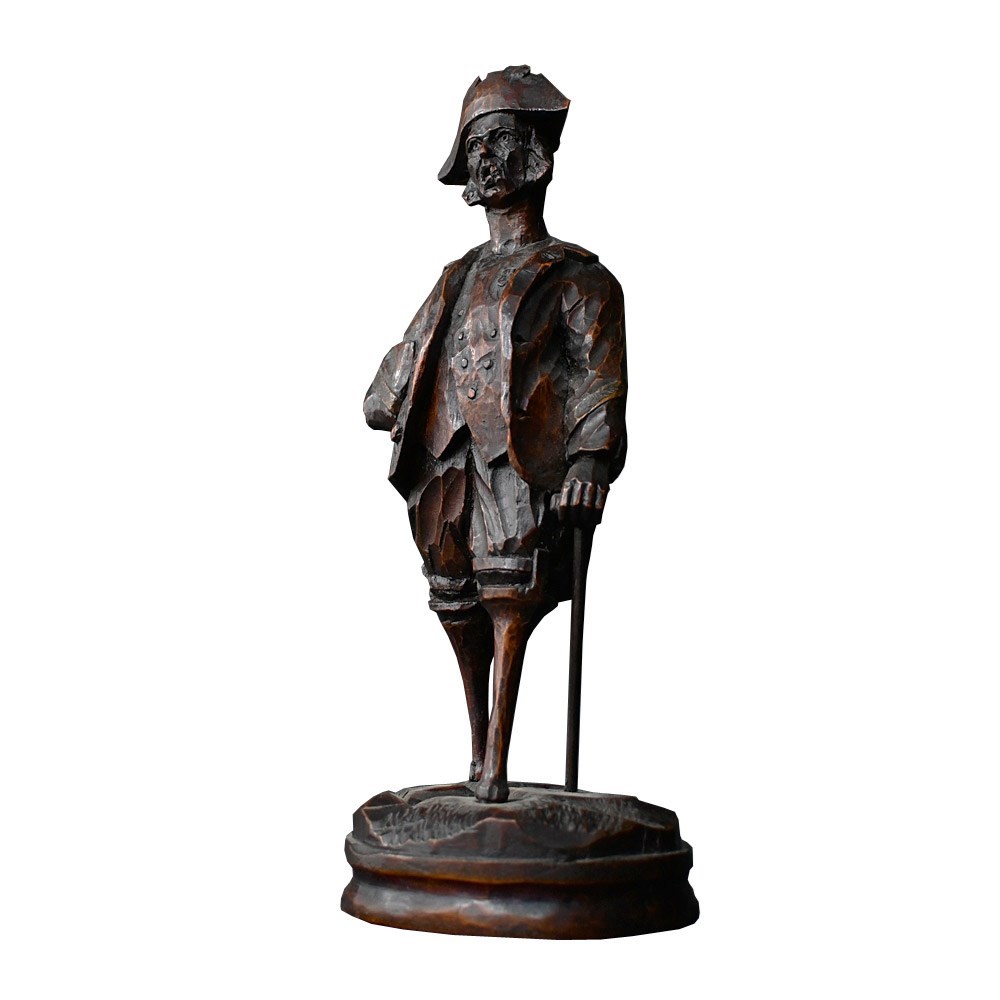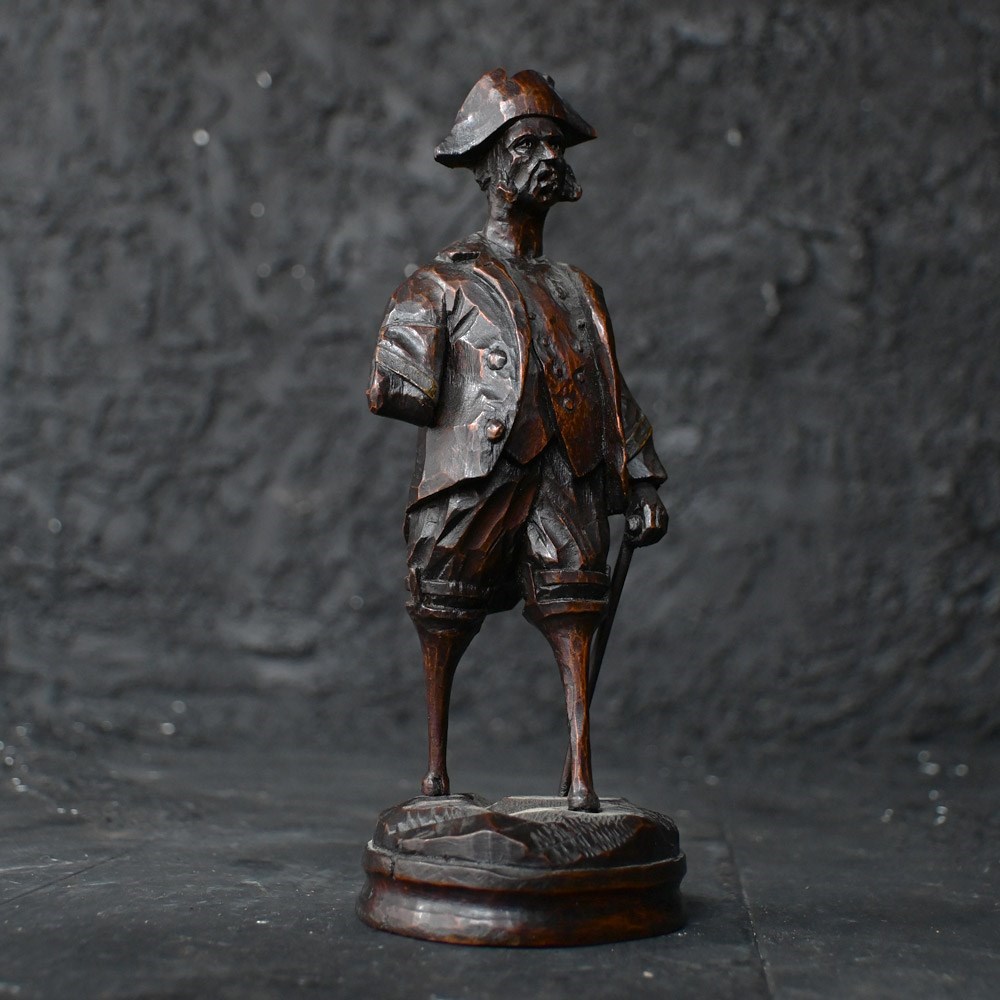 An unusual object to say the least, a well detailed hand carved wooden figure in the form of a pirate / sailor. Quite an unfortunate soul who is missing both legs and one arm. Holding a cane and would have once been smoking a pipe of sorts.