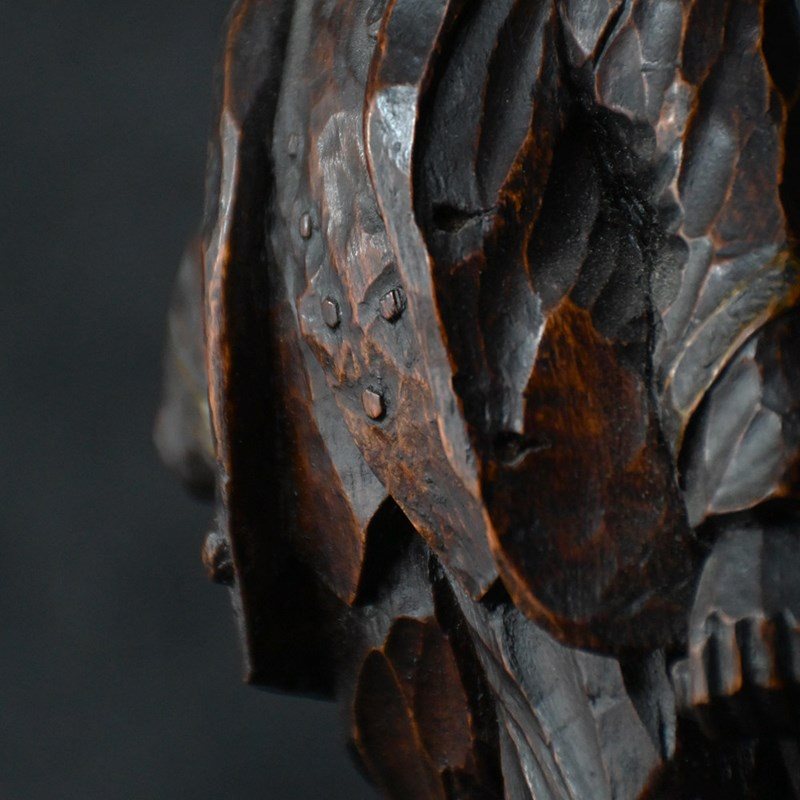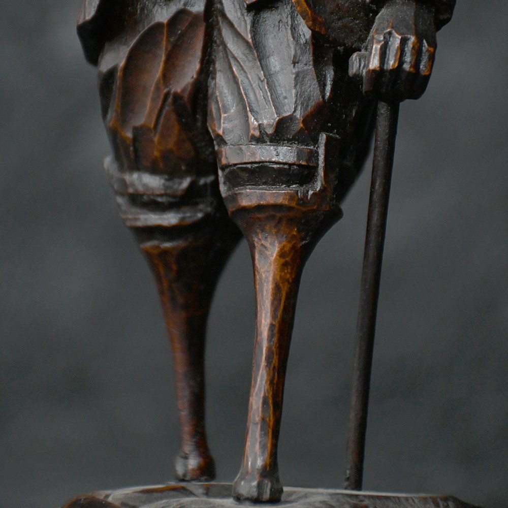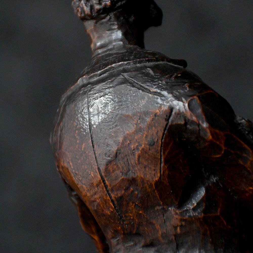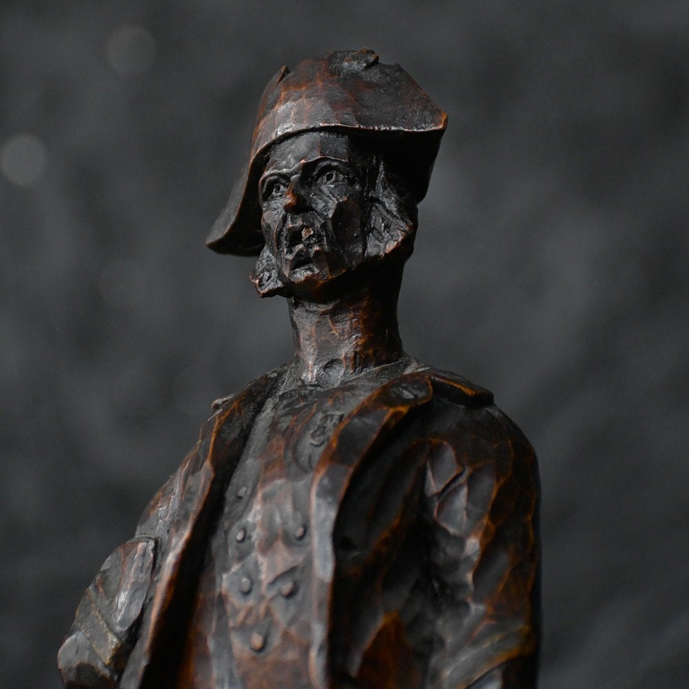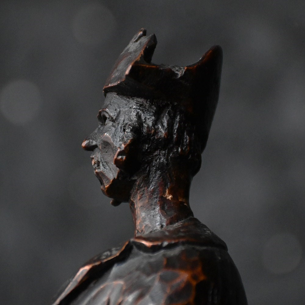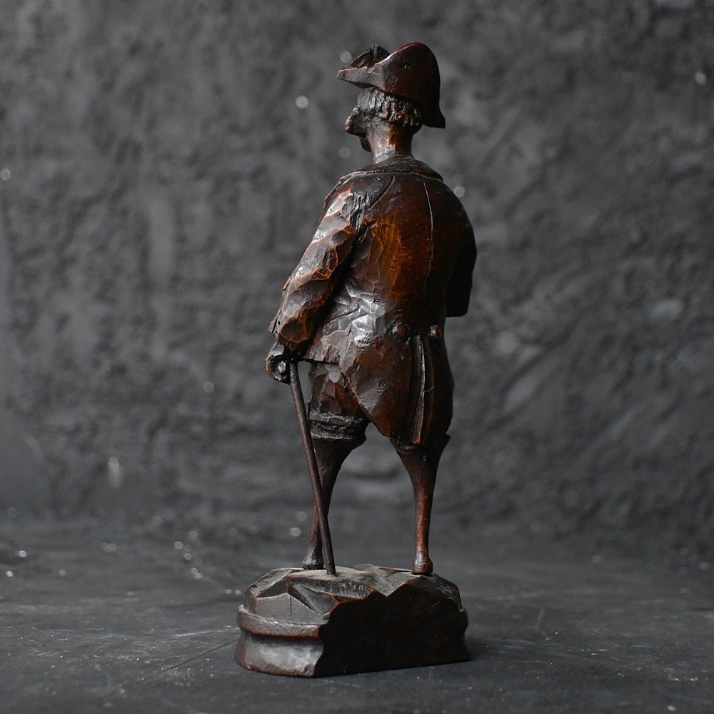 An unusual object to say the least, a well detailed hand carved wooden figure in the form of a pirate / sailor. Quite an unfortunate soul who is missing both legs and one arm. Holding a cane and would have once been smoking a pipe of sorts.
