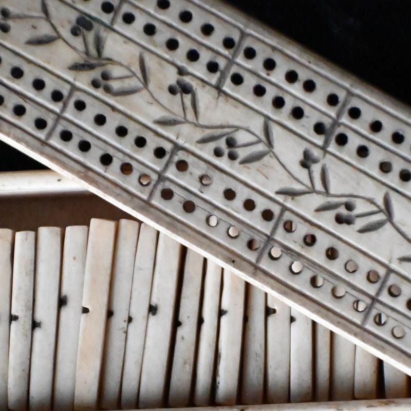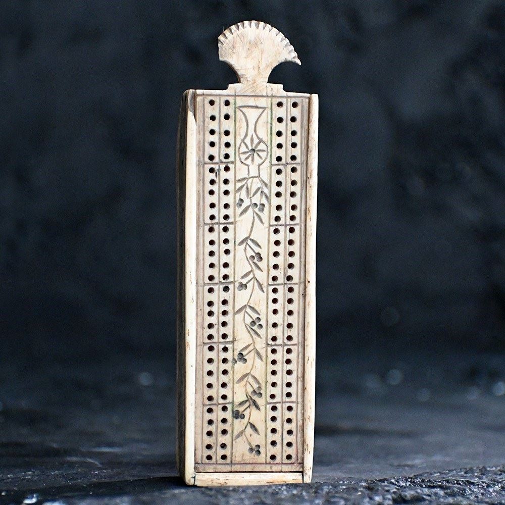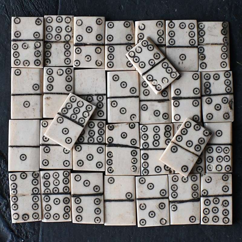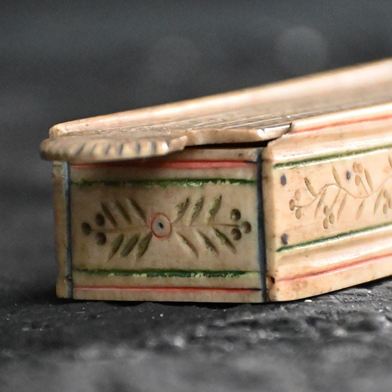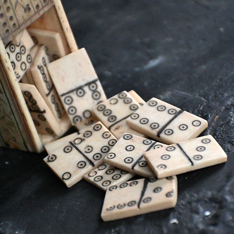A good example of a late 19th Century Napoleonic prisoner of war (POW) hand carved set of 31 dominos, in a sliding painted lid box. Made from mutton bone showing etched hand carved detail with original dye paint design. These pieces were made by captive prisoners of war to help pay for food and necessities and show great skill and craftsmanship. Size of box in inches: H 5.5” x W 2.5” x D 1” (31 Dominos) Condition: Aged Completely solid in structure, faded in all areas with aged surface as shown. The top of the shell design is missing a section as shown. The bone is aged naturally.