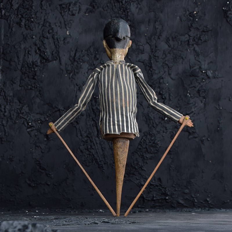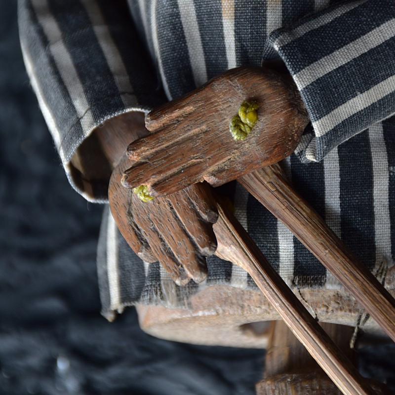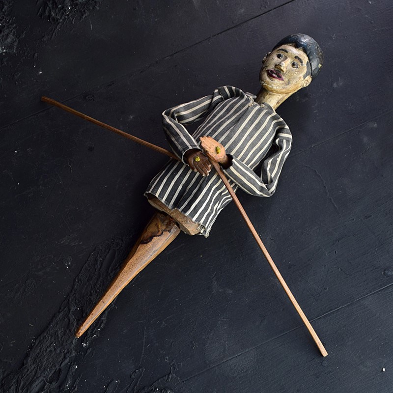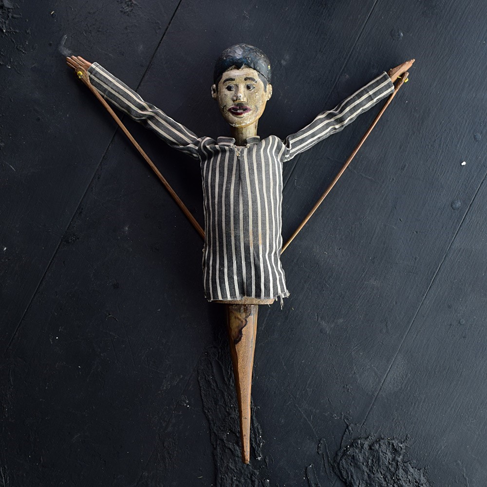 We share what we love, and we love this early 20th century articulated folk art puppet figure. Made from hand carved pin, The base (handle) moves up and down to animate the puppets head. Arms are moved with the sticks. Original linen clothes which resemble a prisoner’s attire. A delightful piece of English folk art entertainment, which is highly tactile and naïve in composition.