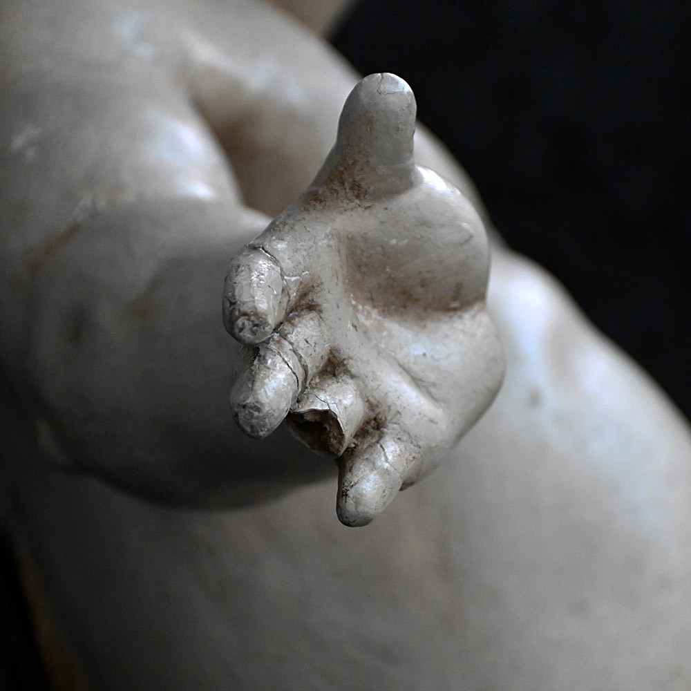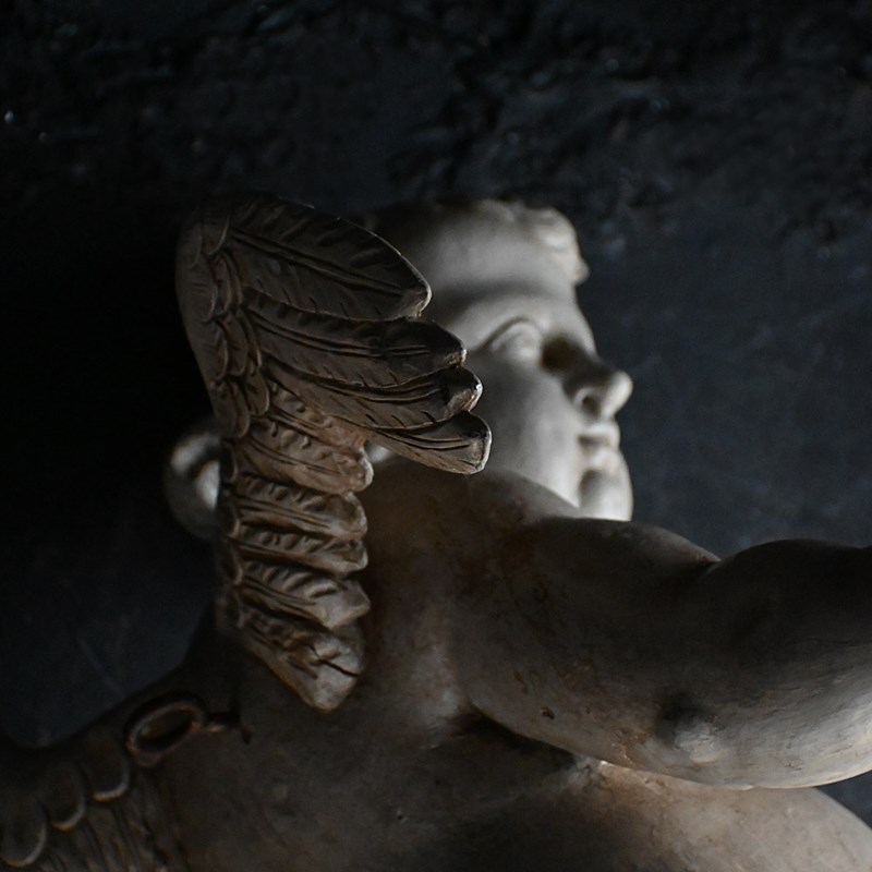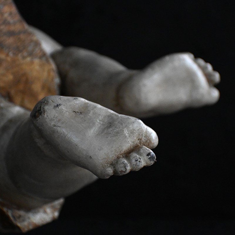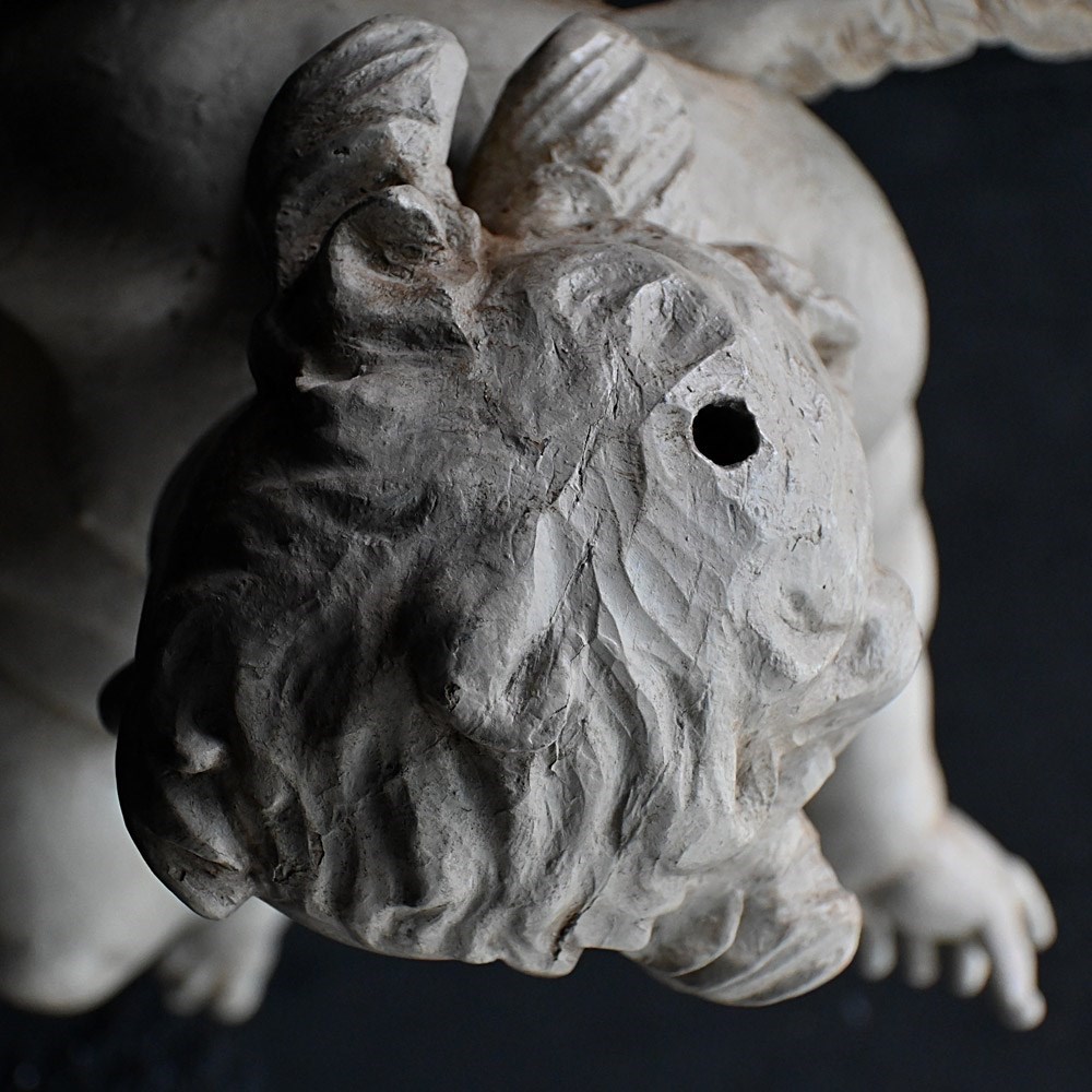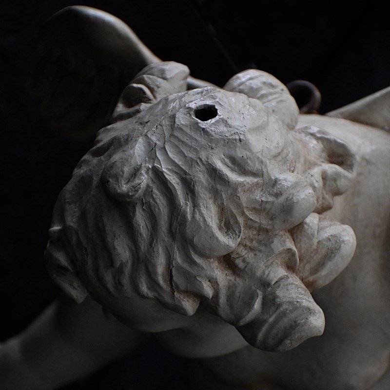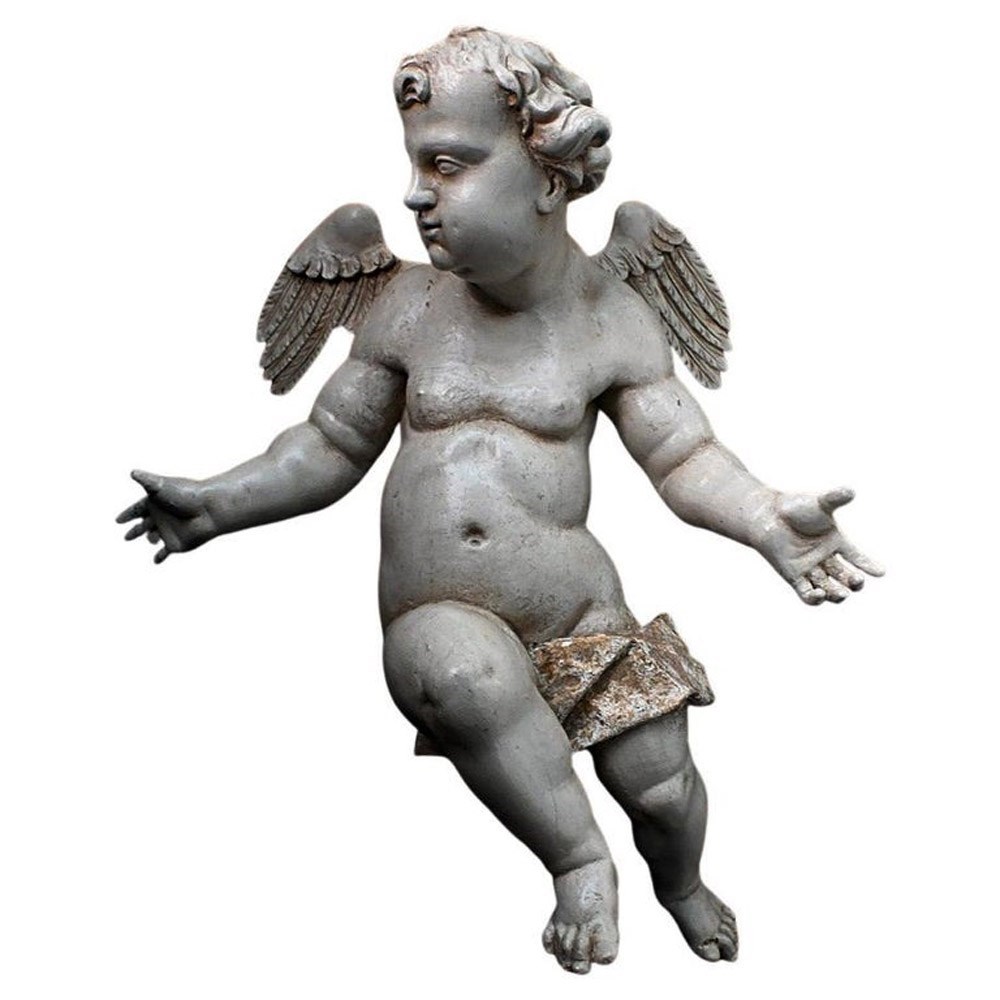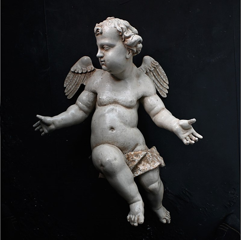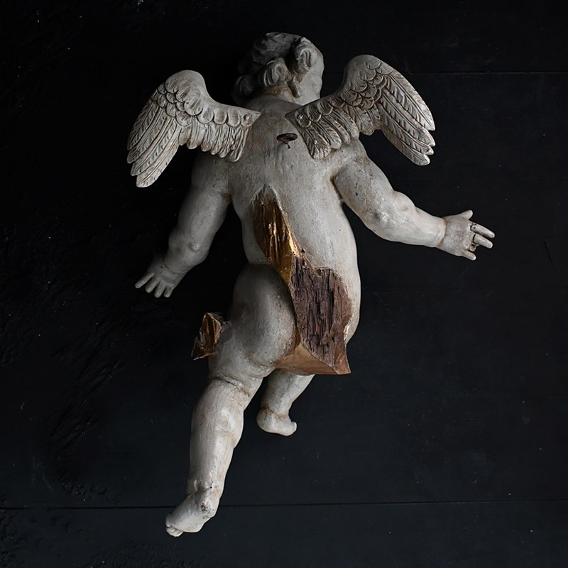 A stunning example of a late 18th Century hand carved pine large cherub figure. Still covered in its original painted surface. This item doesn’t stand alone but with hanging hook in place.
