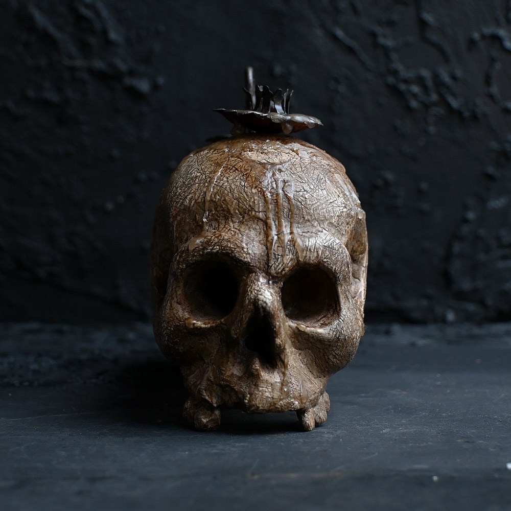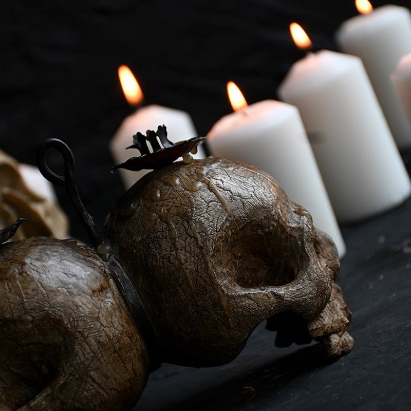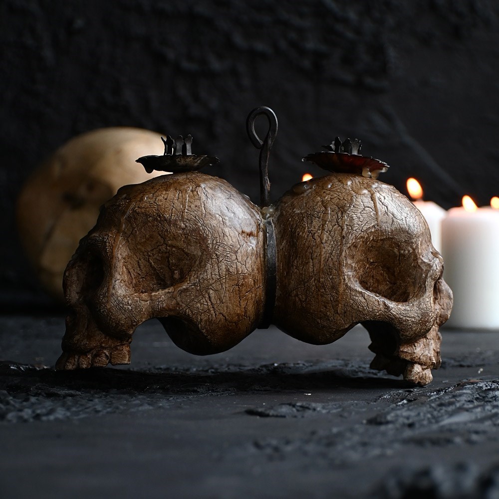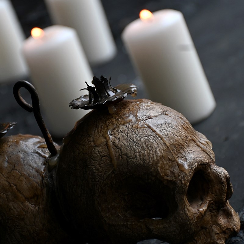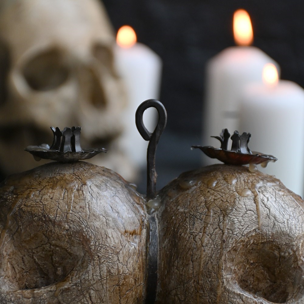 In overall very presentable condition considering its age and use, without breaks or loss. Sections of the metal candle holders and top of the skulls are covered in old candle wax as shown which we have not removed as feel it adds to the look. This item can still be hung as first intended.
