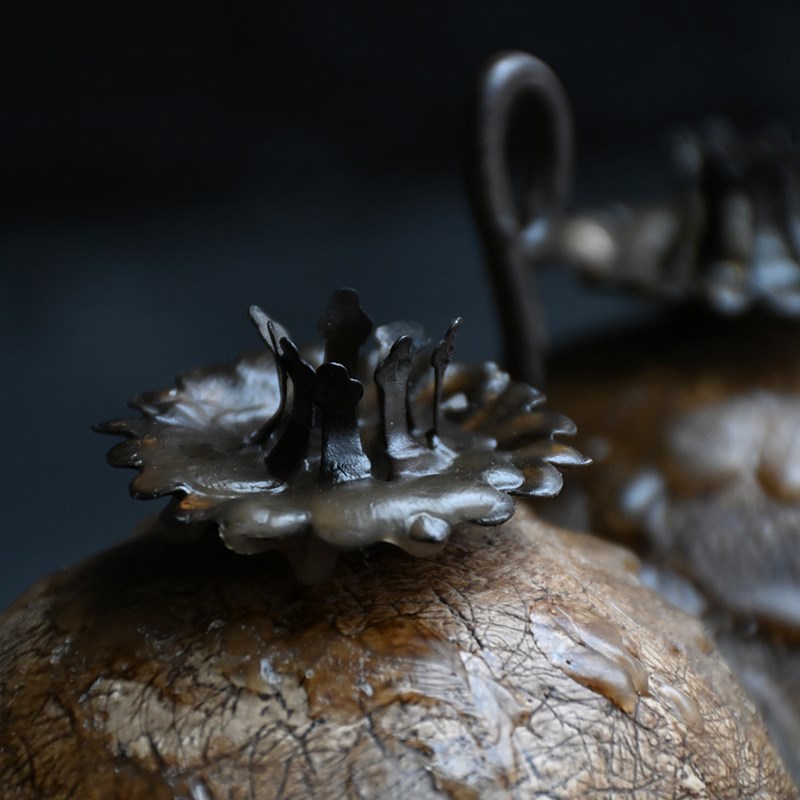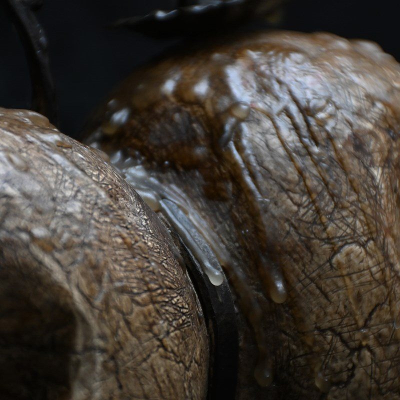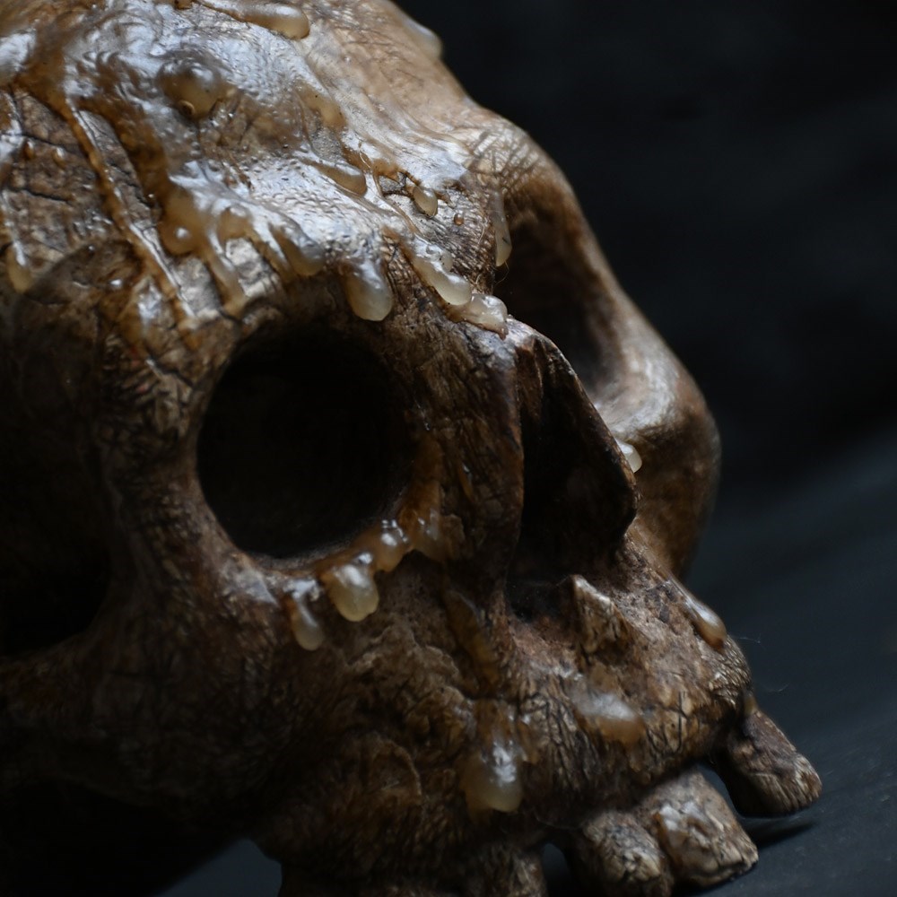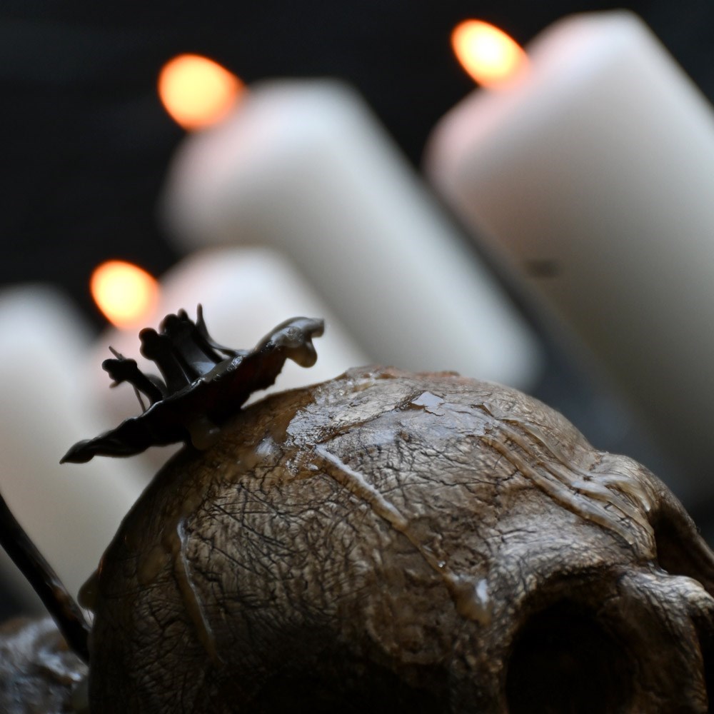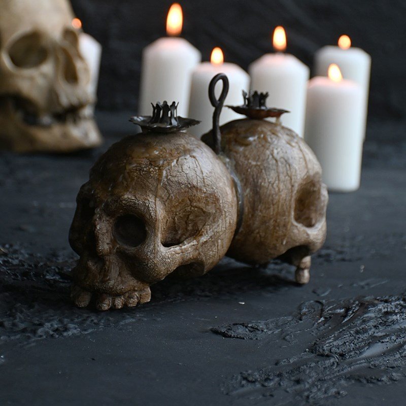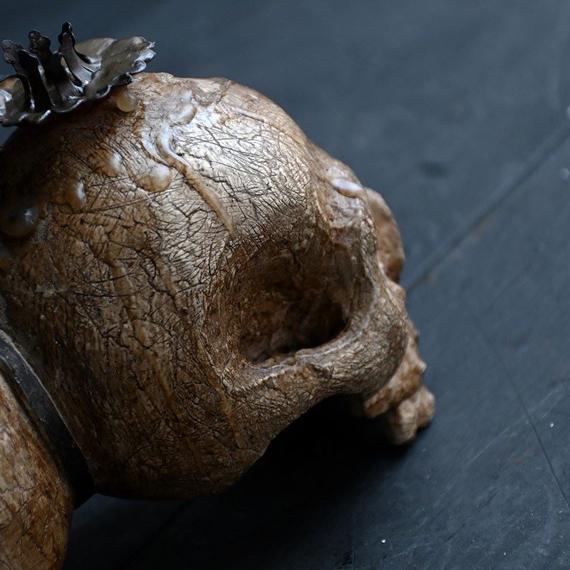 In overall very presentable condition considering its age and use, without breaks or loss. Sections of the metal candle holders and top of the skulls are covered in old candle wax as shown which we have not removed as feel it adds to the look. This item can still be hung as first intended.