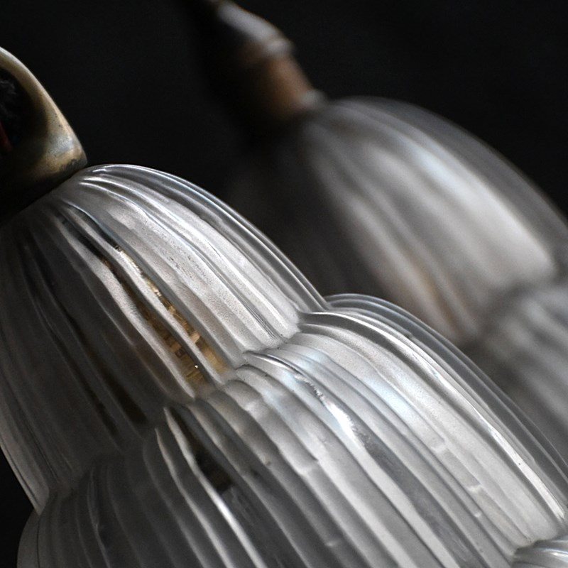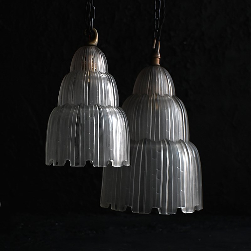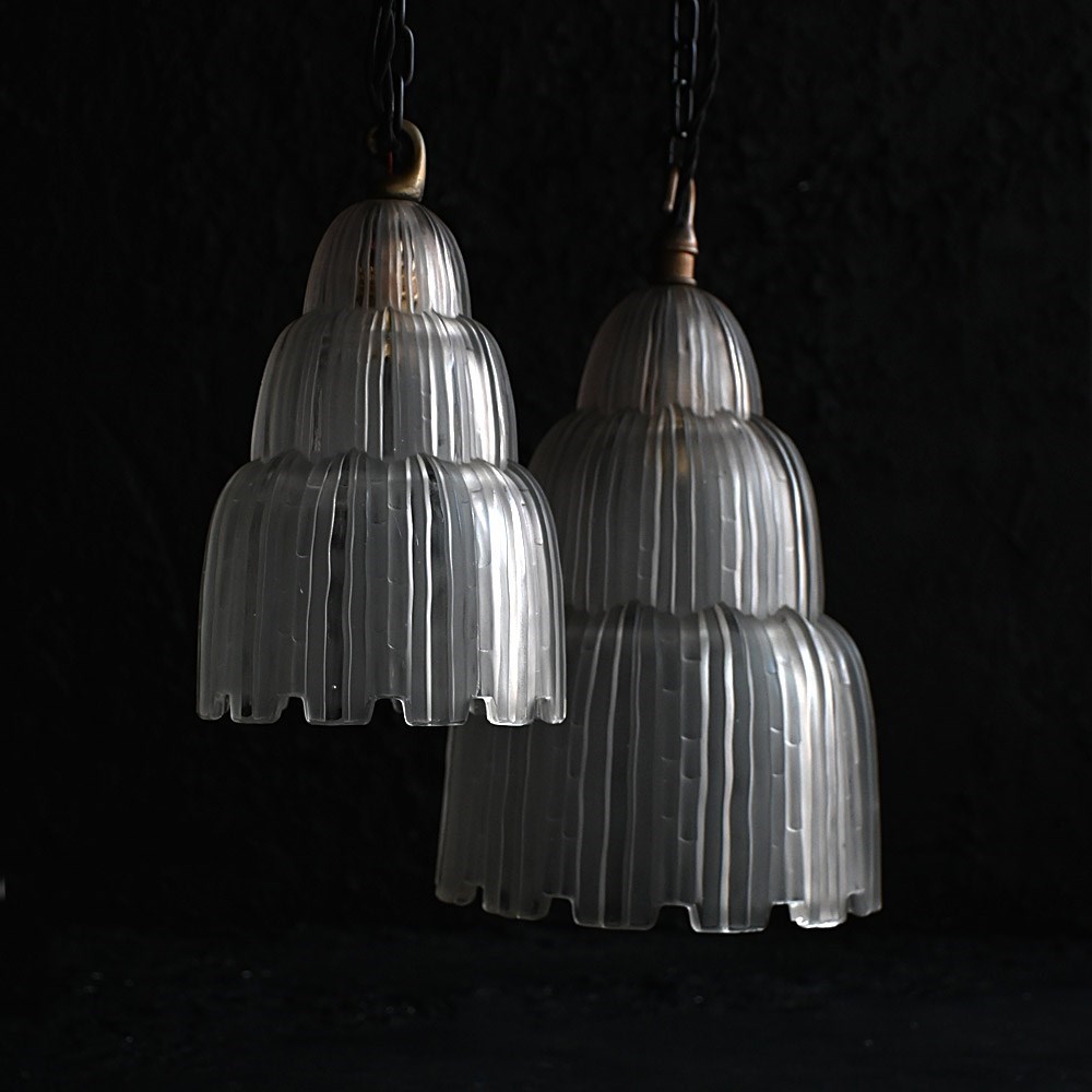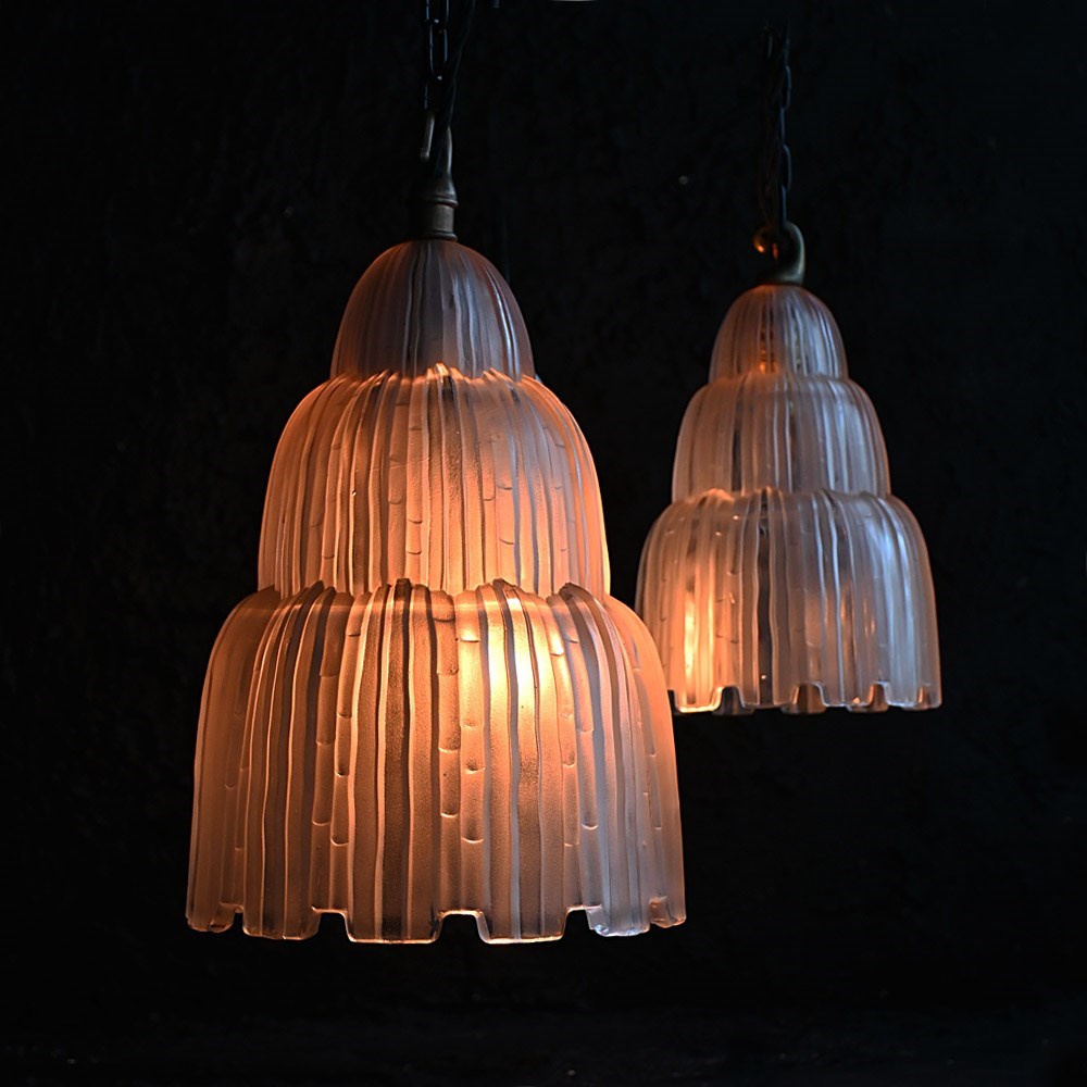 A highly decorative and rare example of two 1930s Sabino waterfall hanging lights with brass hanging hooks. These lights are not wired but can be to your specification. Without hanging chains also, with a delightful warm glow as shown.